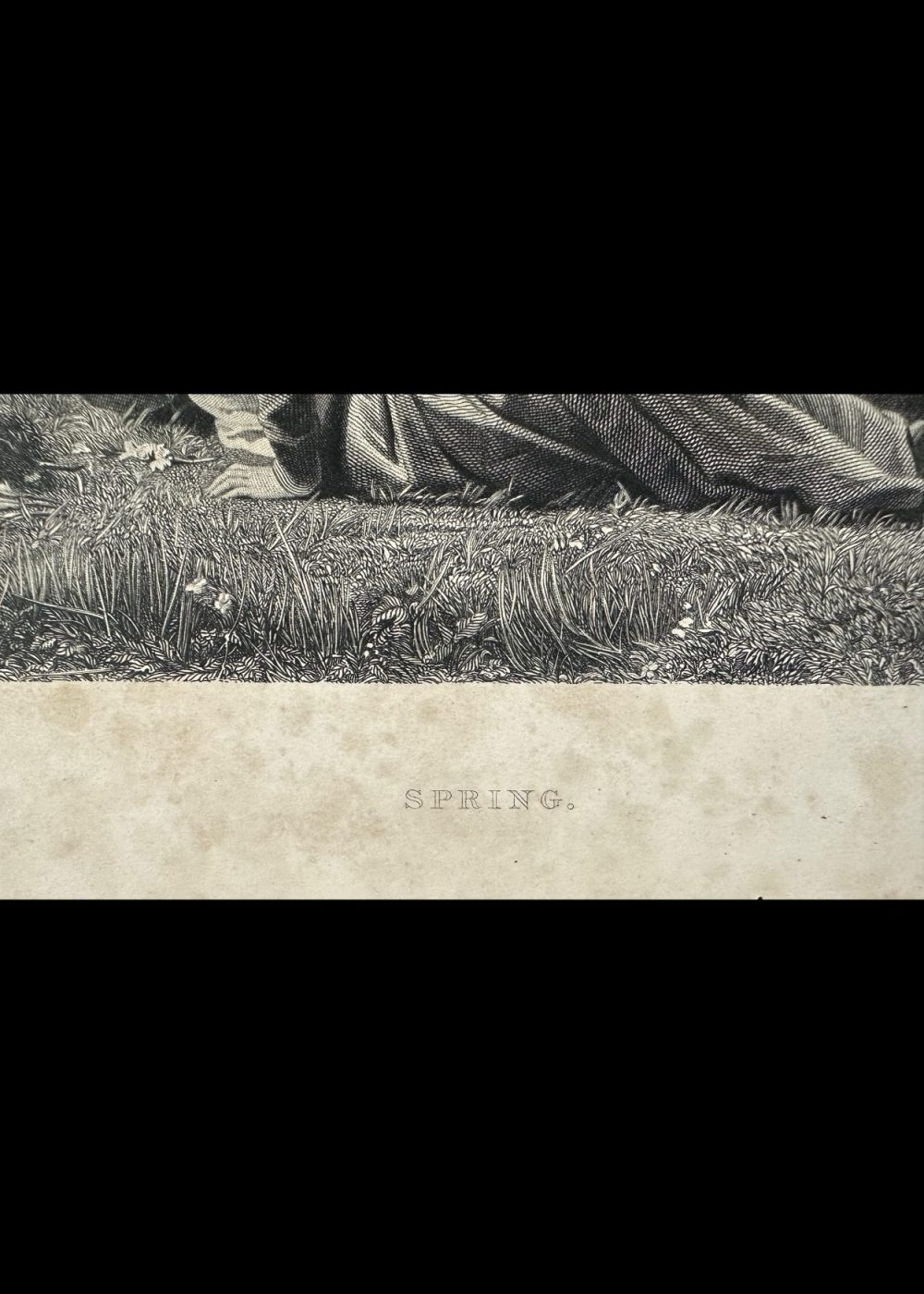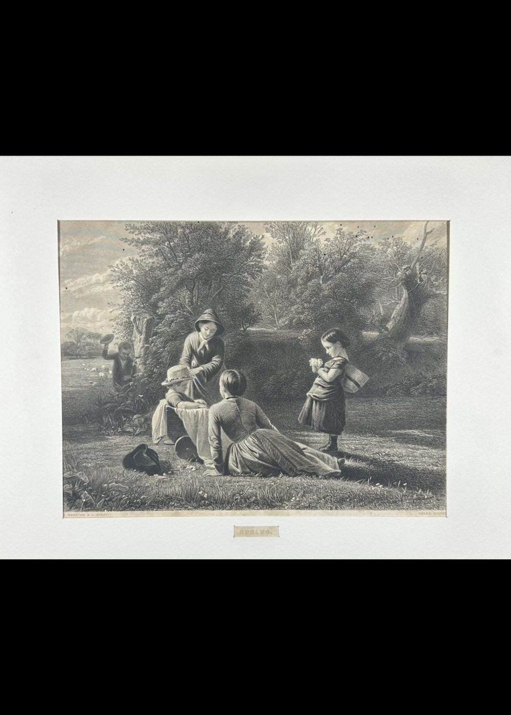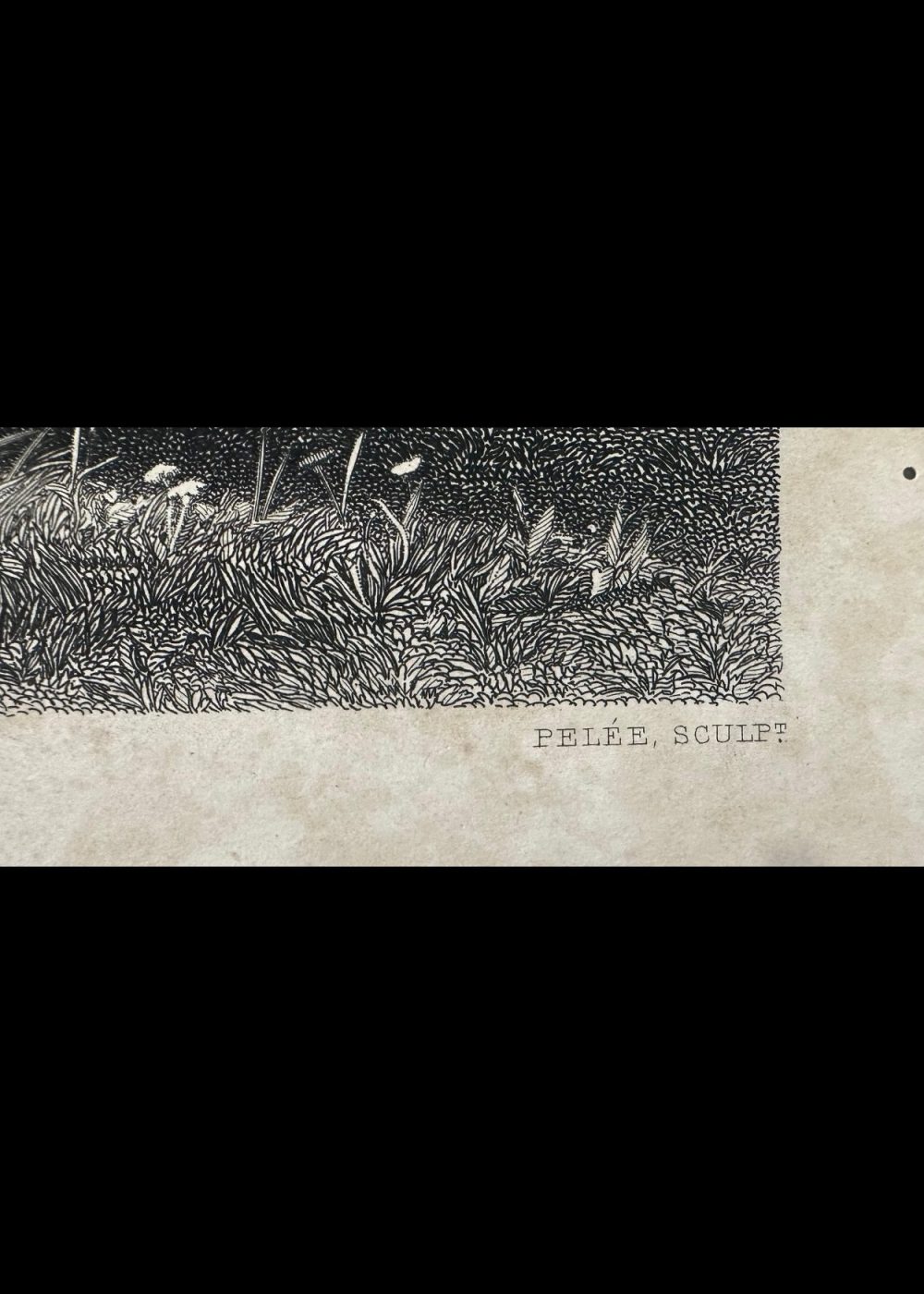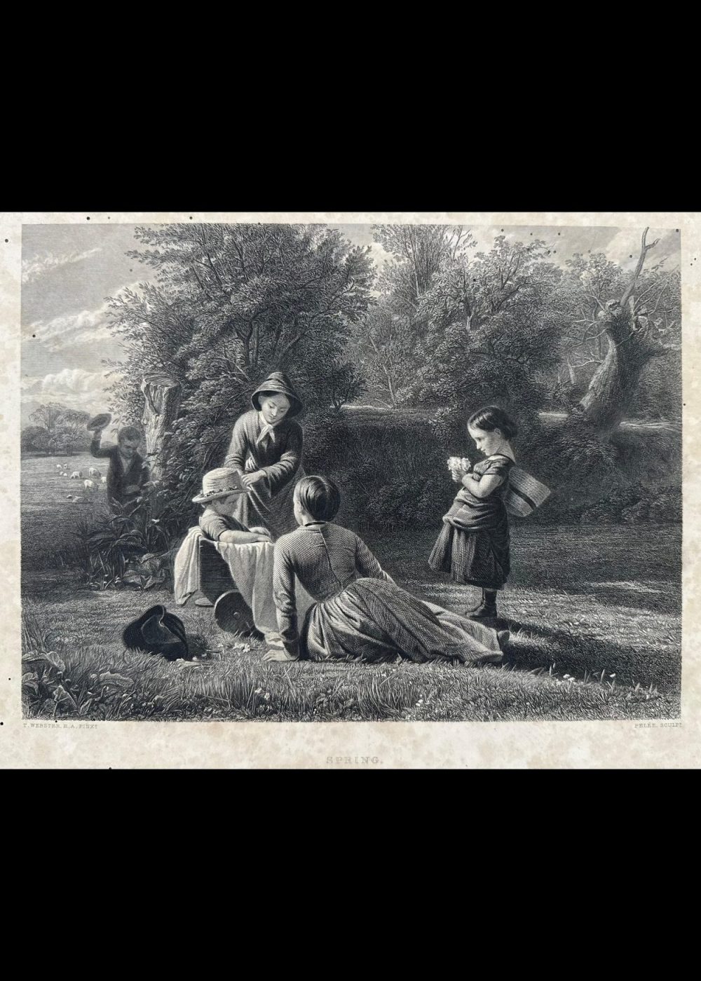 Thomas Webster’s Shelling, delicately engraved by Pierre Pelee, captures a tranquil rural moment that reflects the simplicity and harmony of pastoral life in the 19th century. Set against a peaceful wooded backdrop, the scene features a small group of women and a child engaged in the humble task of shelling peas outdoors. In the foreground, one woman reclines on the grass with her back to the viewer, forming a relaxed triangular composition with the other two women — one seated and the other standing, focused on their shared chore. A young girl, perhaps their daughter or helper, stands nearby holding a small container, watching attentively or offering assistance. Scattered tools and a hat on the ground lend realism and spontaneity to the moment. The lush countryside, with sheep grazing in the distance and a man partially visible behind a tree, enhances the pastoral serenity of the image. Light and shadow are used to soft effect, conveying warmth, community, and a rhythm of life attuned to nature’s pace. Shelling is a fine example of Webster’s ability to elevate everyday domestic scenes into art filled with grace and sentiment. It celebrates rural labor not as drudgery, but as an intimate and collaborative act, full of quiet dignity.