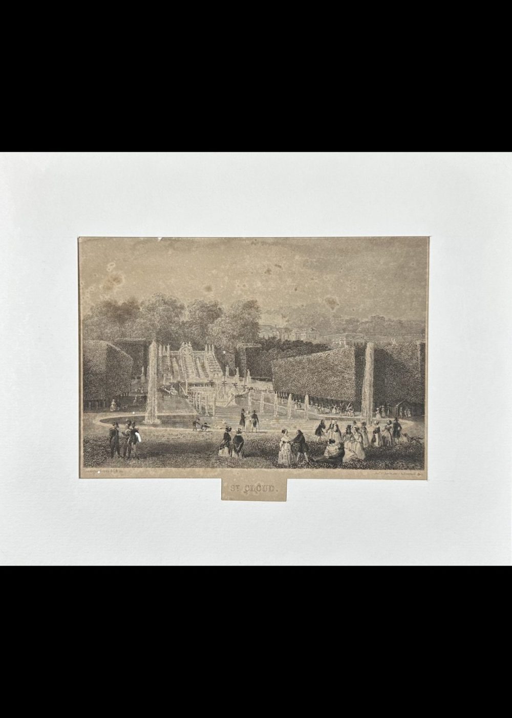 This elegant engraving offers a detailed and atmospheric view of the famed gardens at Saint-Cloud, once the site of the Château de Saint-Cloud, a royal residence west of Paris. The scene is alive with ornamental fountains, manicured hedges, grand staircases, and promenading figures, capturing both the formal beauty of French garden design and the leisurely refinement of 19th-century society. Executed by the Rouargue Frères—renowned for their architectural and topographical works—the composition reflects the precision and romantic sensibility characteristic of mid-19th-century French engraving. The setting, rich in symmetry and classical influence, echoes the landscape traditions established by André Le Nôtre, while the inclusion of fashionable visitors provides a glimpse into contemporary social life. The château, visible in the background, was tragically destroyed during the Franco-Prussian War in 1870, lending this image a sense of historical nostalgia.