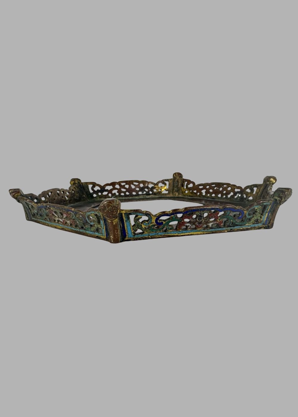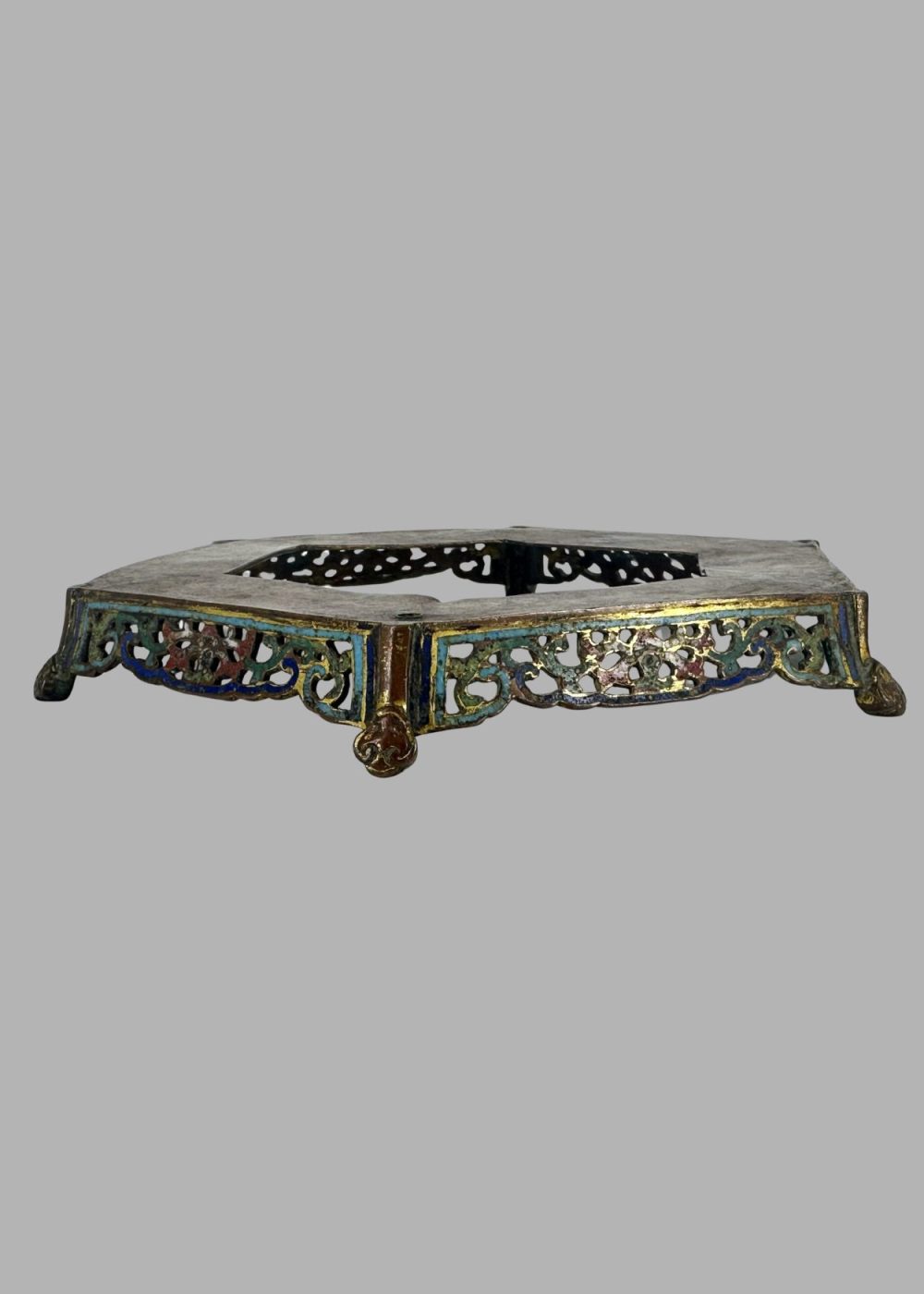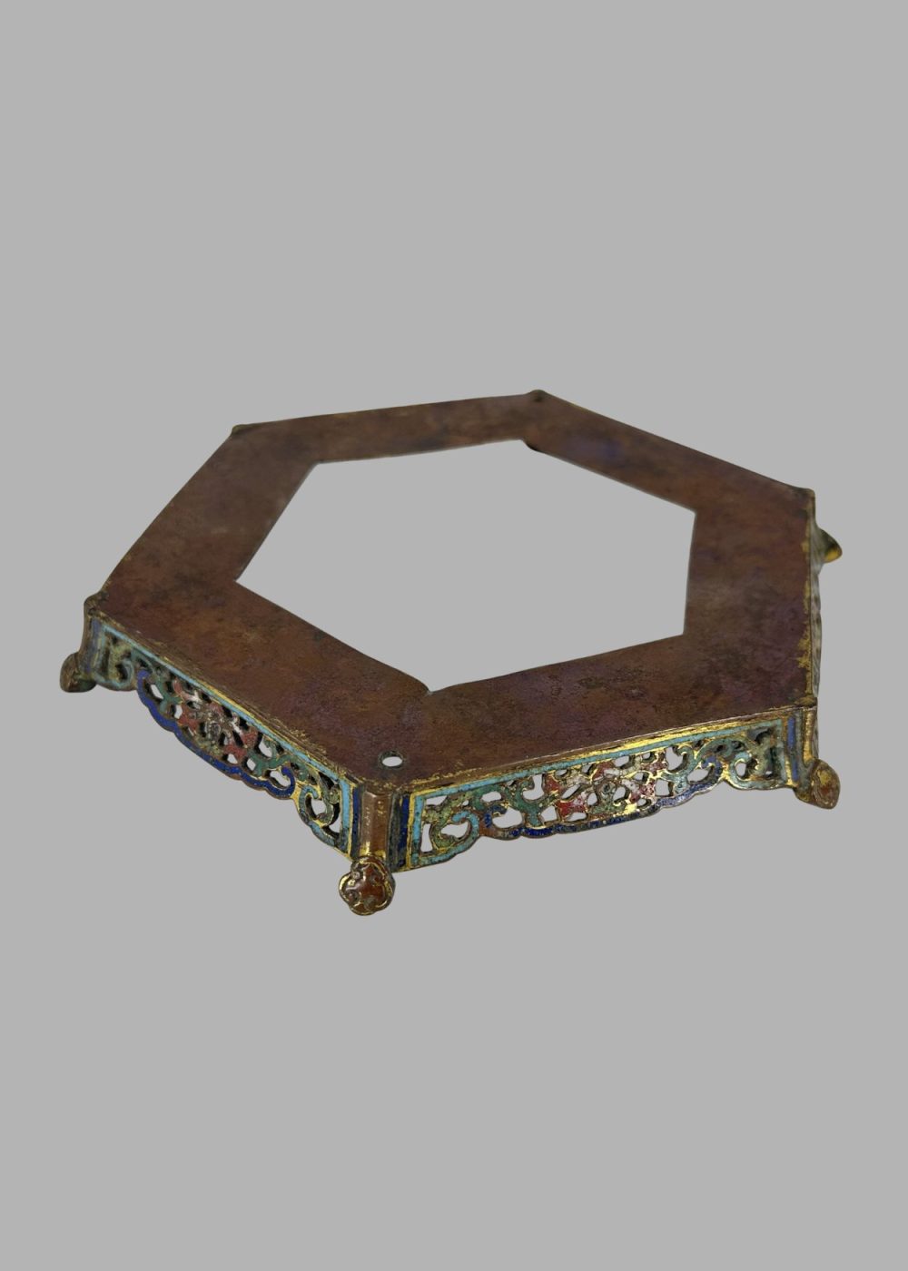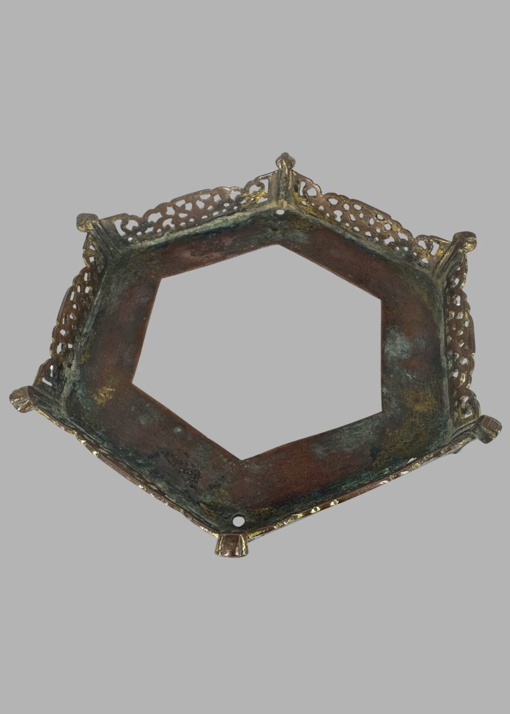 This hexagonal brass stand exemplifies the syncretic artistry of Nepal, where Hindu and Buddhist traditions converged in domestic ritual objects. Each face is adorned with pierced scrollwork and floral motifs framed by bands of colored enamel in deep blue, red, and green. The stand rests on six flared legs and supports a flat platform, likely intended for displaying sacred items or incense burners. A worn patina and fine repoussé detailing suggest prolonged devotional use. The interplay of geometric harmony, metalwork finesse, and chromatic embellishment reflects Nepal’s enduring legacy of spiritual craftsmanship.