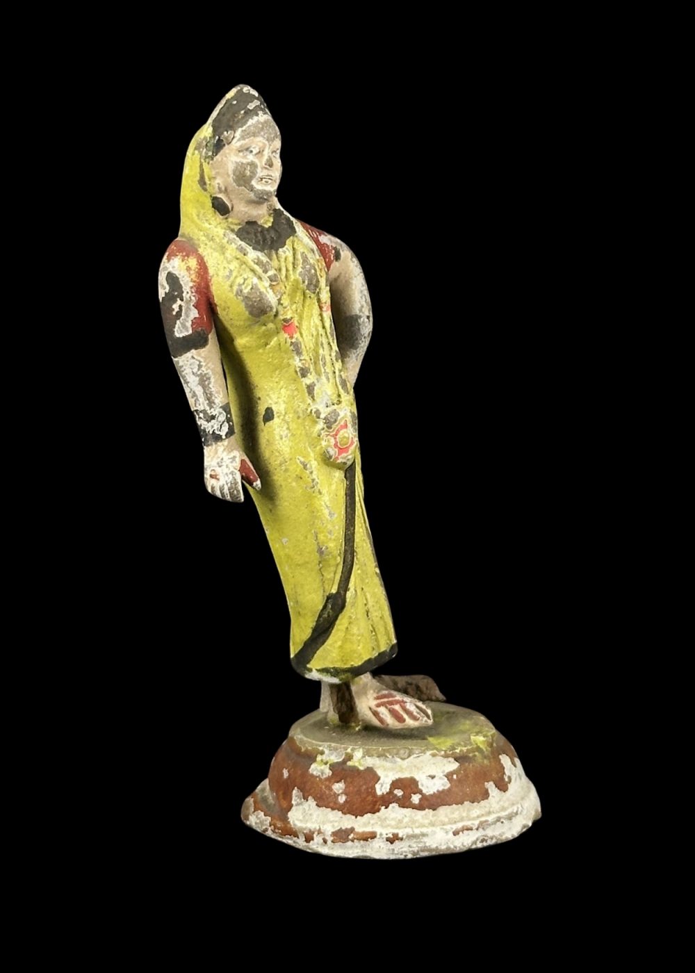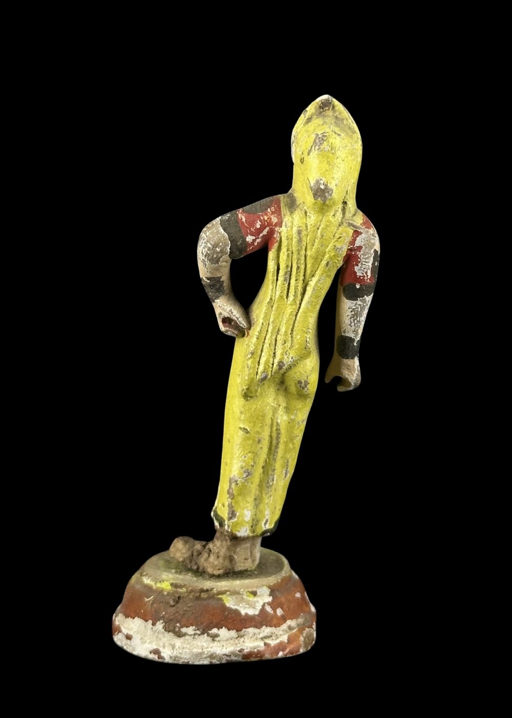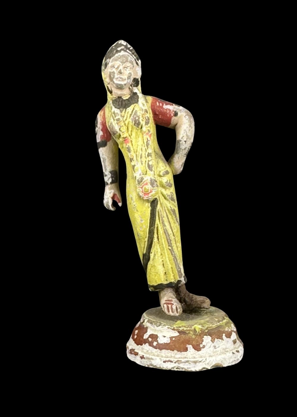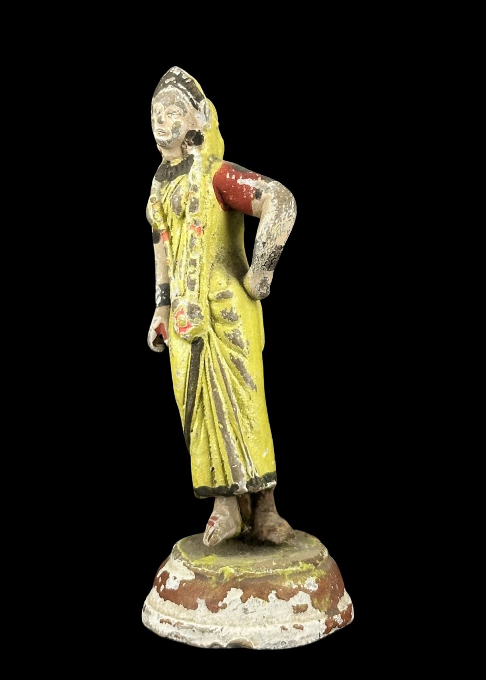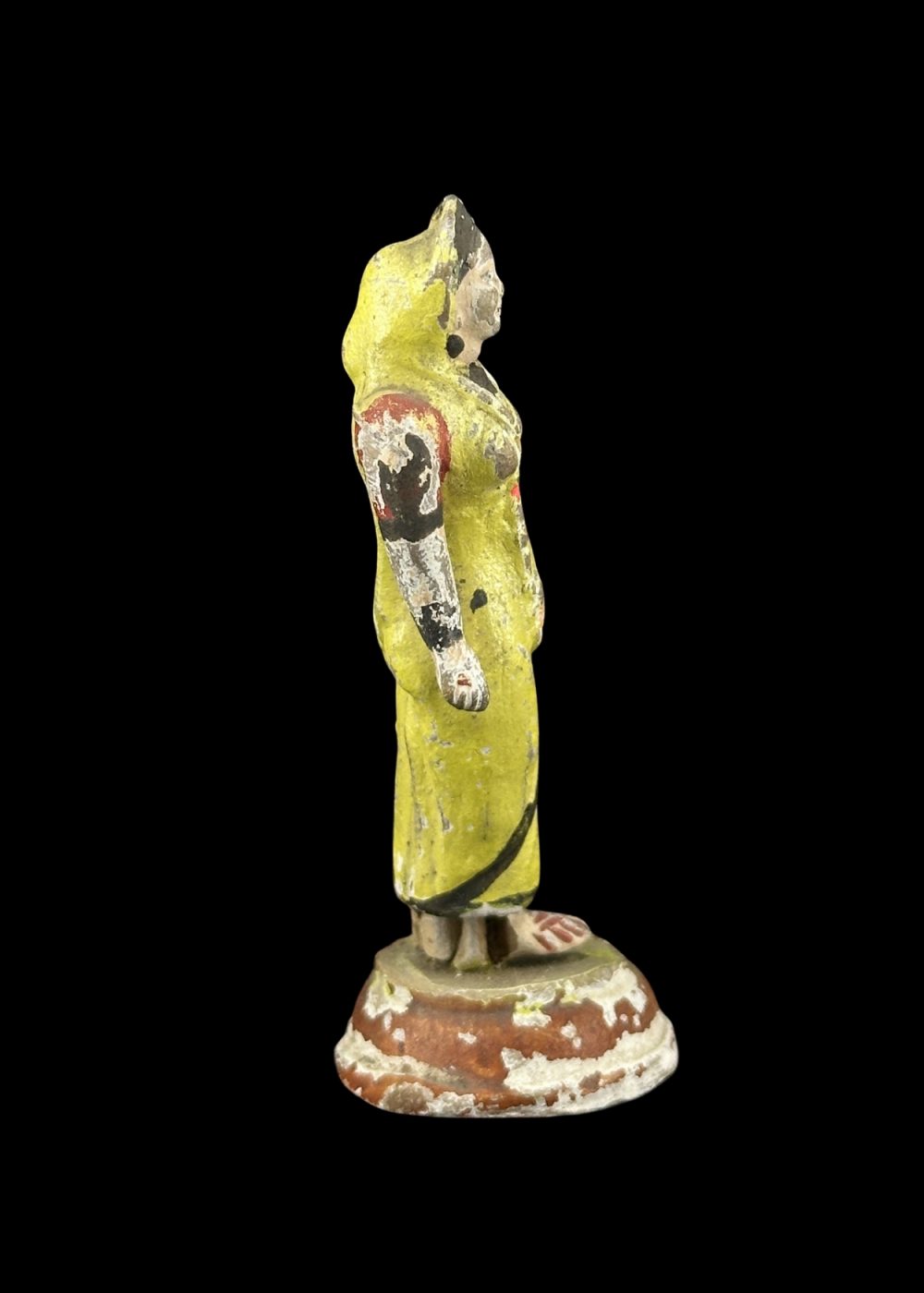 This handcrafted clay figurine from Krishnanagar, West Bengal, features a traditionally dressed village woman in a graceful standing pose, adorned in a vibrant yellow sari with folk-style detailing. Reflecting the 18th–19th century artistic tradition of the region, the figure showcases the expressive realism and charm typical of Krishnanagar clay work. With its weathered finish, it makes a perfect collectible for lovers of vintage Indian art and culture.