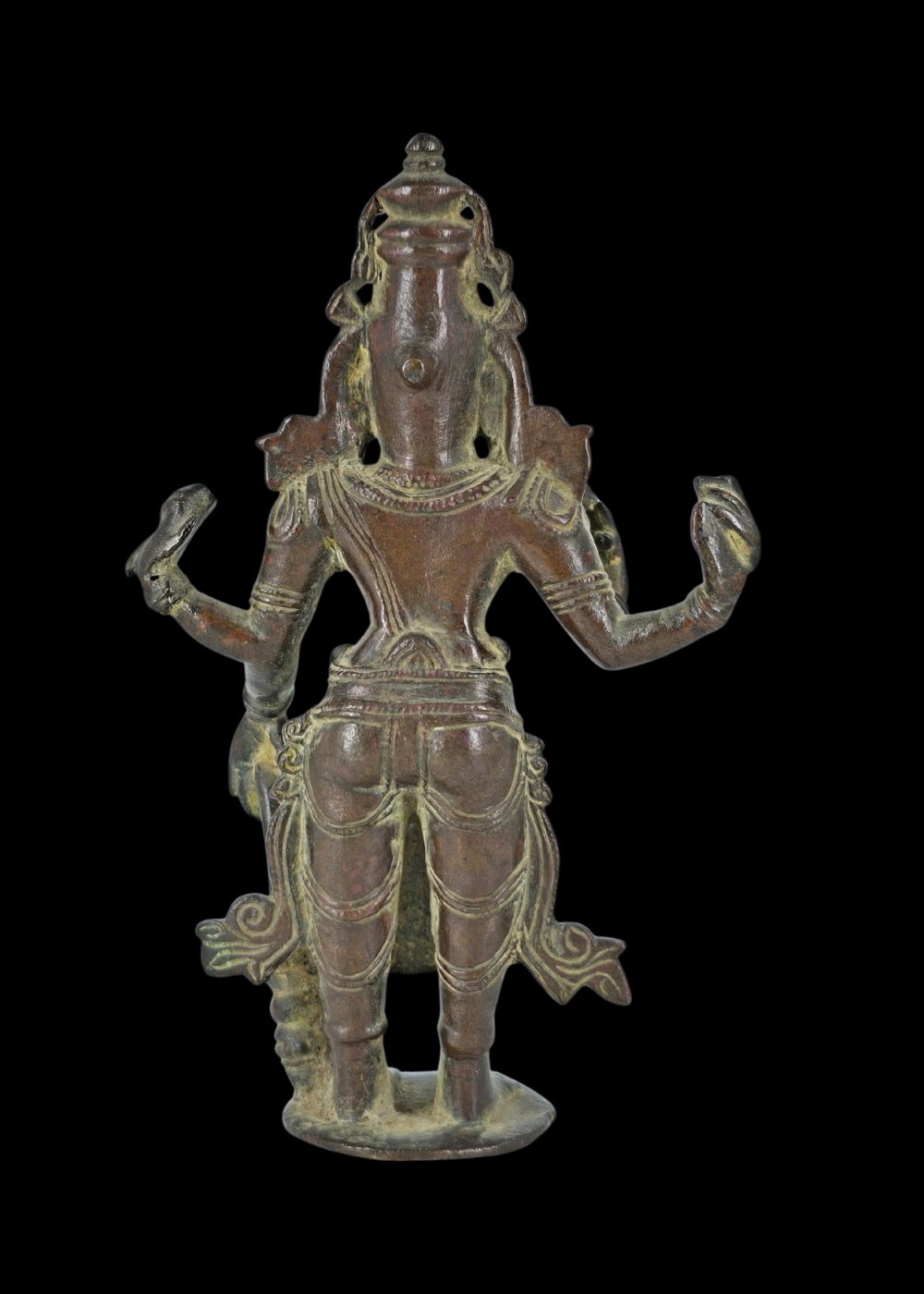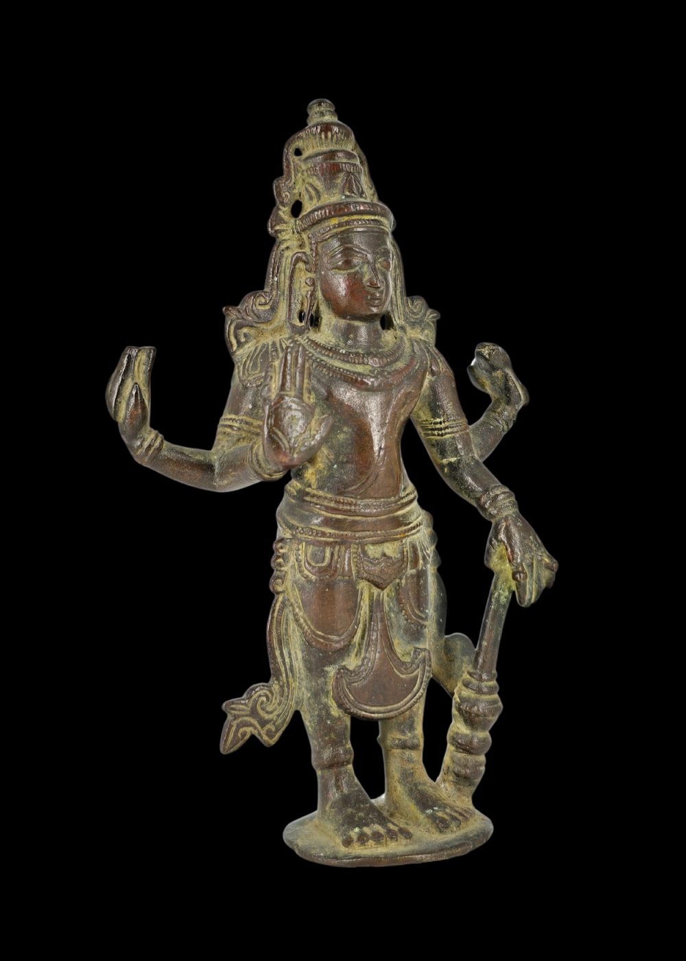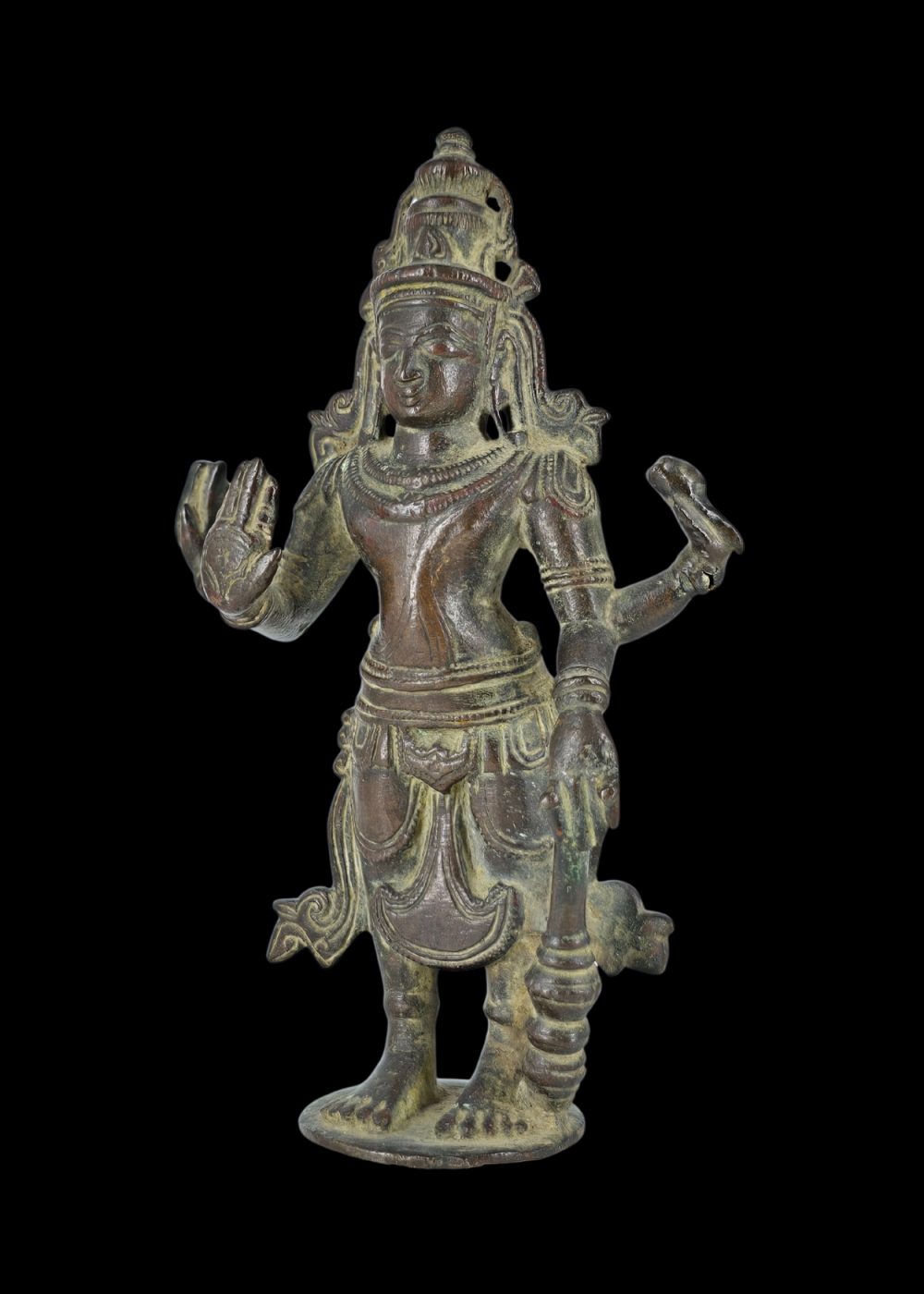This bronze sculpture from Andhra Pradesh represents the Hindu god Vishnu in a majestic standing posture. Characterized by four arms, Vishnu holds his traditional attributes: the conch (shankha), discus (chakra), mace (gada), and lotus (padma). His serene expression, tall crown (kiritamukuta), and intricate jewelry highlight the refined bronze-casting traditions of the region. The figure stands on a circular base, embodying balance and divine authority. Artifacts like this reflect the region’s exceptional skill in metalwork and its deep-rooted devotional culture.