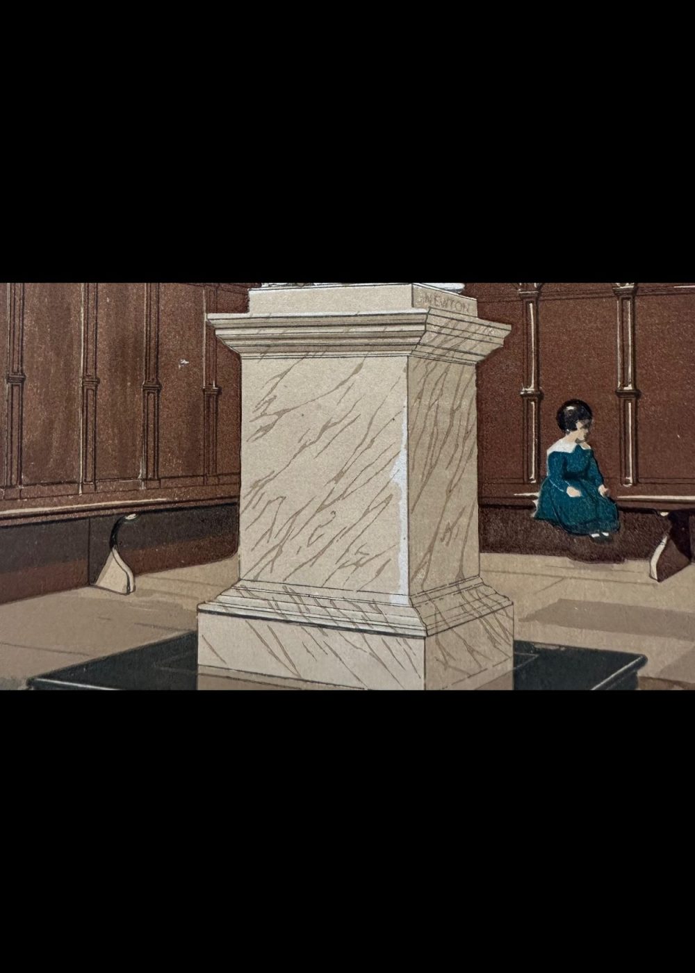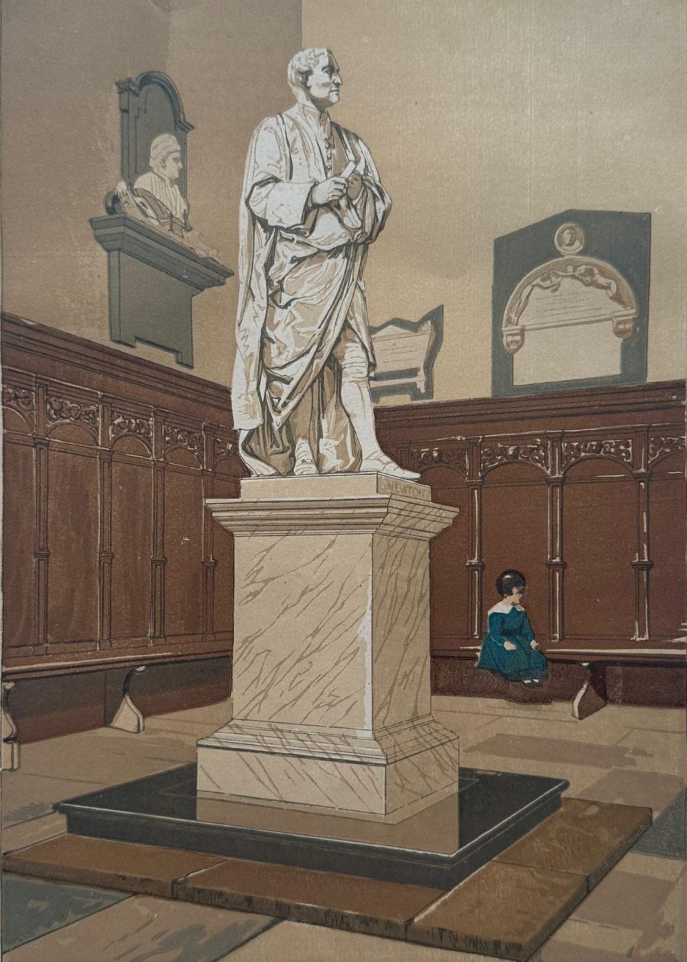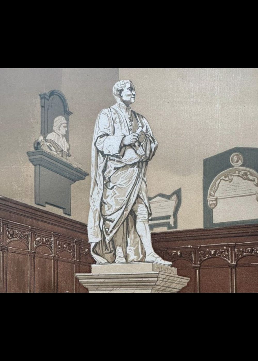 This refined illustration depicts the statue of Sir Isaac Newton, one of history’s greatest scientific minds, prominently placed within the University of Cambridge. The statue stands atop a marble pedestal in an ornate hall adorned with wooden paneling and commemorative plaques. A seated figure in academic attire pays quiet homage in the background, reinforcing the reverence held for Newton’s legacy. The setting captures the intellectual grandeur and historical significance of Cambridge, where Newton conducted much of his groundbreaking work in physics and mathematics.