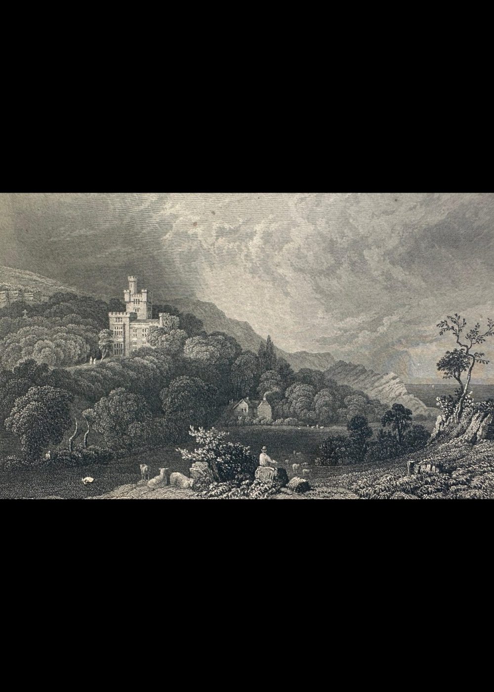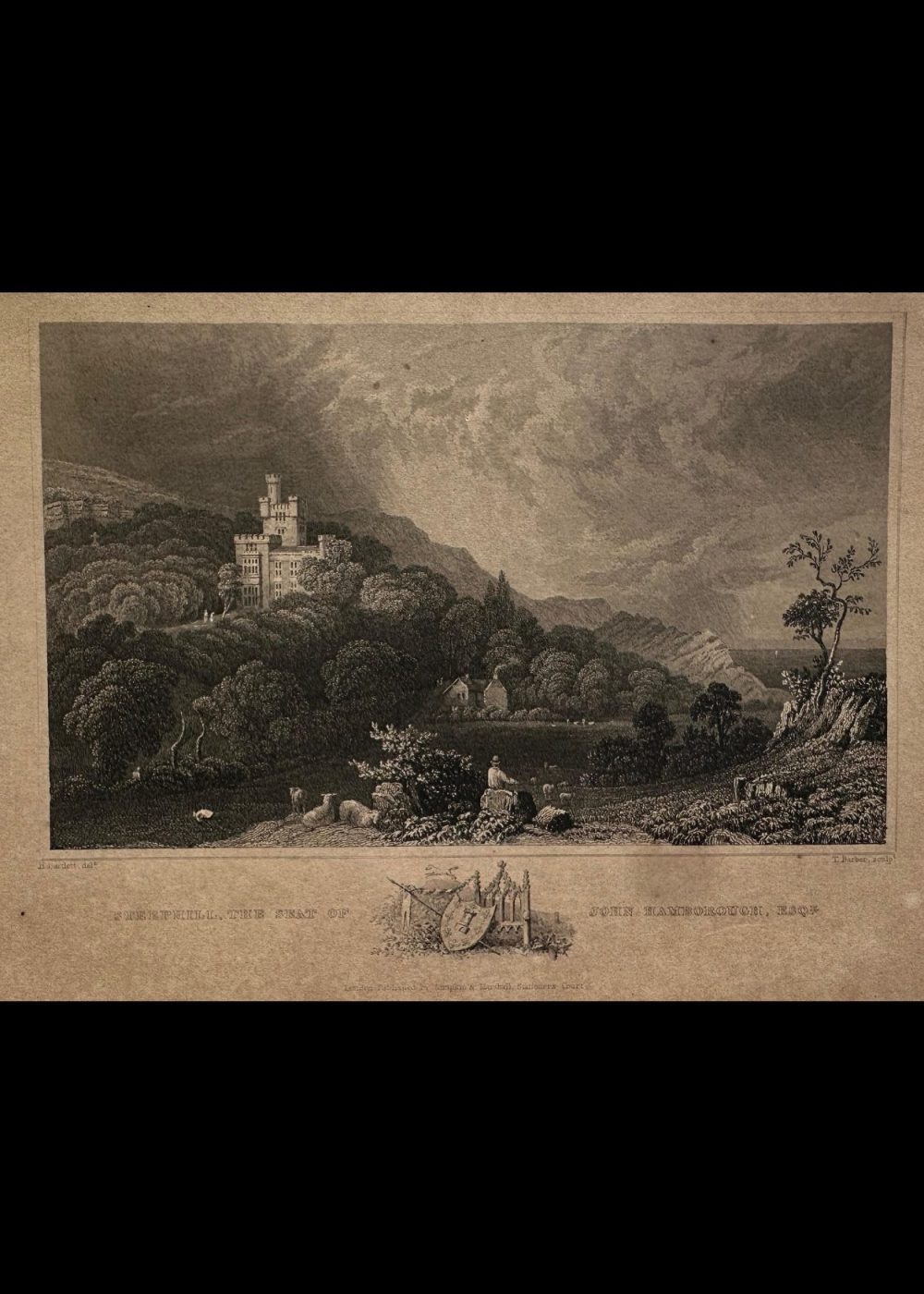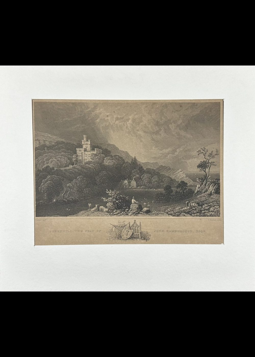 This detailed engraving showcases Steephill, the estate of John Mansbrough, Esq. The scene captures a stately mansion nestled among dense trees on a hillside. The mansion features a prominent tower and multiple windows, symbolizing grandeur and prominence. In the foreground, a peaceful pastoral setting unfolds with a shepherd seated on a rock, watching over a flock of sheep grazing on the grassy terrain. Two small cottages are visible in the mid-ground, surrounded by trees and bushes, contributing to the idyllic rural atmosphere. The landscape extends to reveal rugged hills and cliffs in the background, with a glimpse of the sea on the far right, indicating the estate’s coastal location. The sky is filled with dramatic clouds, adding depth and mood to the composition. Overall, this engraving evokes a serene and noble countryside estate, emphasizing the harmonious blend of architecture, nature, and rural life.