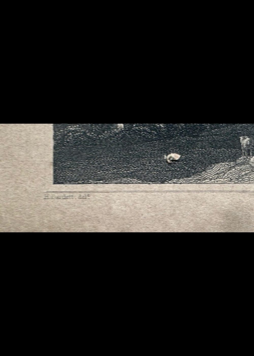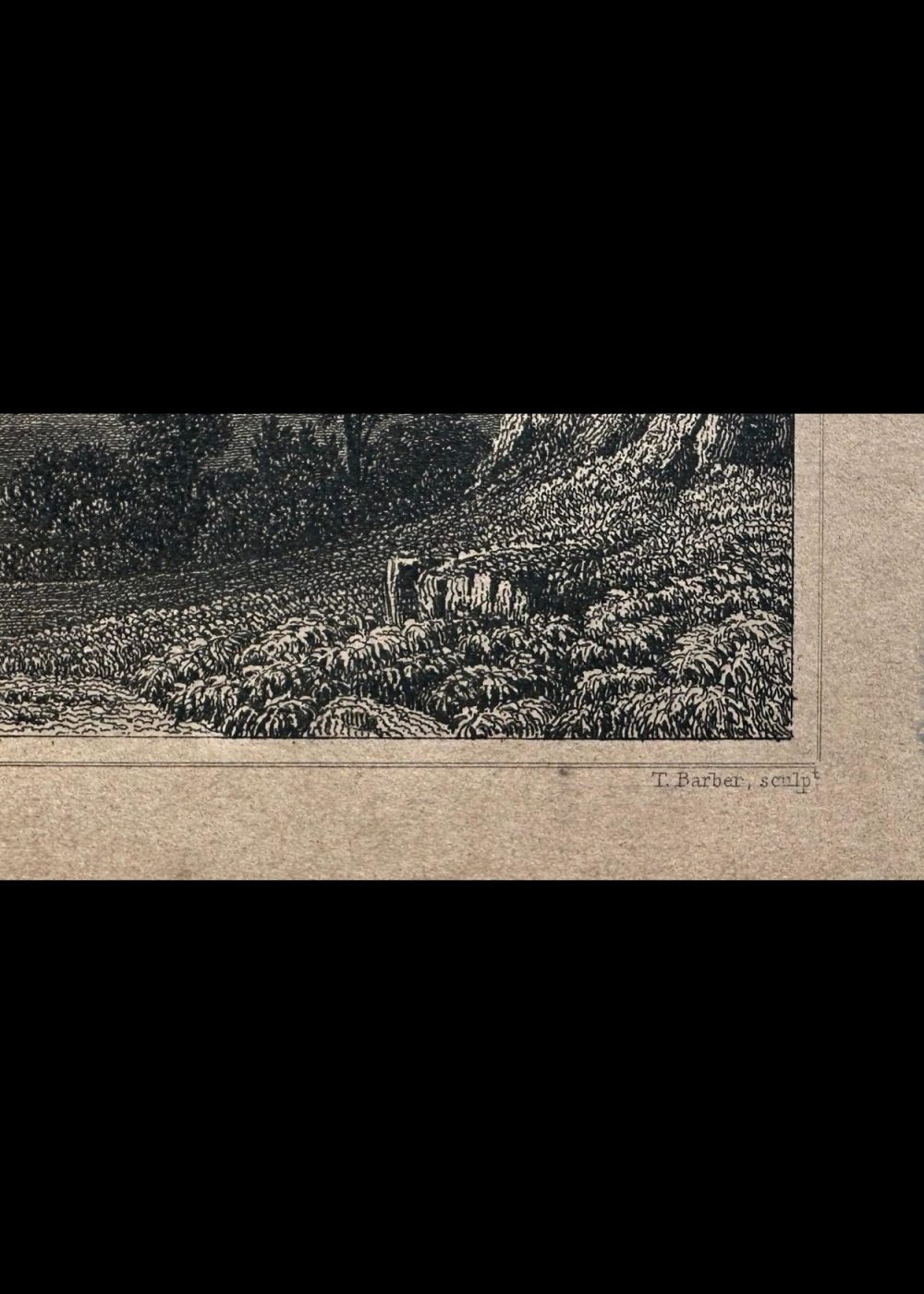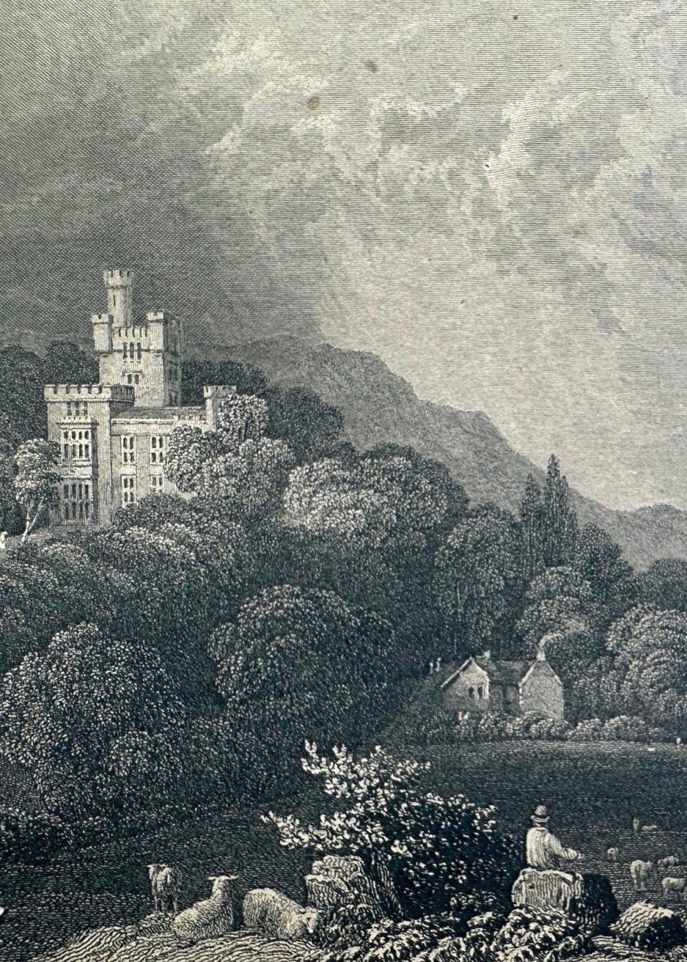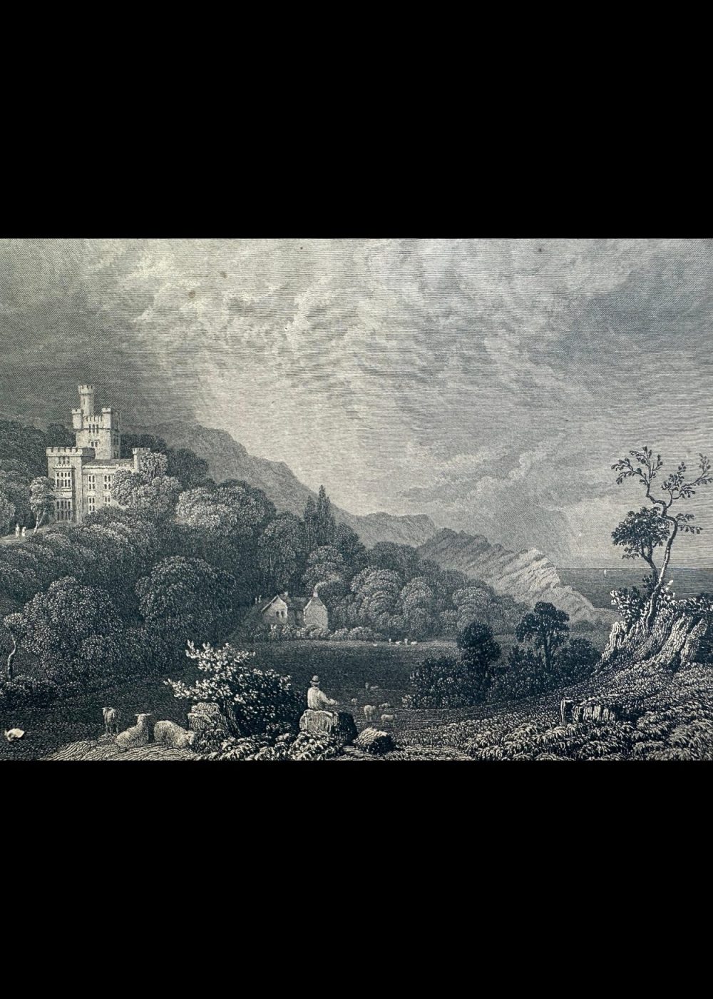This detailed engraving showcases Steephill, the estate of John Mansbrough, Esq. The scene captures a stately mansion nestled among dense trees on a hillside. The mansion features a prominent tower and multiple windows, symbolizing grandeur and prominence. In the foreground, a peaceful pastoral setting unfolds with a shepherd seated on a rock, watching over a flock of sheep grazing on the grassy terrain. Two small cottages are visible in the mid-ground, surrounded by trees and bushes, contributing to the idyllic rural atmosphere. The landscape extends to reveal rugged hills and cliffs in the background, with a glimpse of the sea on the far right, indicating the estate’s coastal location. The sky is filled with dramatic clouds, adding depth and mood to the composition. Overall, this engraving evokes a serene and noble countryside estate, emphasizing the harmonious blend of architecture, nature, and rural life.