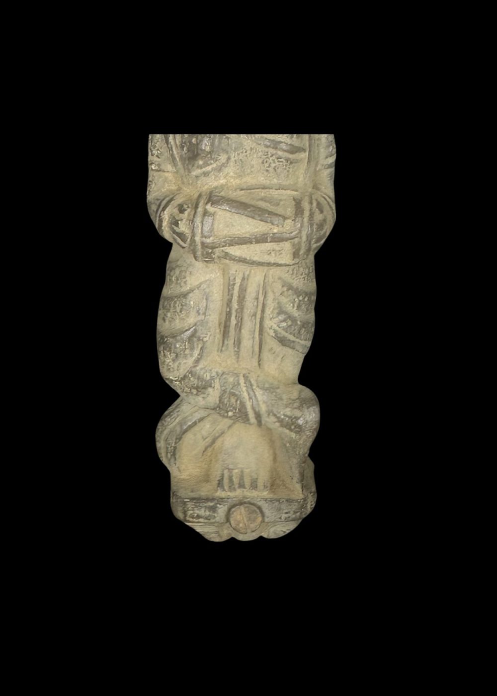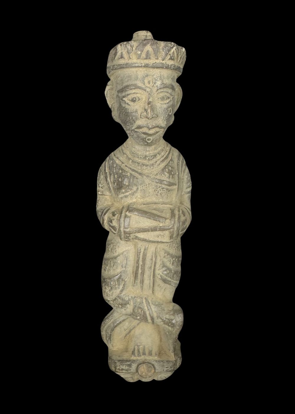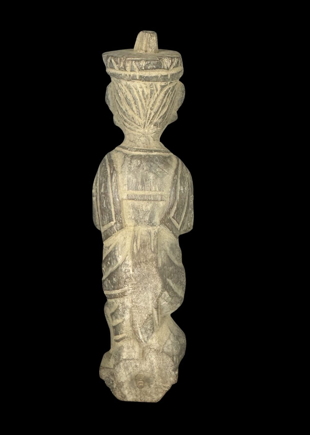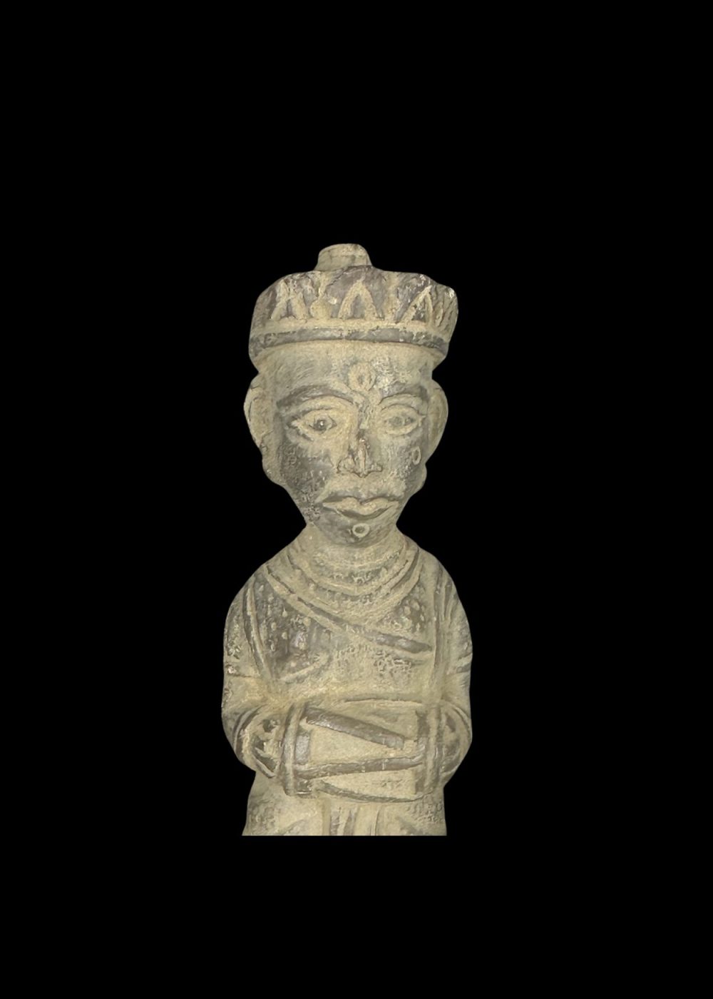 This carved stone figure presents a dignified, robed individual standing upright with hands folded at the front. The figure’s elaborate crown-like headpiece and flowing garment suggest royal or ceremonial significance. Intricate surface detailing along the robe’s folds and textures highlights the artisan’s craftsmanship, evoking traditions associated with spiritual reverence or historical portraiture. The calm posture and solemn expression further reinforce its symbolic stature.