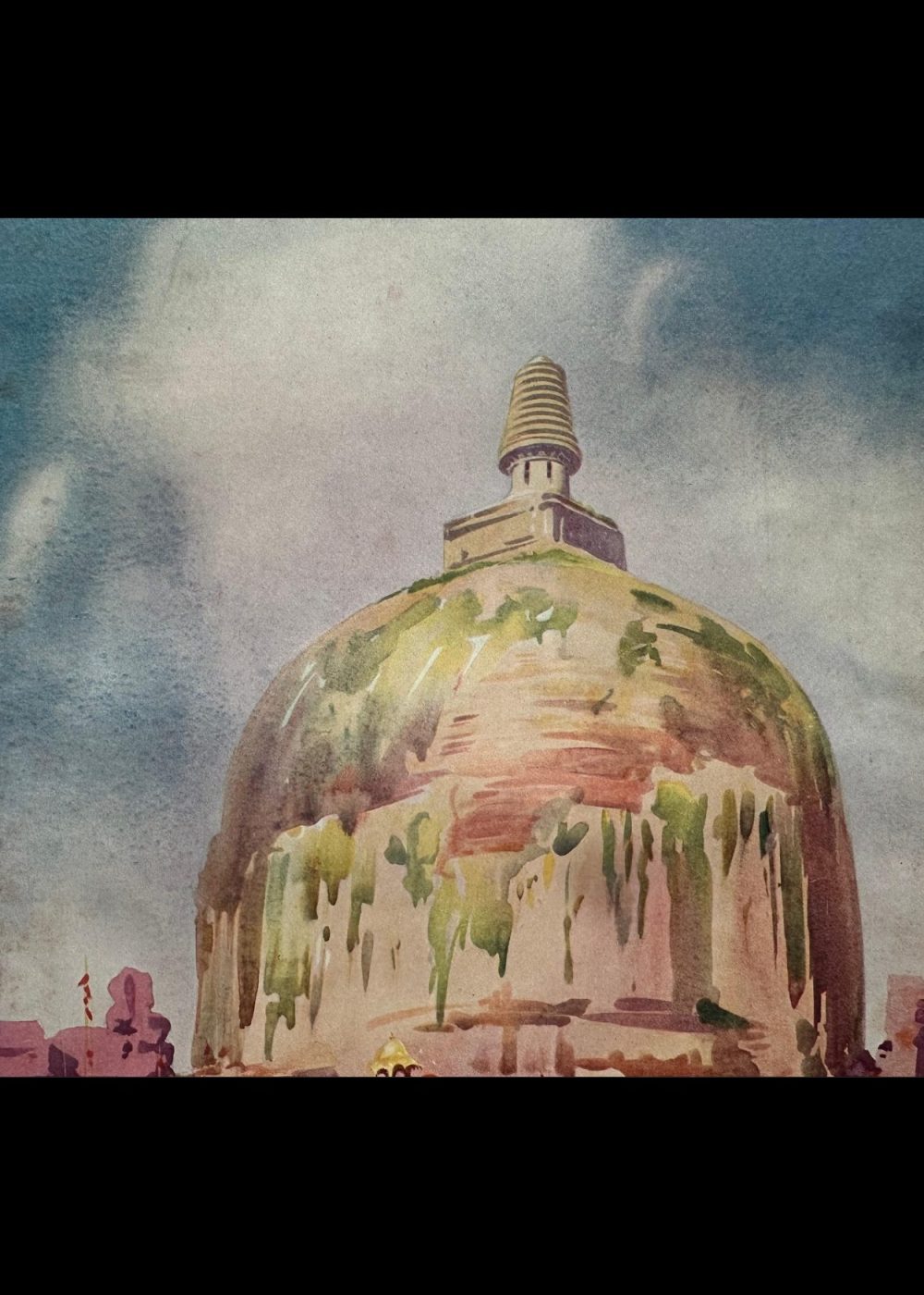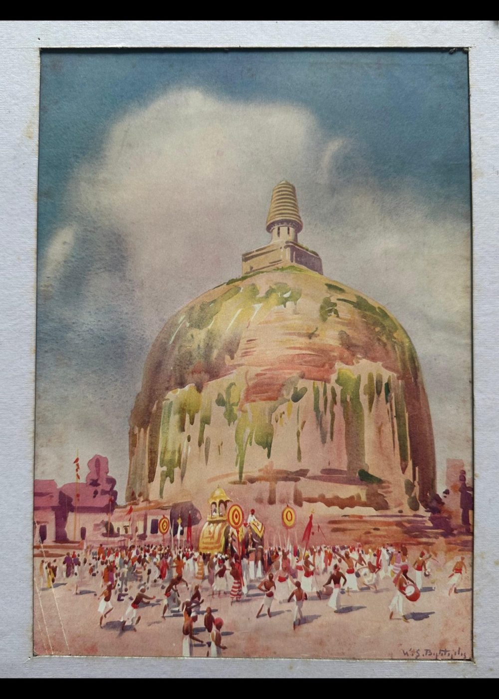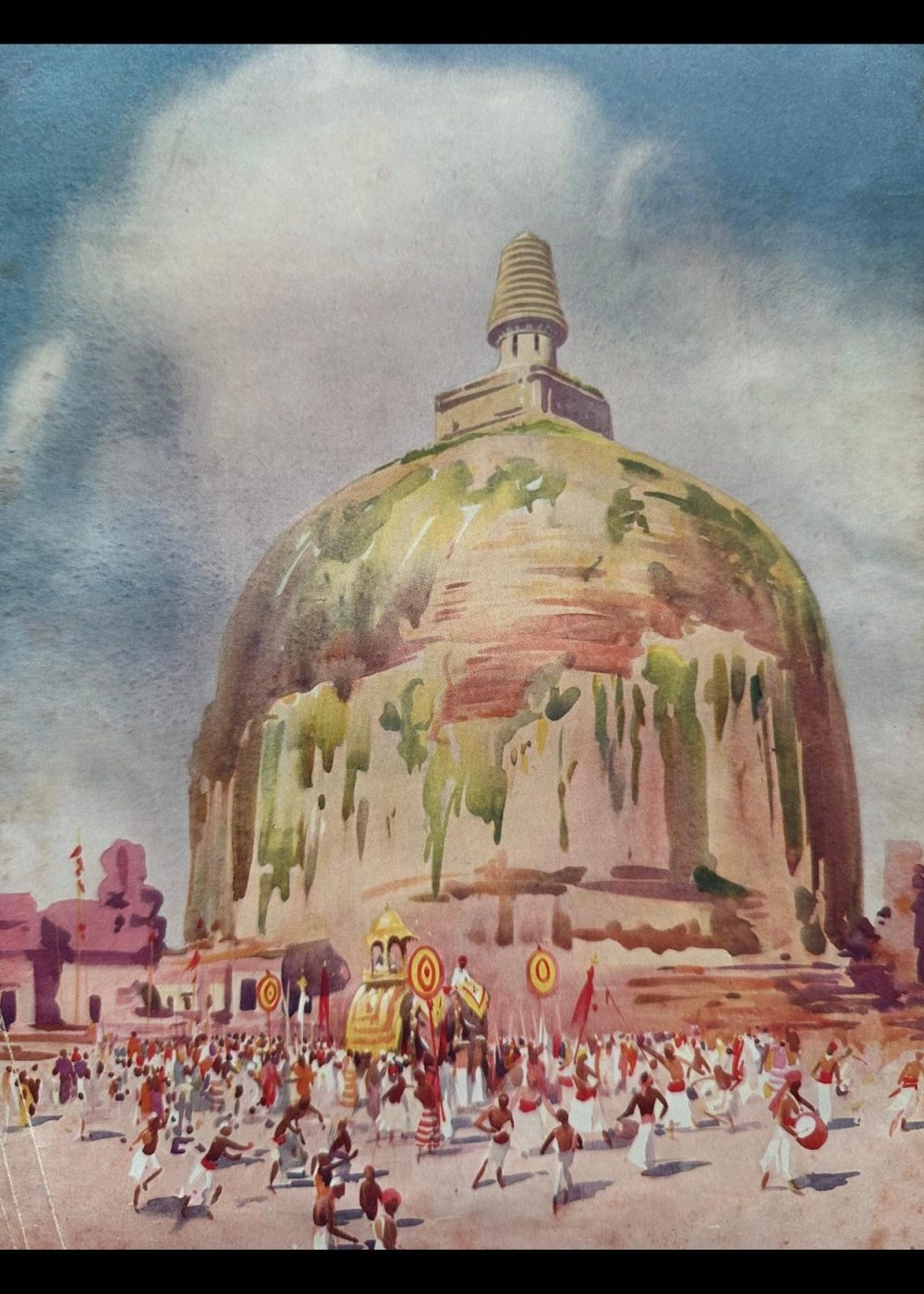 This captivating oleograph depicts a grand ceremonial procession encircling a monumental Buddhist stupa, reminiscent of the Great Stupa at Sanchi. The weathered dome, softened by moss and time, stands as a timeless emblem of spiritual endurance and heritage. Below, a vibrant gathering of devotees, musicians, and adorned elephants enlivens the scene with rhythm and color, celebrating India’s ancient Buddhist traditions through art and ritual. Reflecting the artistry of William Spencer Bagdatopulos (WSB)—a visionary of early Indian advertising illustration—this work embodies his gift for transforming everyday imagery into vivid oriental exotica. Active in the 1930s, Bagdatopulos infused his compositions with local color, from temples and deities to processions and sacred festivals, merging cultural depth with striking visual appeal. This piece stands as both a spiritual homage and a testament to his unique artistic legacy.