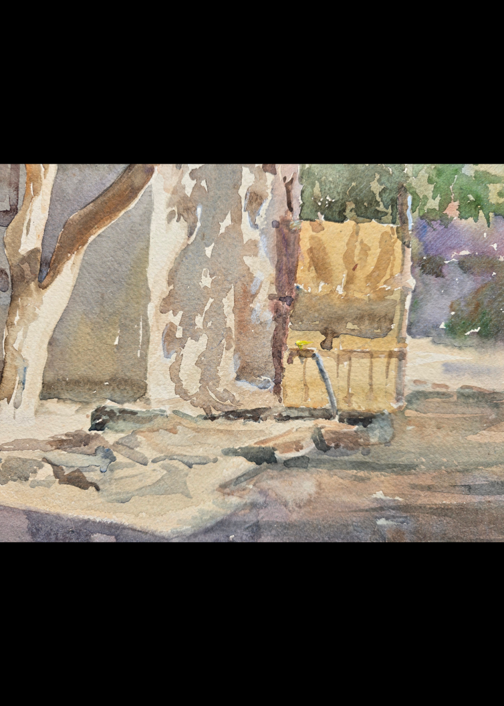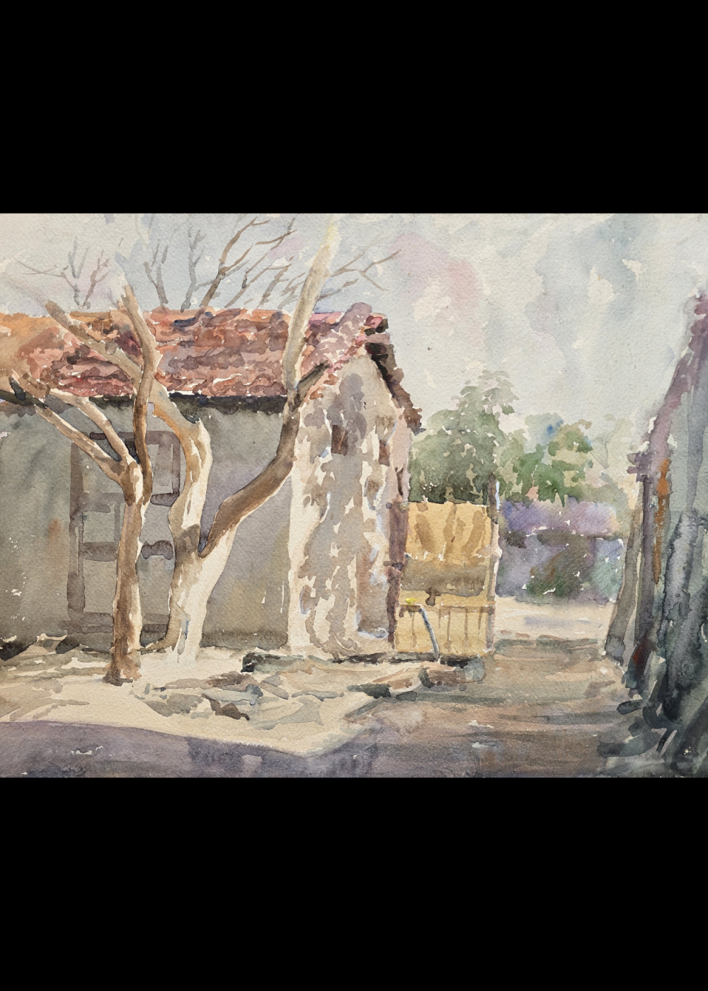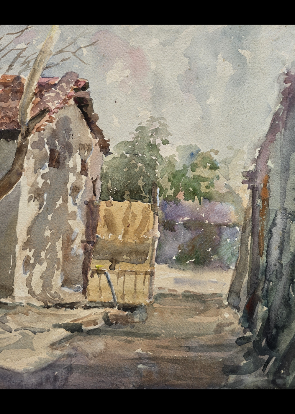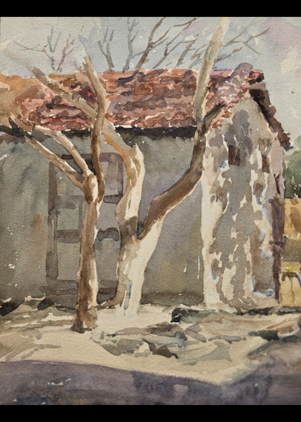 This watercolor painting portrays a quiet village scene, with rustic stone walls, a tiled roof, and leafless trees casting long shadows. Soft washes of color and gentle light capture the stillness of a sunlit afternoon, evoking a sense of simplicity and timeless rural charm.