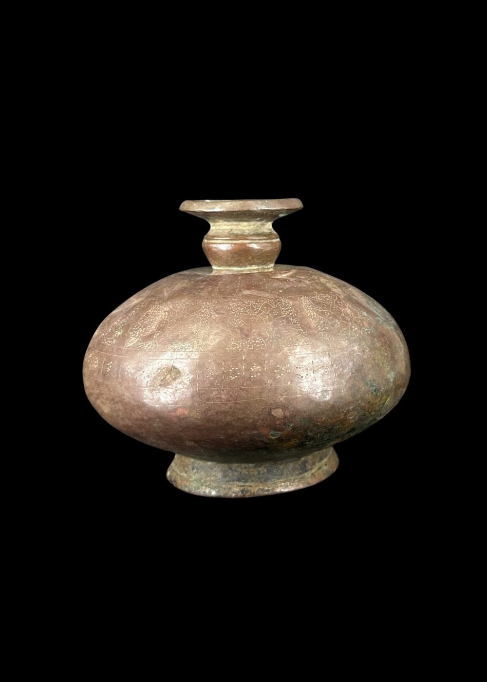 This bronze Surai, a traditional Indian water vessel. Characterized by its bulbous body, narrow neck, and flared mouth, the Surai was commonly used to store and pour water or other liquids, especially in domestic and ceremonial contexts. The surface features fine, engraved patterns—possibly floral or calligraphic—that enhance its aesthetic appeal. The rich, dark patina and signs of wear reflect its age and long-standing use. A fine example of traditional Indian metalwork, this Surai blends utility with ornamental craftsmanship.