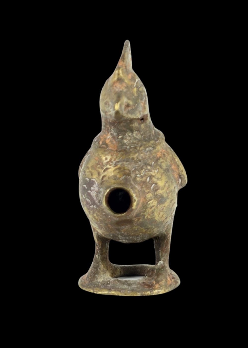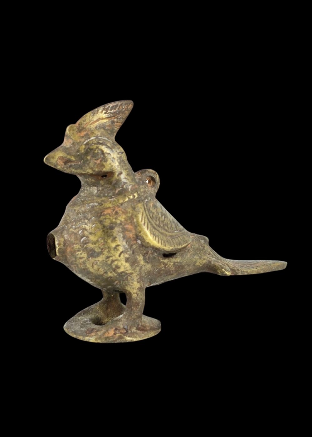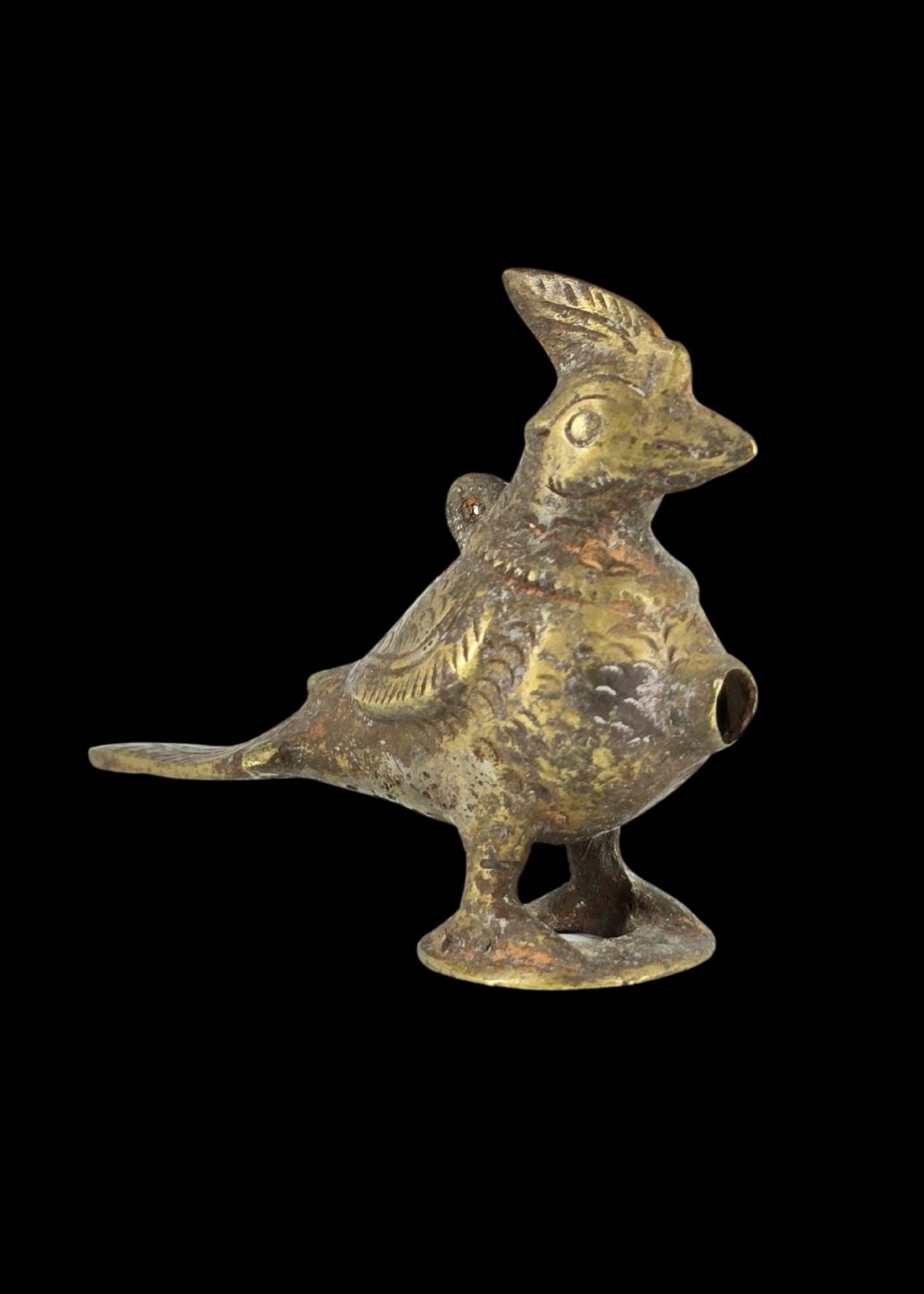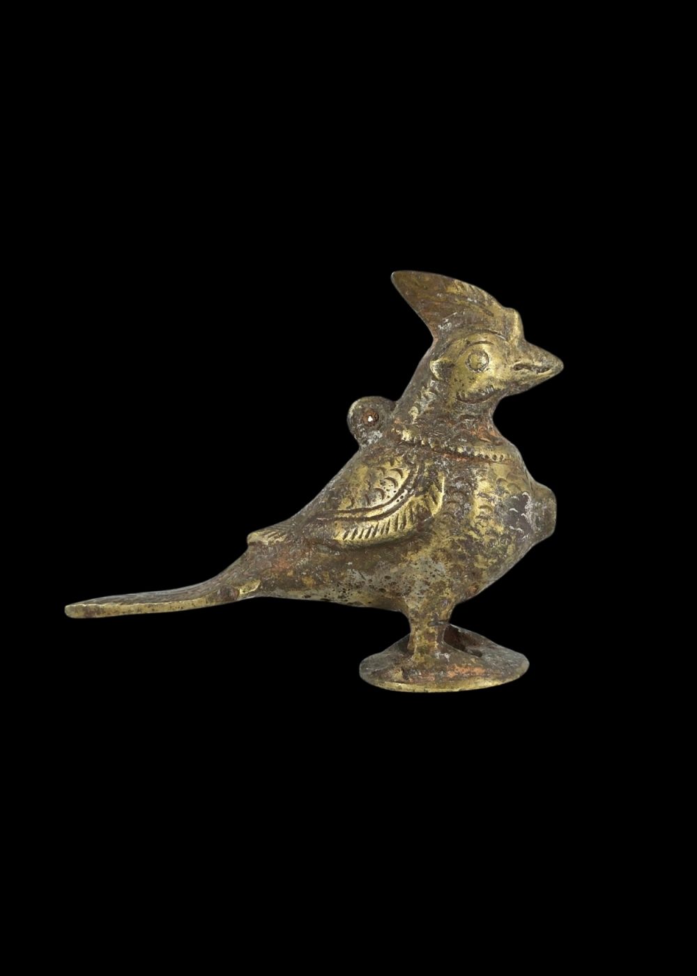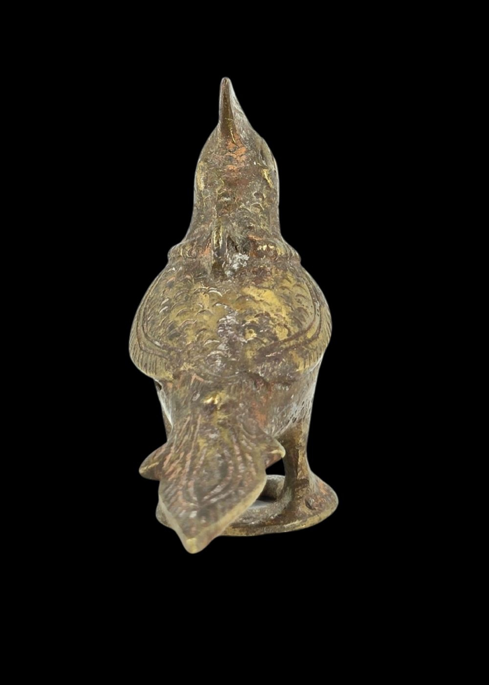 This is a miniature brass parrot sculpture, accented with engraved details on its wings, tail, and around the eyes. The figurine stands gracefully on a rounded pedestal base, reflecting the craftsmanship and traditional design elements of Indian folk art.