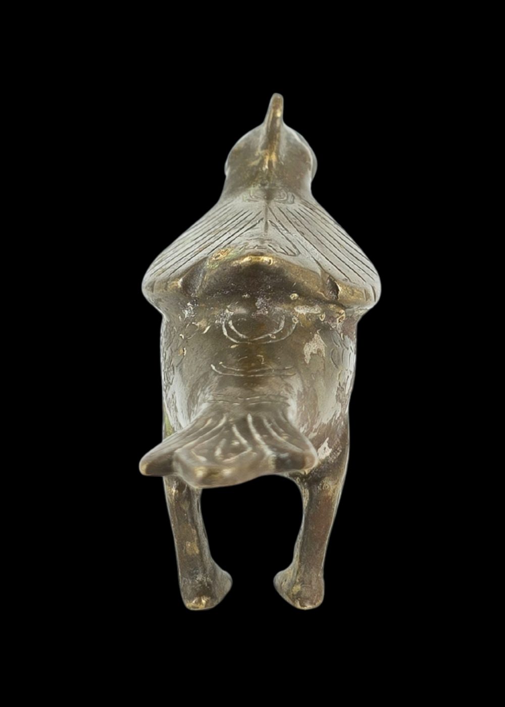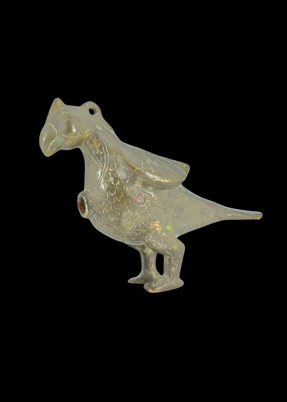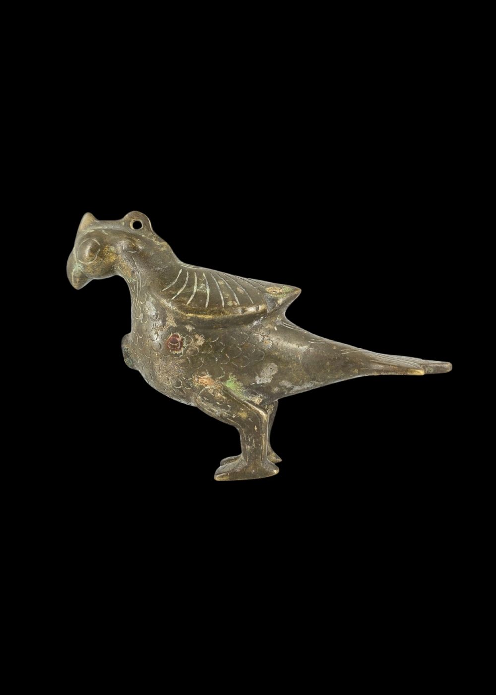 This is a vintage brass figurine shaped as a parrot, featuring stylized body details, prominent eyes, and feather engravings. The handcrafted piece reflects traditional Indian metalworking skills and serves as a decorative object symbolizing beauty and craftsmanship.