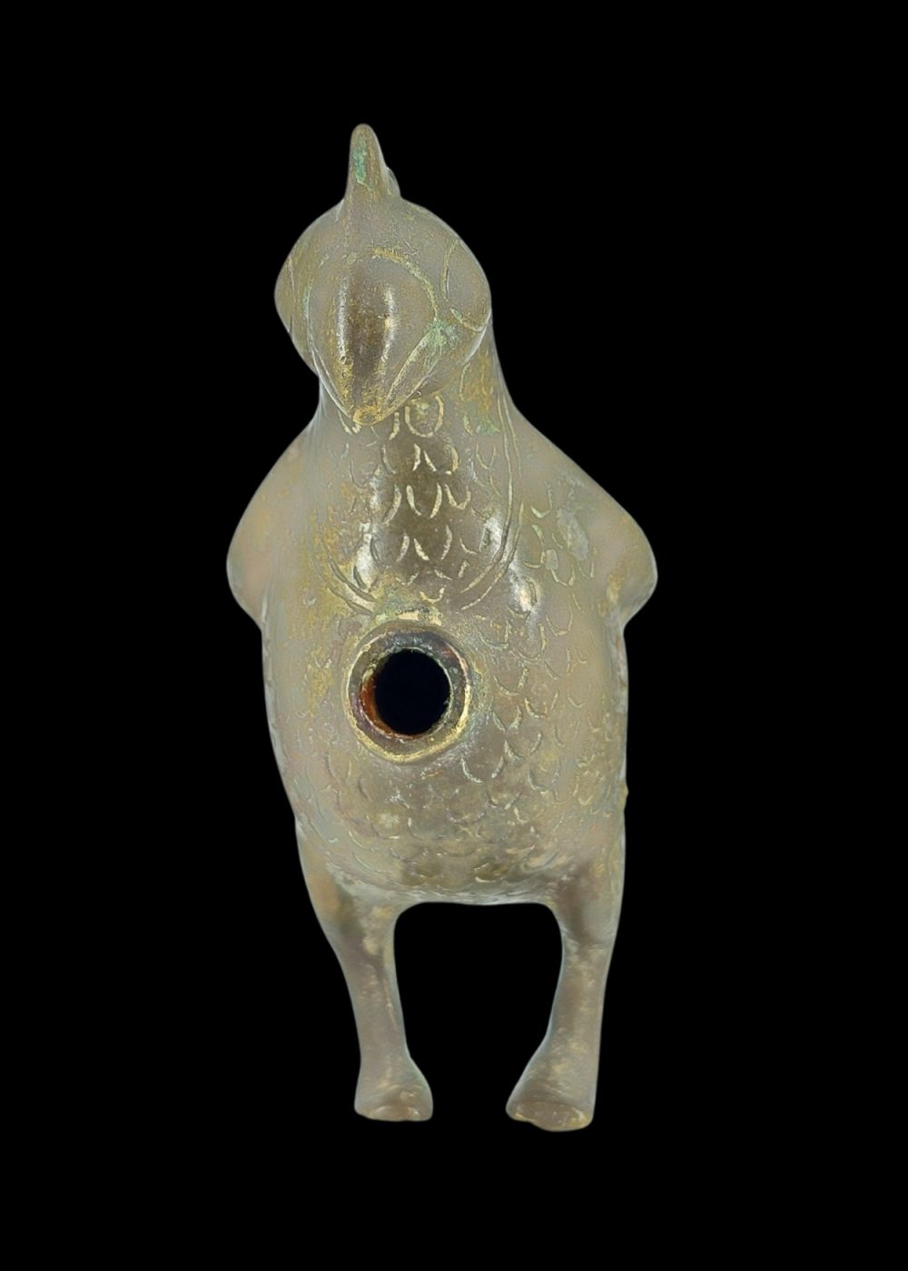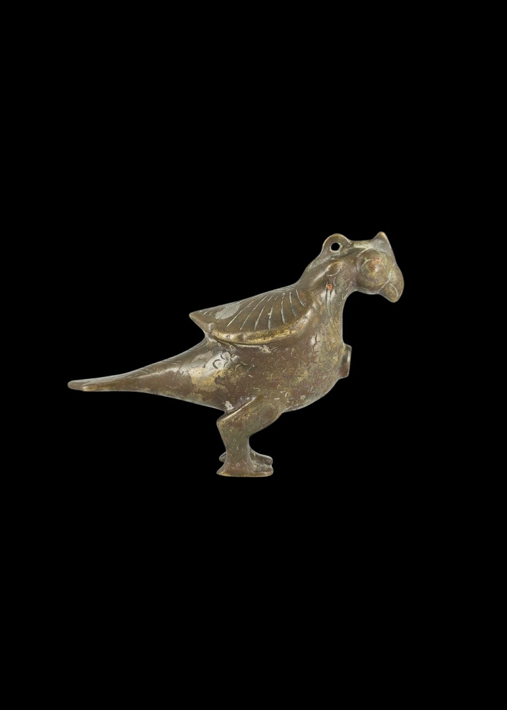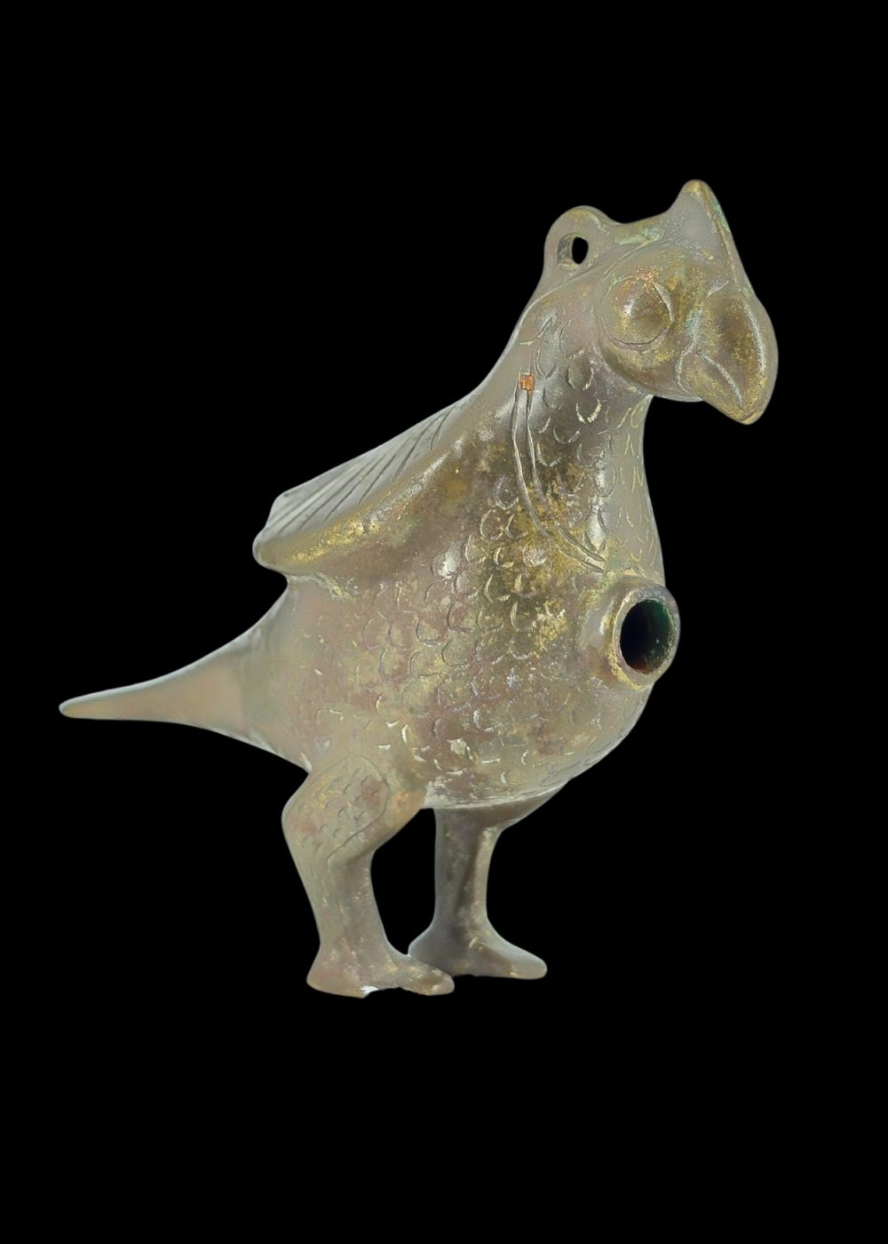 This is a vintage brass figurine shaped as a parrot, featuring stylized body details, prominent eyes, and feather engravings. The handcrafted piece reflects traditional Indian metalworking skills and serves as a decorative object symbolizing beauty and craftsmanship.