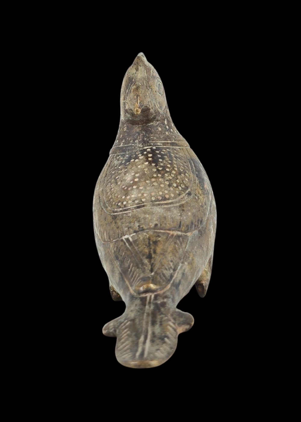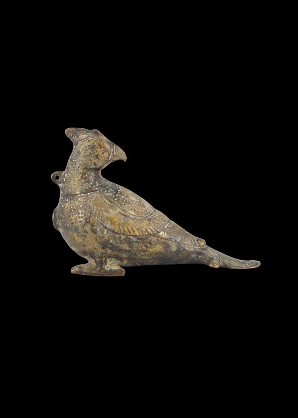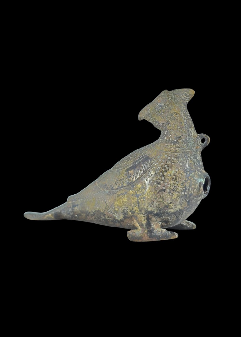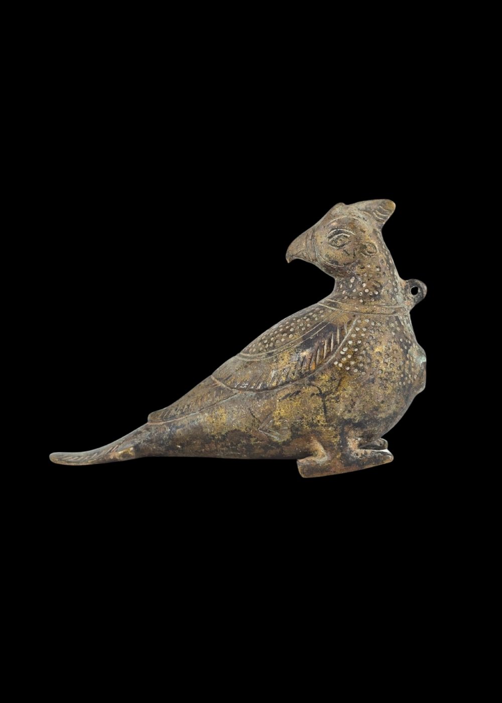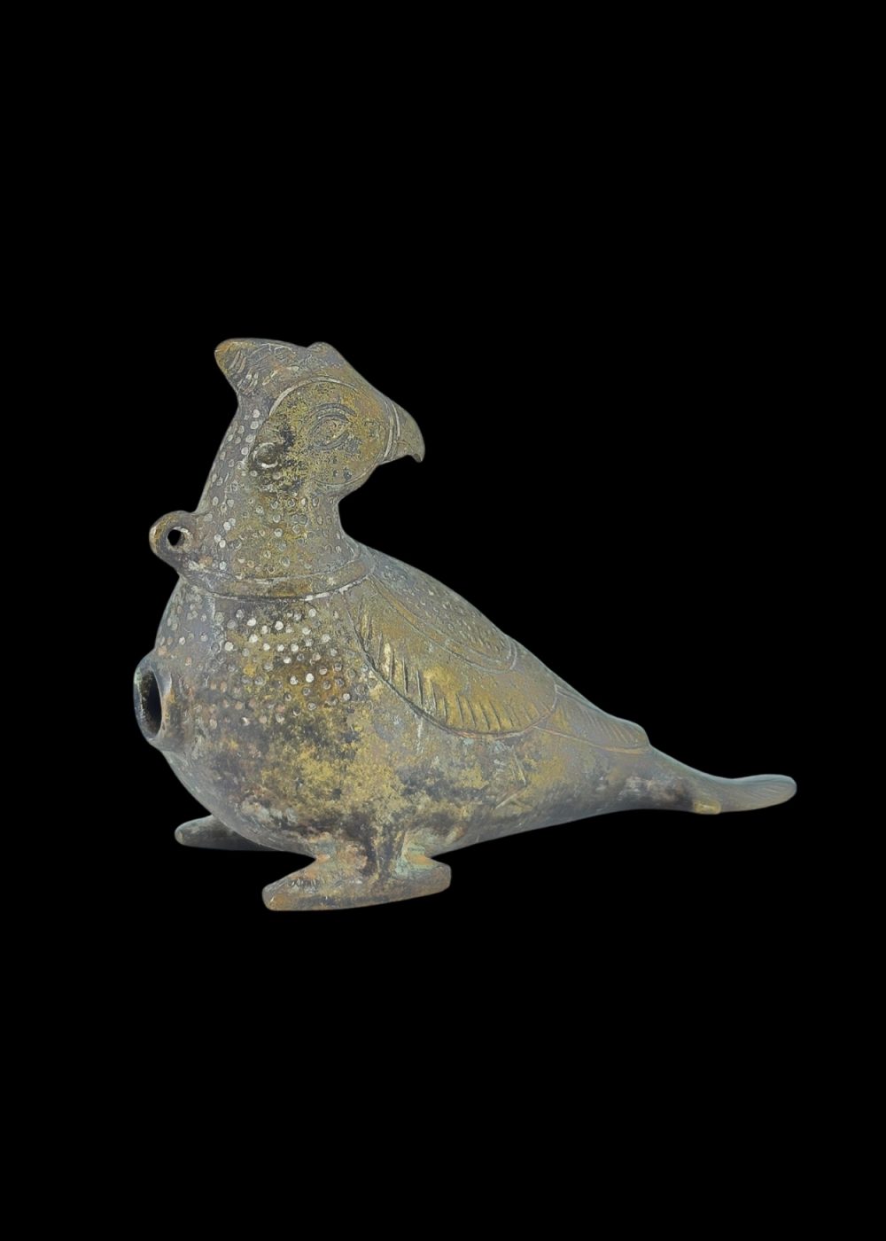 This is a traditional brass figurine of a parrot, adorned with engraved patterns on its feathers and body. The piece exemplifies classic Indian metal artistry, revealing intricate detailing and a distinct vintage patina. It serves as a decorative collectible symbolizing craftsmanship and avian beauty.