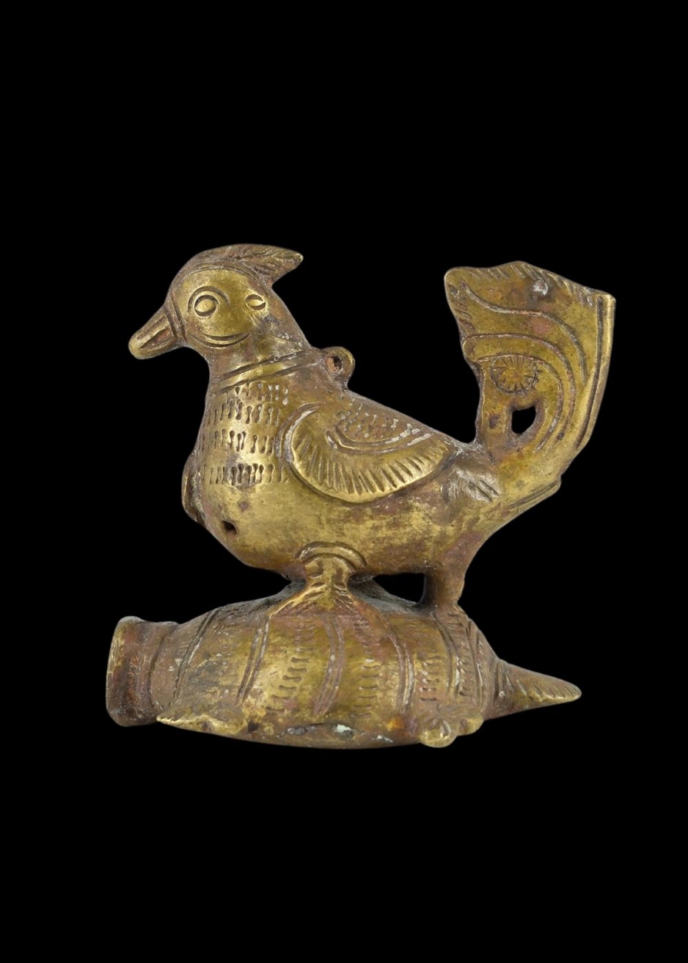 This is a figurine depicting a detailed bird perched atop a conch shell, with ornate feathers and tail engravings. The combination of bird and conch symbolism reflects themes from Indian art and culture, making this piece both decorative and meaningful as a collectible artifact.