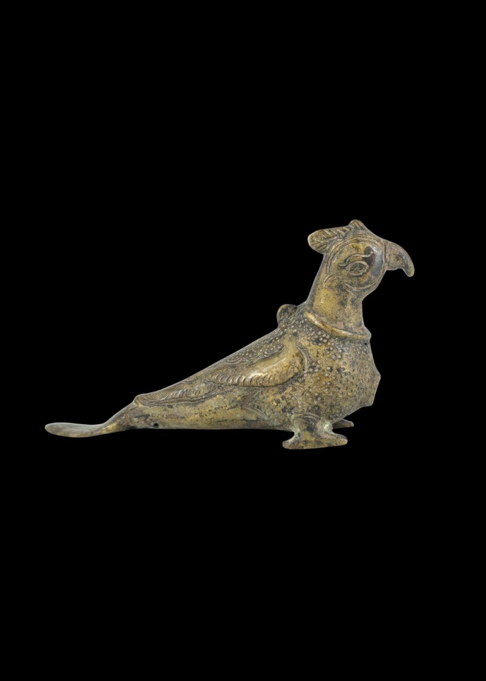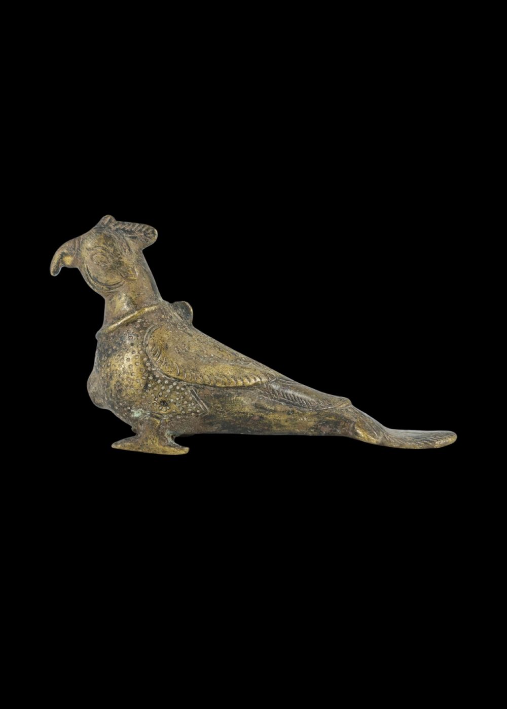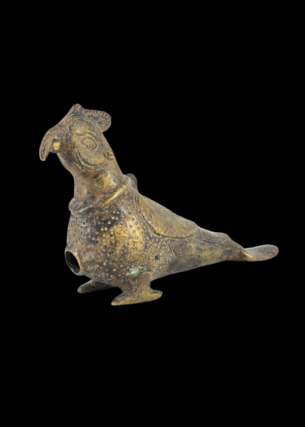 This is a parrot figurine showcasing elegant hand-engraved details on the wings, feathers, and facial features. Its elongated tail, upright stance, and traditional patina highlight skilled craftsmanship and make it a charming addition to any folk art or collectible display.
