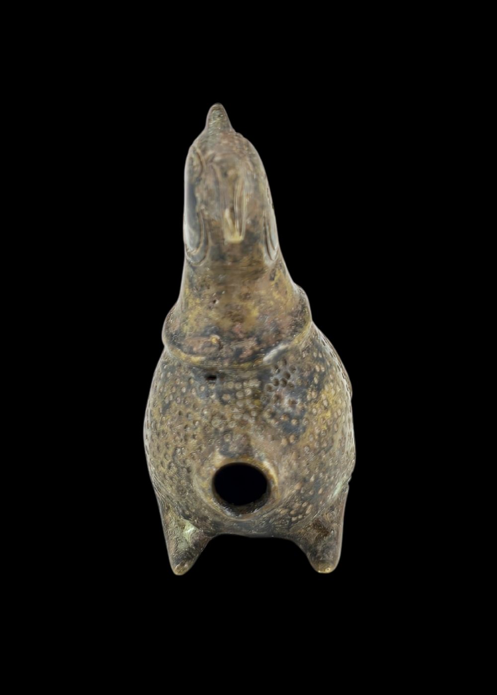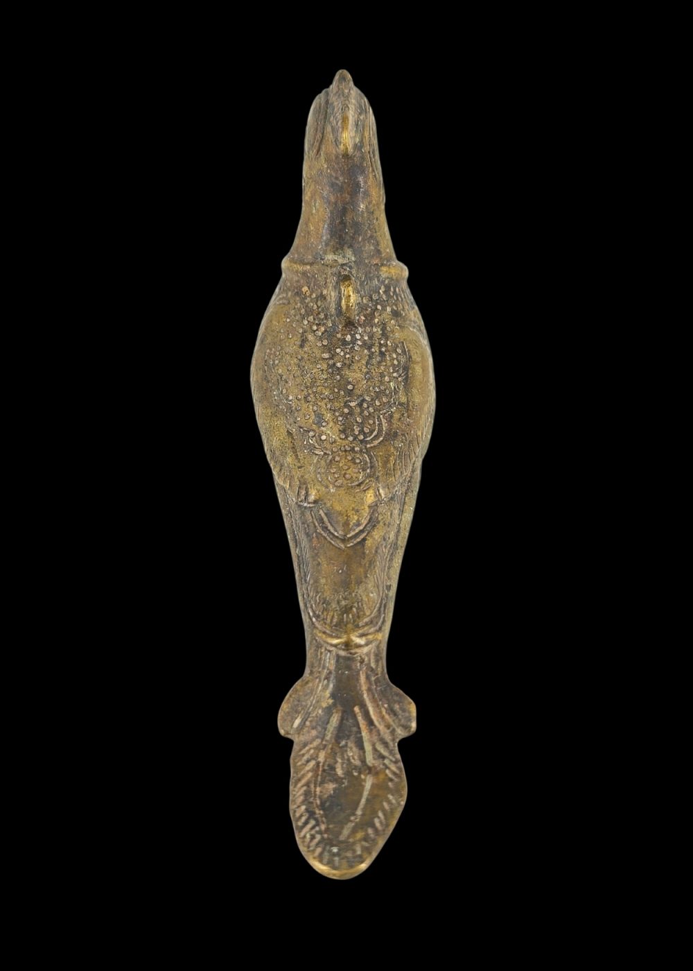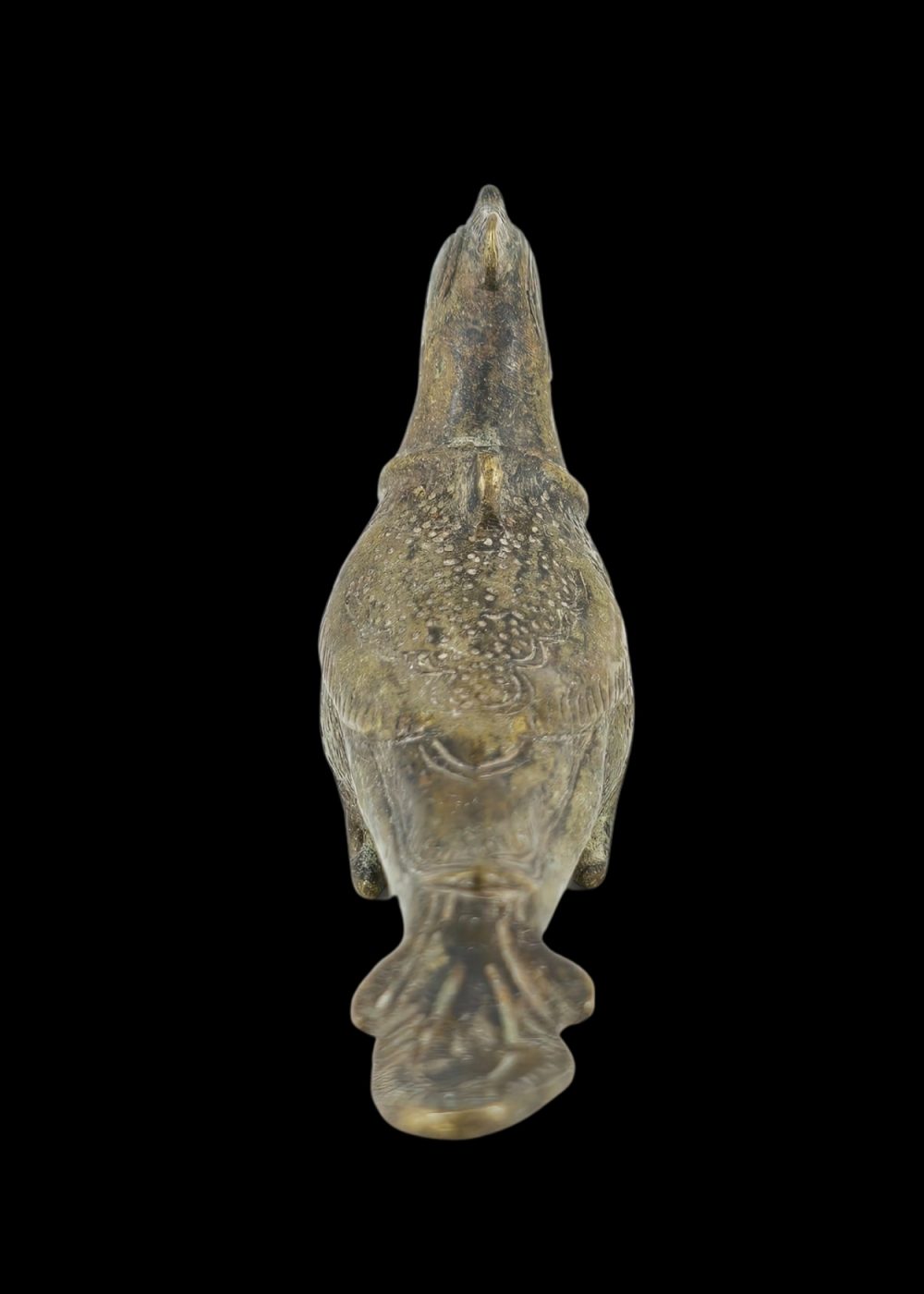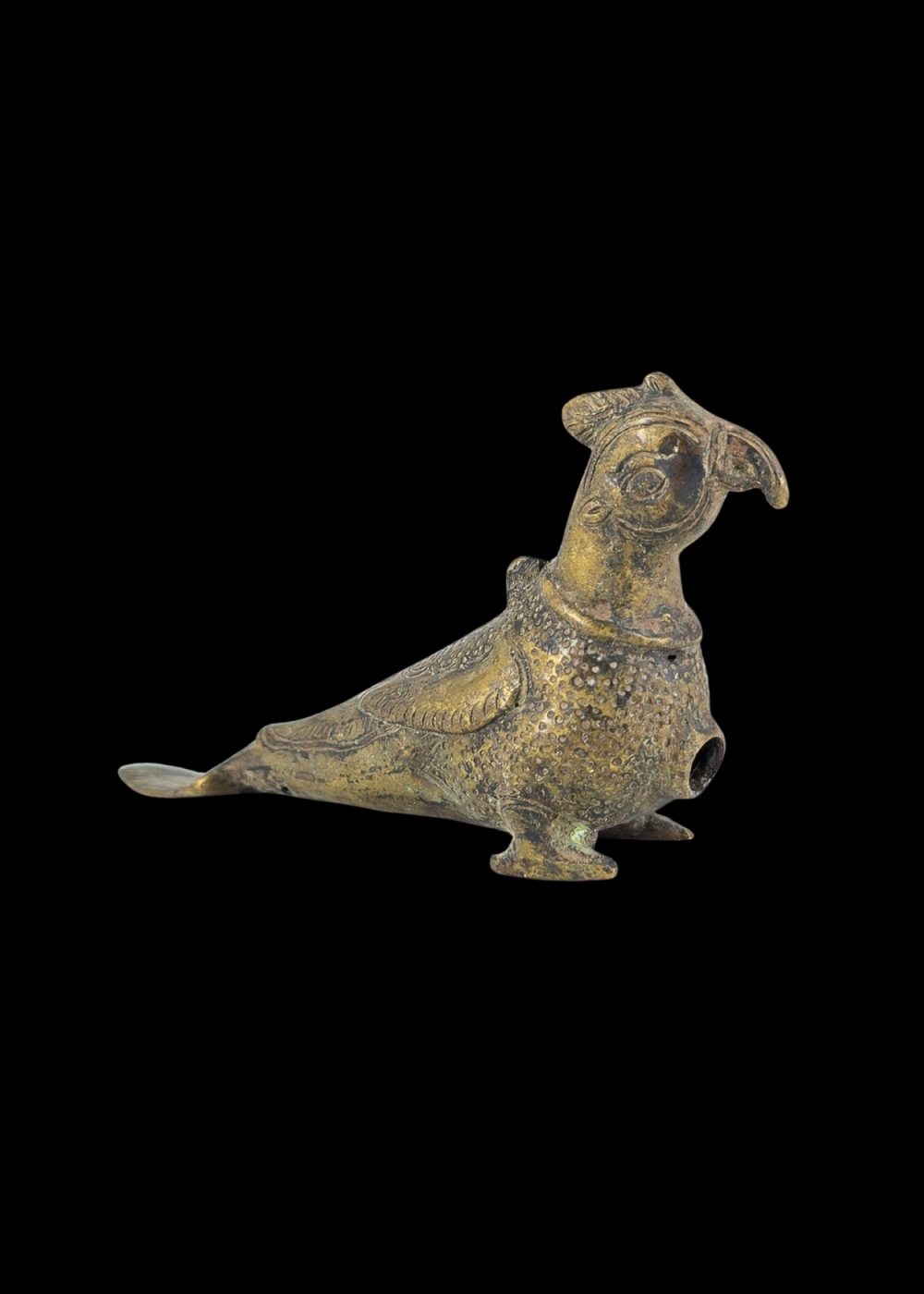 This is a parrot figurine showcasing elegant hand-engraved details on the wings, feathers, and facial features. Its elongated tail, upright stance, and traditional patina highlight skilled craftsmanship and make it a charming addition to any folk art or collectible display.
