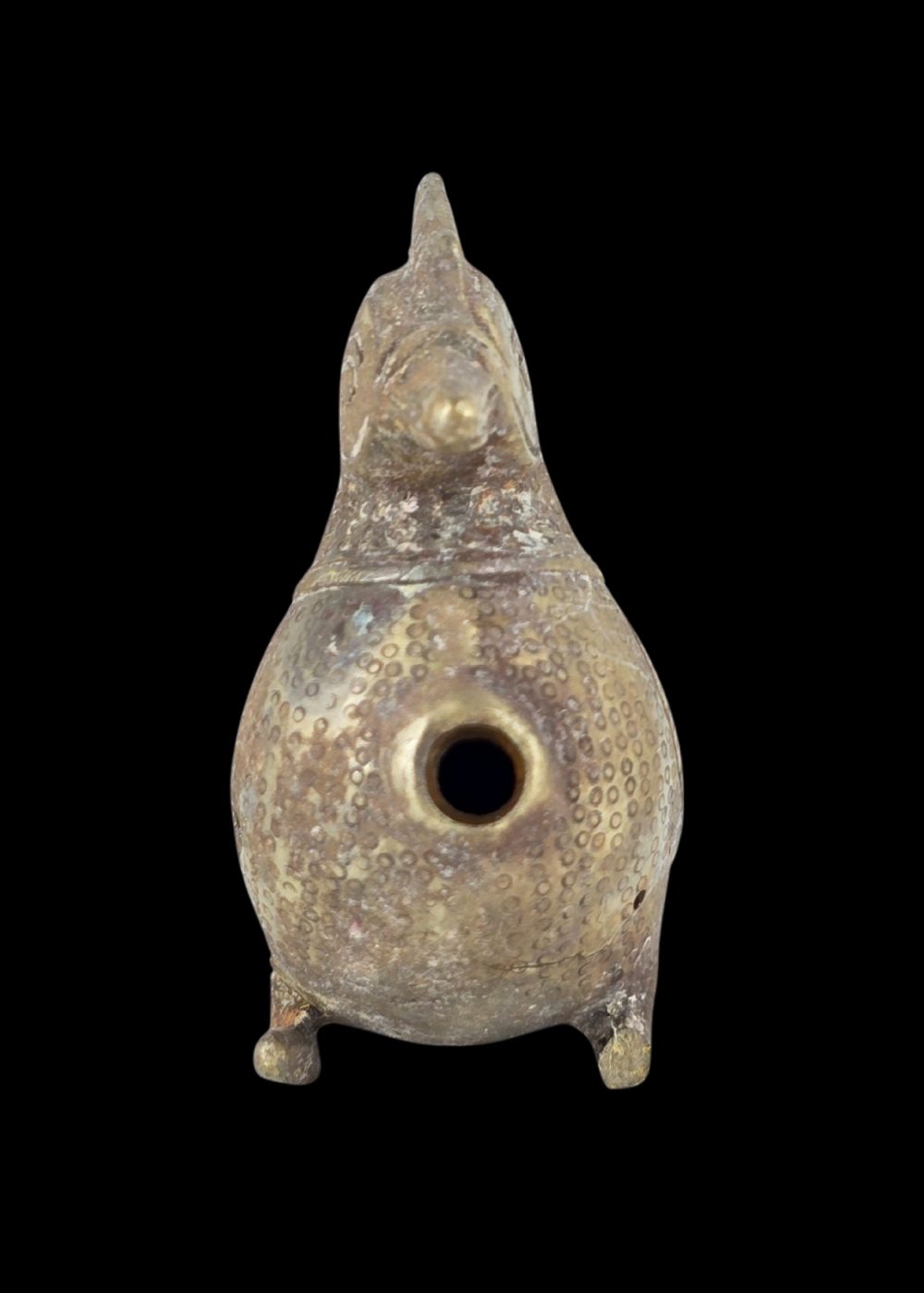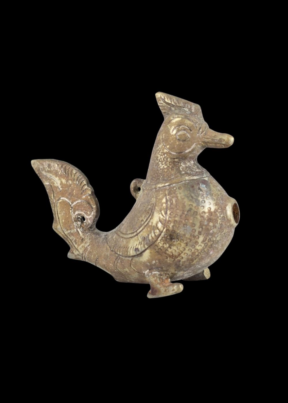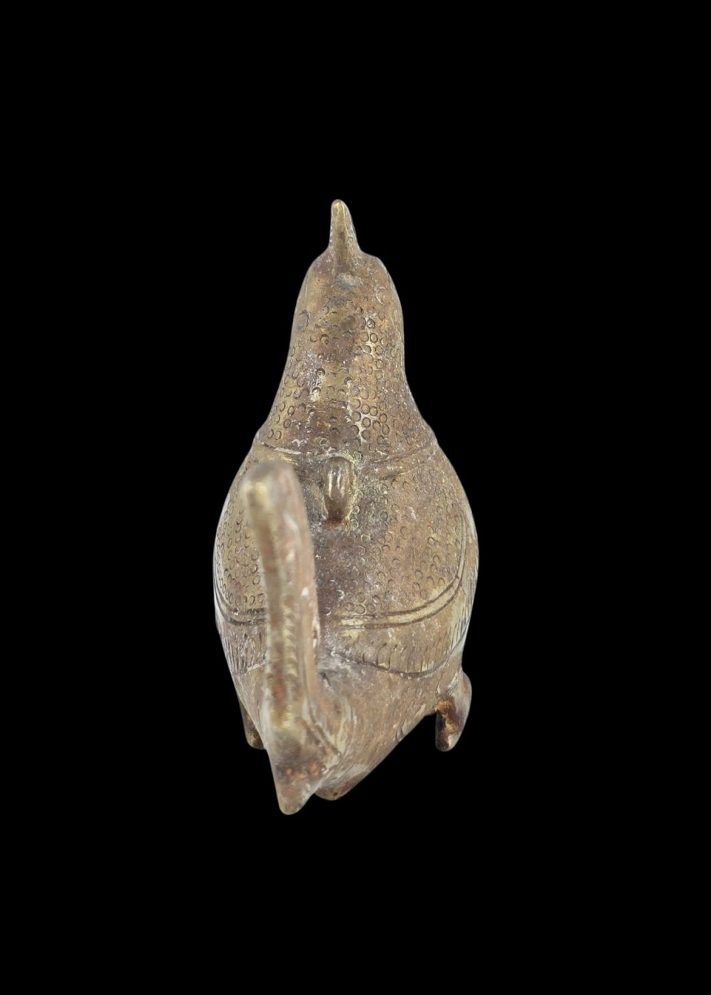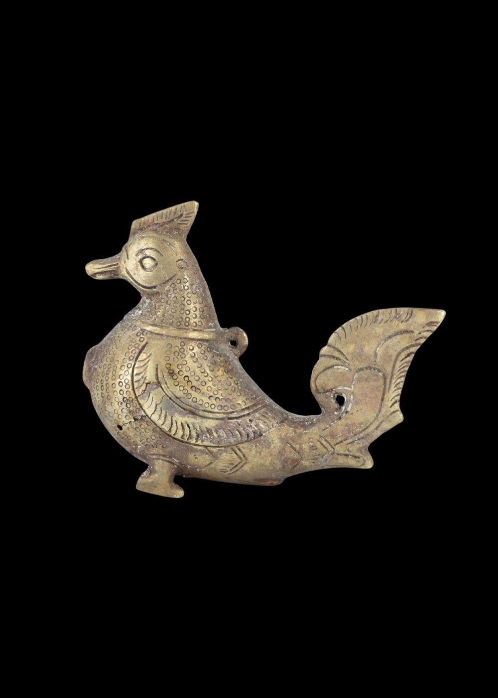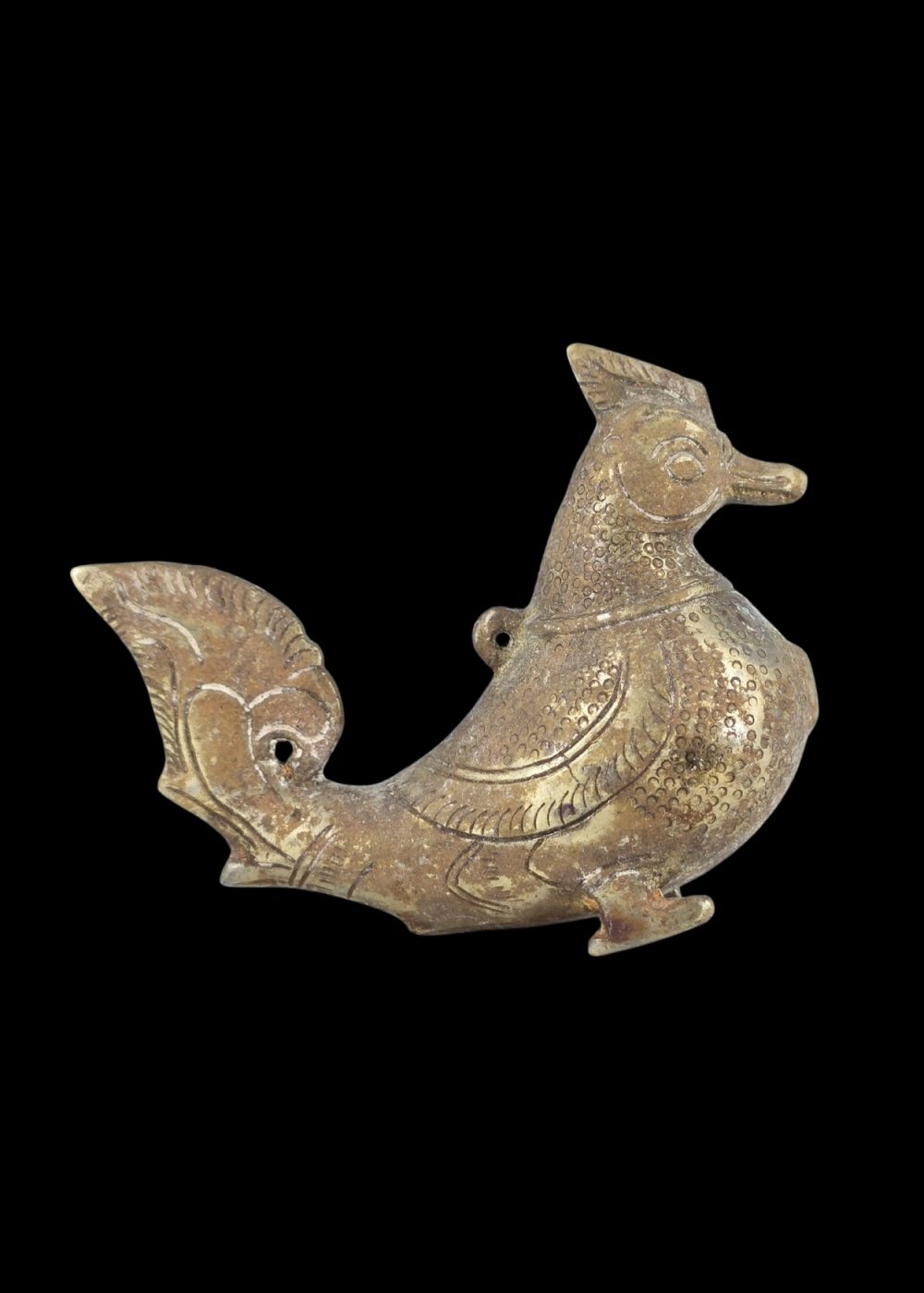 This is an ornate bird figurine, distinguished by its elaborate tail, engraved plumage, and classic craftsmanship. The stylized detailing on the body and tail showcase traditional Indian metallurgical art, making it a decorative and collectible piece often used for home decor or folk art displays.