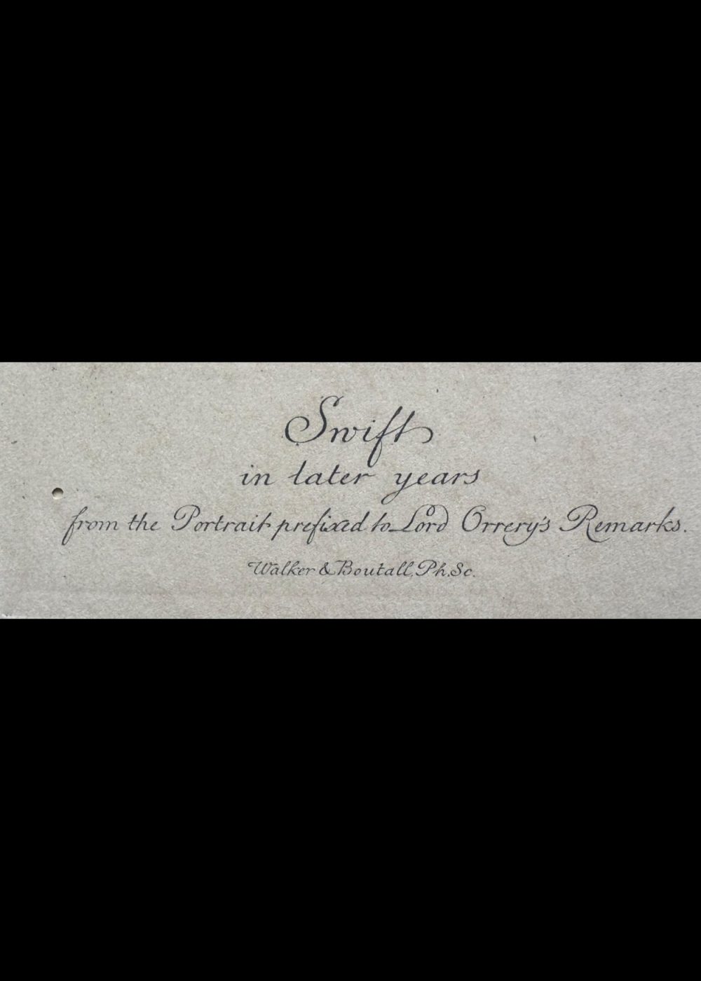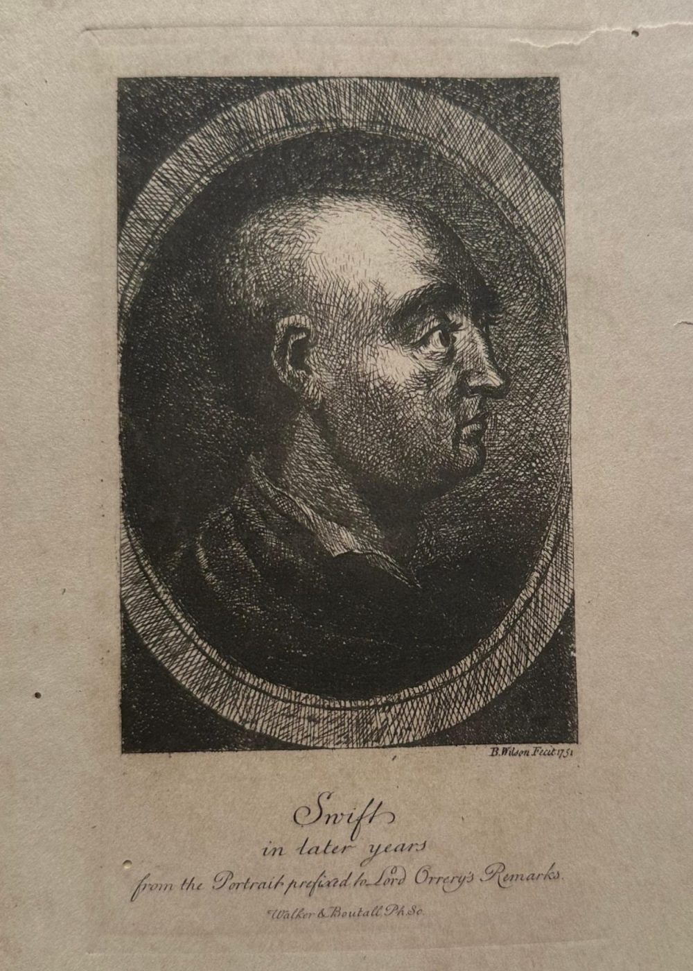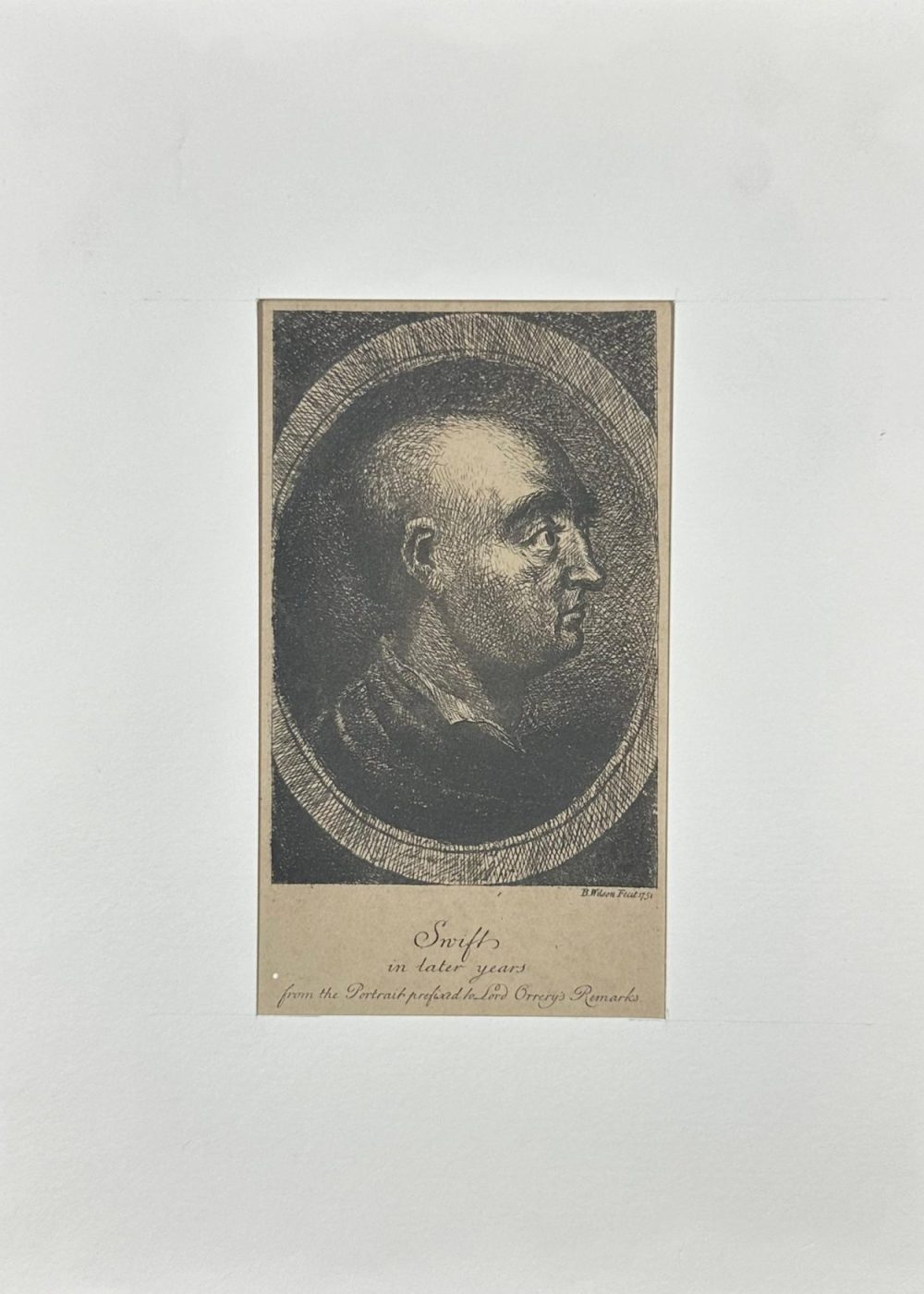 This engraving depicts Jonathan Swift, the celebrated Anglo-Irish satirist best known for Gulliver’s Travels, in his later years. The portrait shows him in profile, facing right, with a serious, contemplative expression and a partially bald head, capturing the marks of age. Below the image, the inscription reads, “Swift in later years from the Portrait prefixed to Lord Orrery’s Remarks,” referencing a known source of his likeness. The engraving is signed “B. Wilson Fecit 1751”, indicating it was created by Benjamin Wilson.