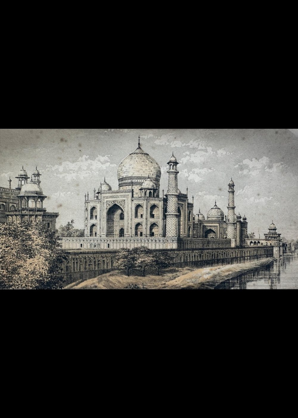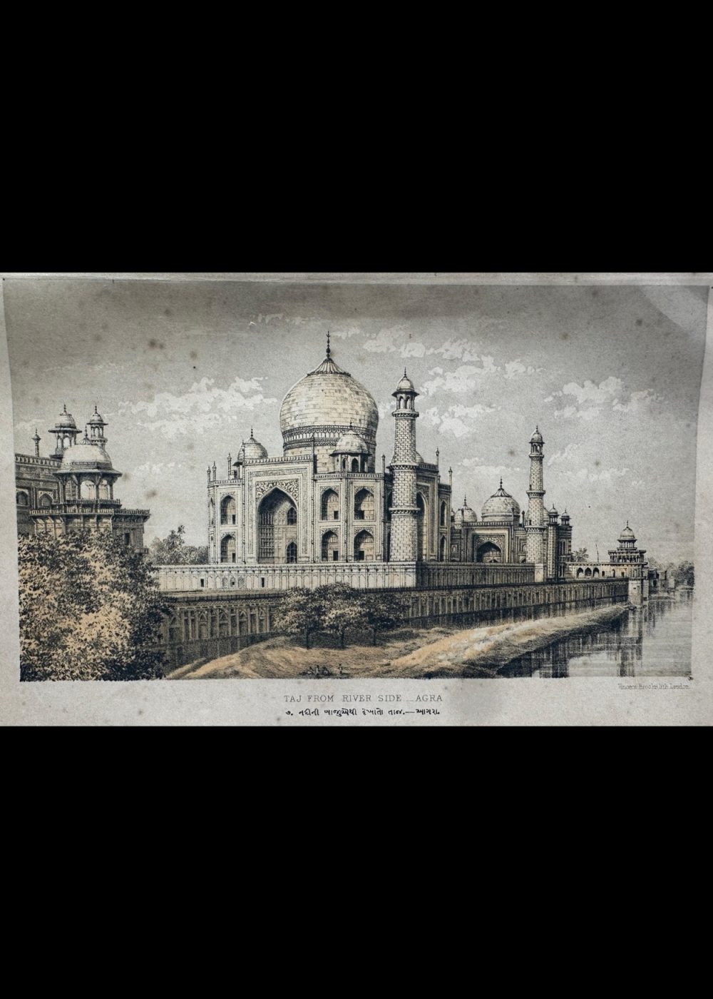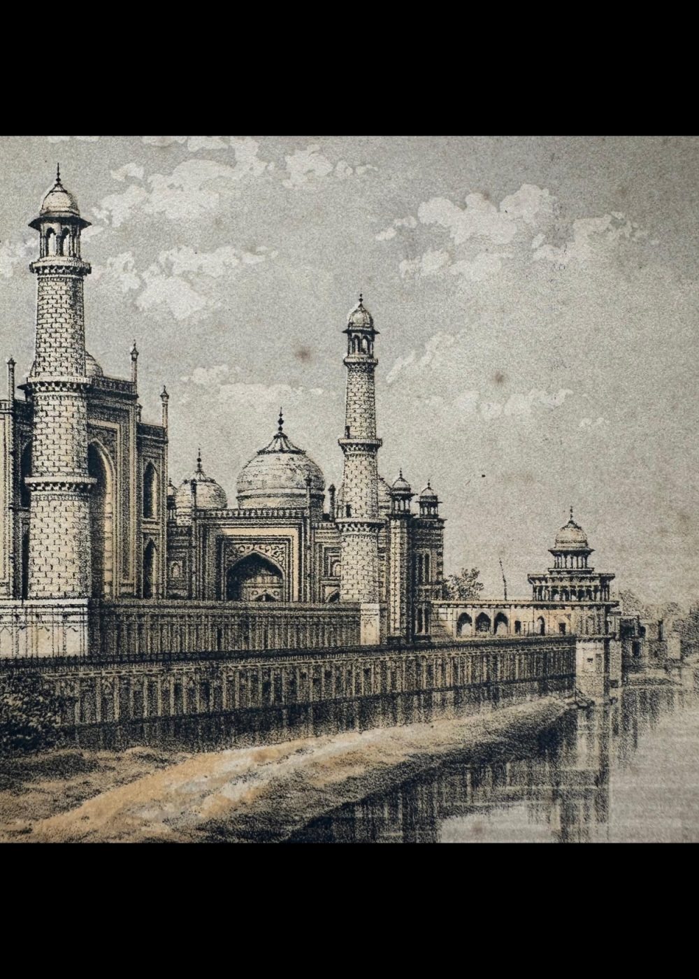 This elegant chromolithograph captures a picturesque view of the Taj Mahal from the Yamuna River, emphasizing the monument’s perfect symmetry and tranquil setting. The artist’s delicate rendering of light and shadow highlights the gleaming marble dome and intricate Mughal architecture. Such prints reflect the 19th-century European fascination with India’s imperial monuments and their timeless beauty as seen through the lens of travel and exploration.