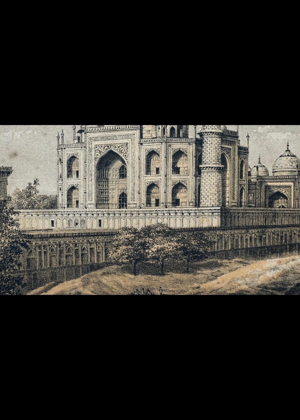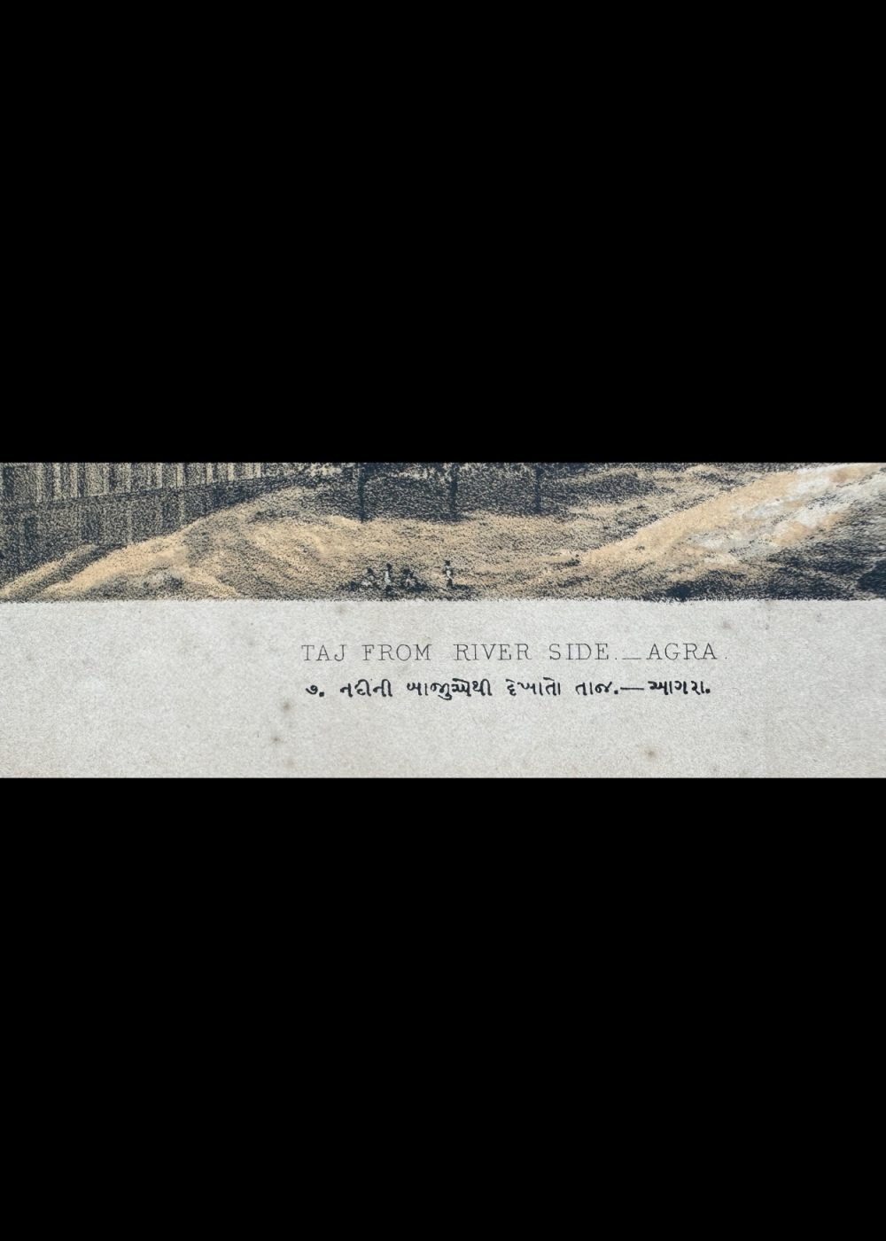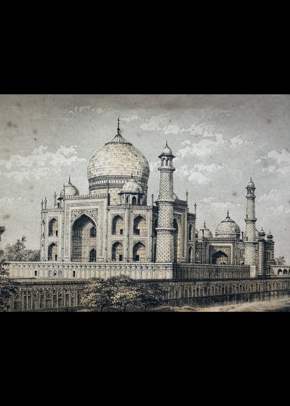 This elegant chromolithograph captures a picturesque view of the Taj Mahal from the Yamuna River, emphasizing the monument’s perfect symmetry and tranquil setting. The artist’s delicate rendering of light and shadow highlights the gleaming marble dome and intricate Mughal architecture. Such prints reflect the 19th-century European fascination with India’s imperial monuments and their timeless beauty as seen through the lens of travel and exploration.