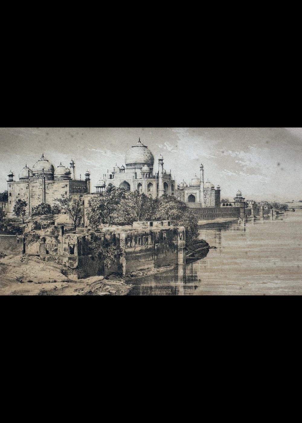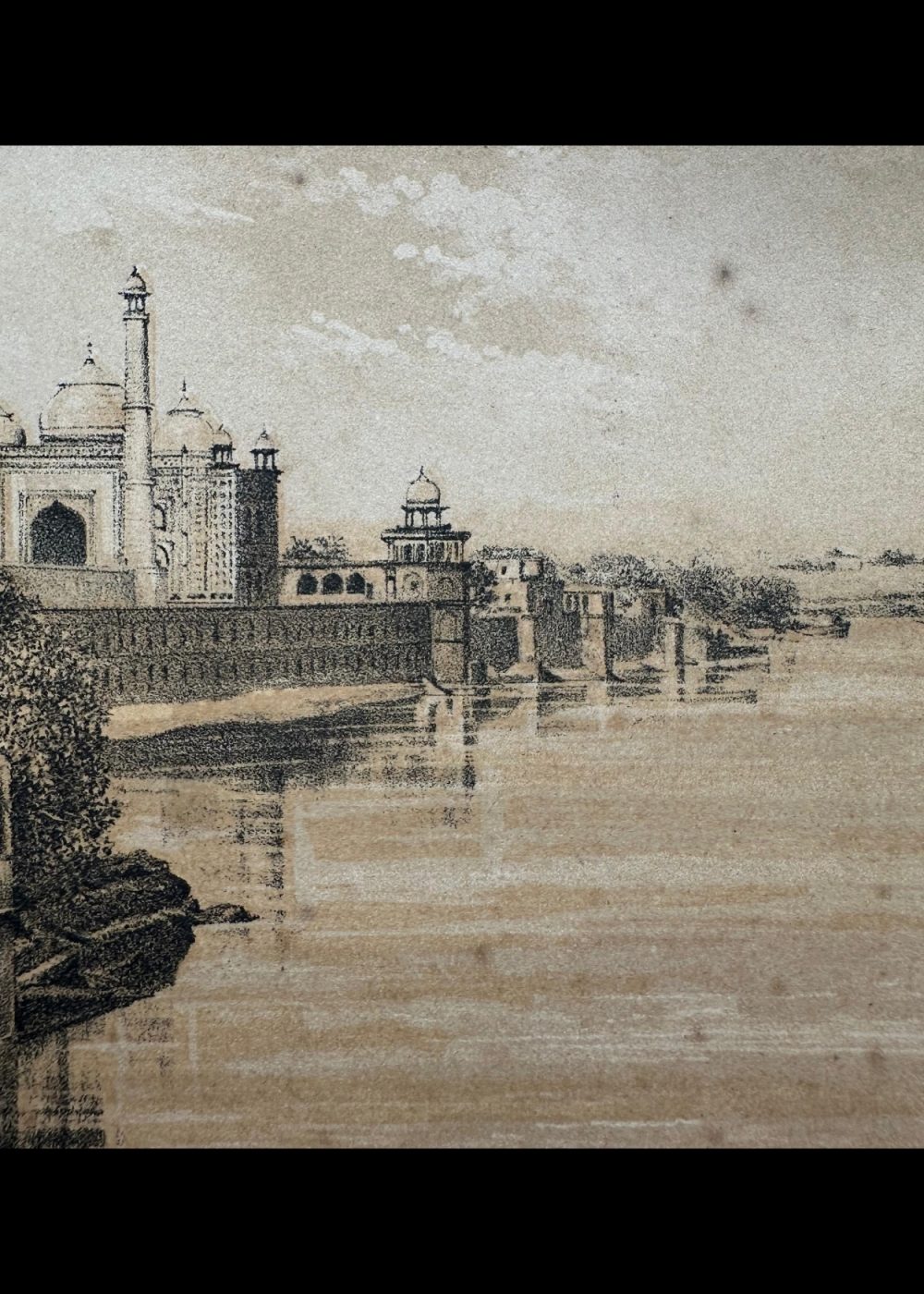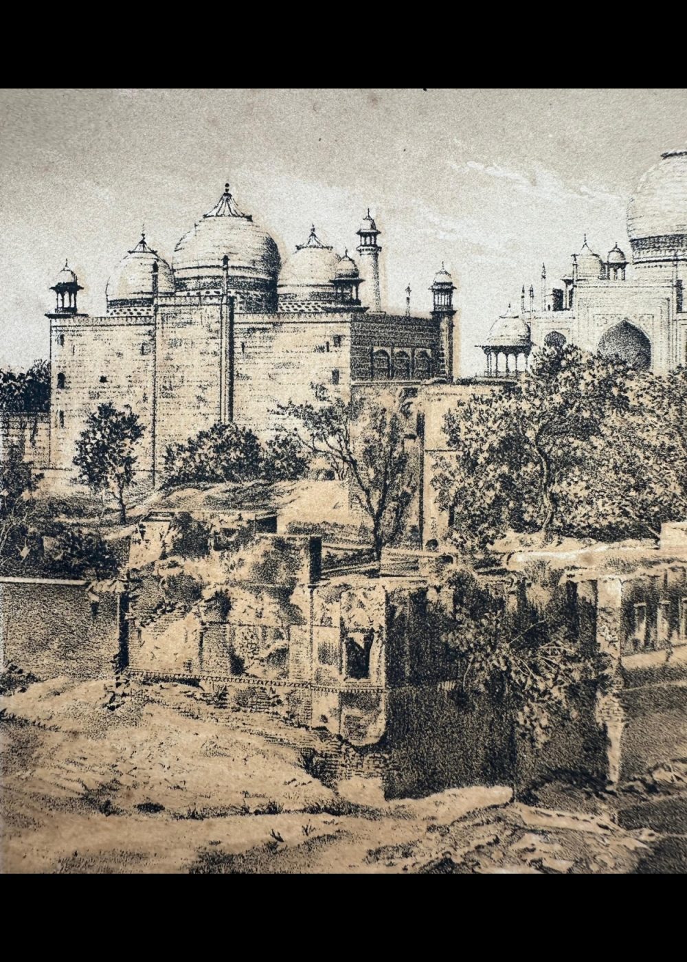 This evocative chromolithograph presents the Taj Mahal as seen from the remains of a nearby ruined palace along the Yamuna River. The artist contrasts the decaying foreground structures with the enduring perfection of the Taj, symbolizing the passage of time against the timelessness of Mughal art and architecture. The soft sepia tones and fine detailing reflect the 19th-century traveler’s romantic fascination with India’s imperial past and its monuments of eternal love.