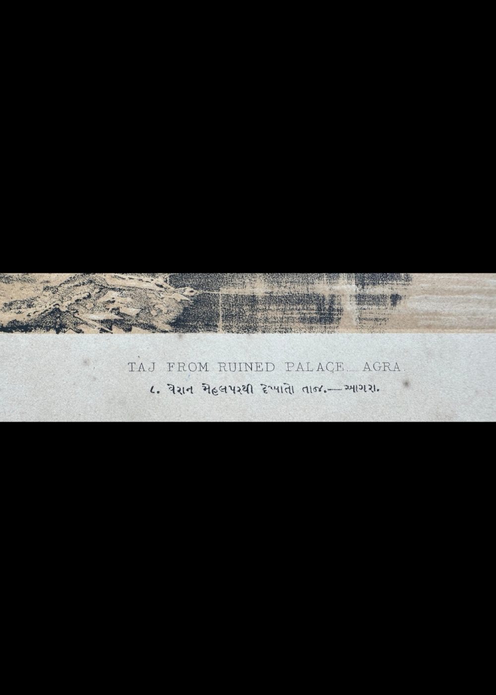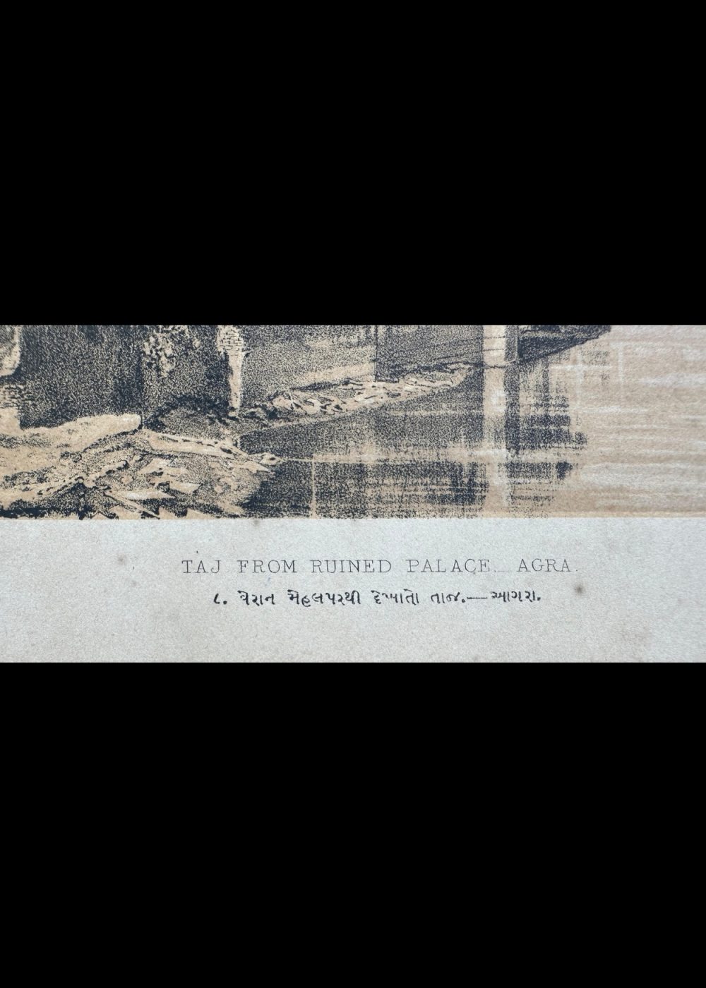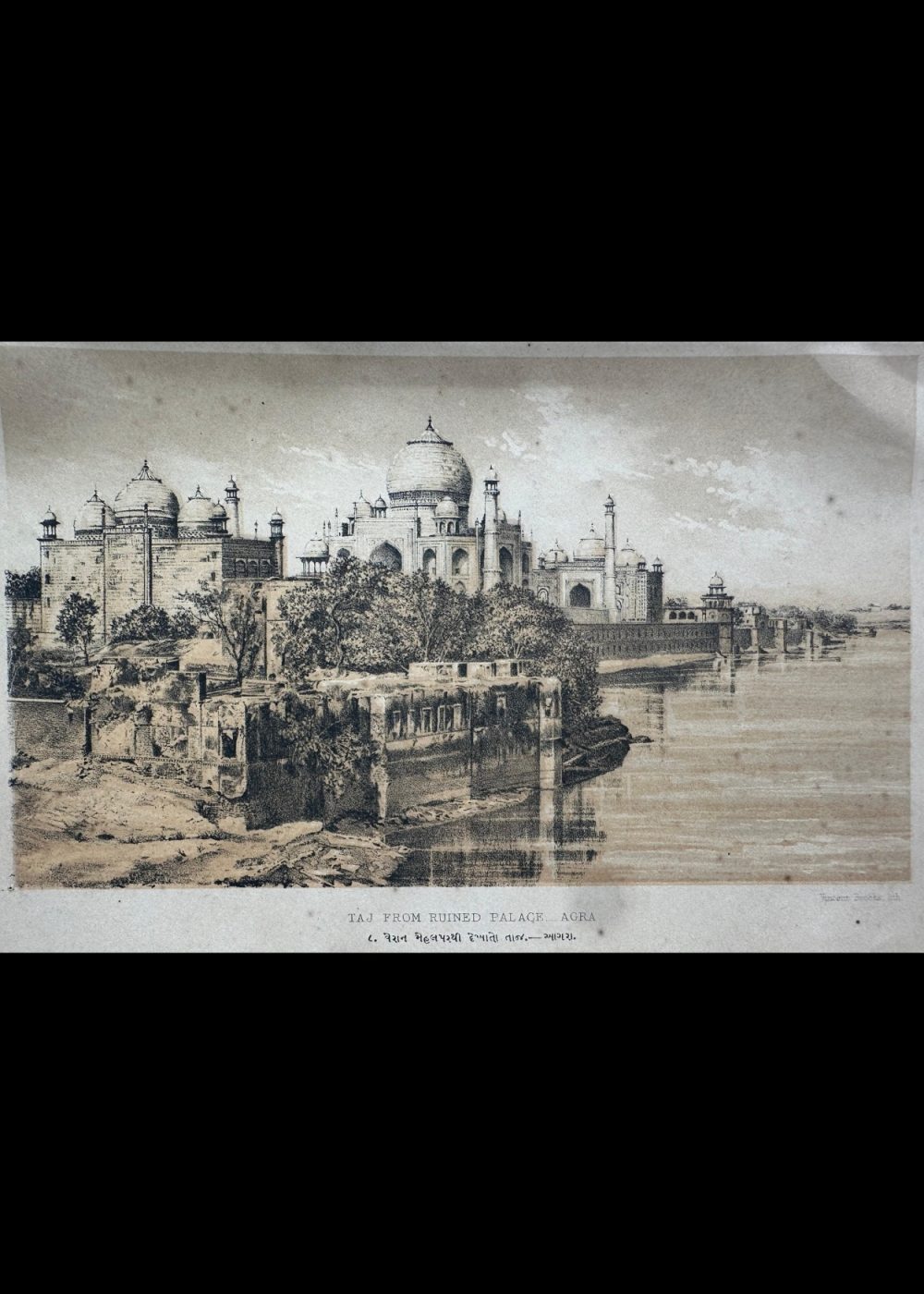 This evocative chromolithograph presents the Taj Mahal as seen from the remains of a nearby ruined palace along the Yamuna River. The artist contrasts the decaying foreground structures with the enduring perfection of the Taj, symbolizing the passage of time against the timelessness of Mughal art and architecture. The soft sepia tones and fine detailing reflect the 19th-century traveler’s romantic fascination with India’s imperial past and its monuments of eternal love.