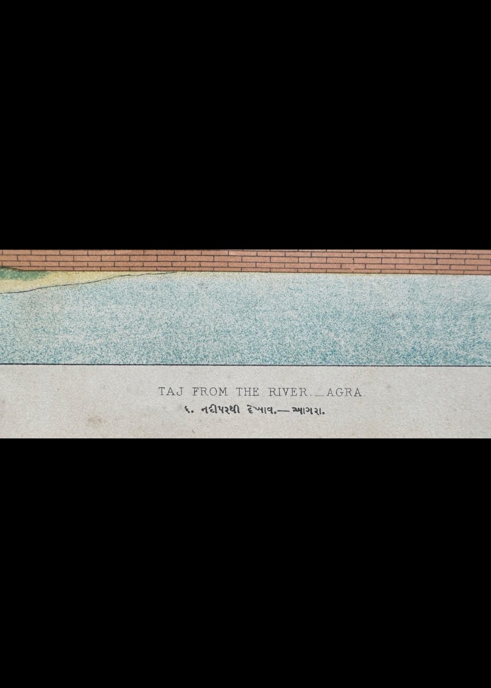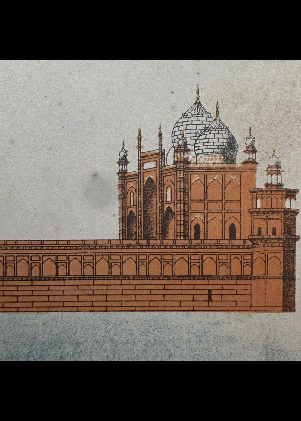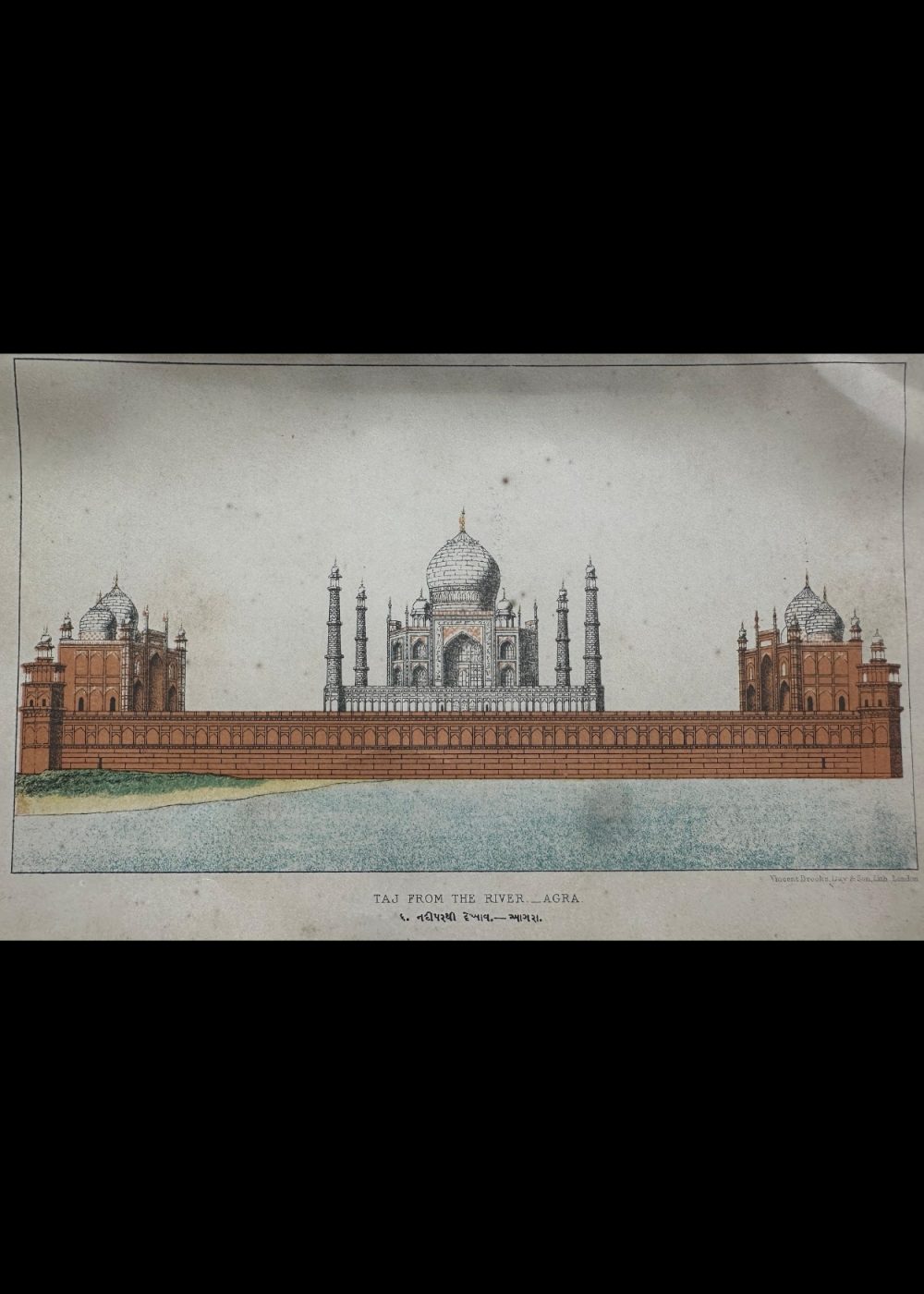 This finely detailed chromolithograph presents a serene view of the Taj Mahal as seen from the Yamuna River. The composition captures the architectural symmetry of the mausoleum, flanked by its red sandstone mosque and guest pavilion. The soft coloration and precise linework evoke the quiet majesty of Shah Jahan’s masterpiece, reflecting the 19th-century fascination with India’s Mughal monuments.
