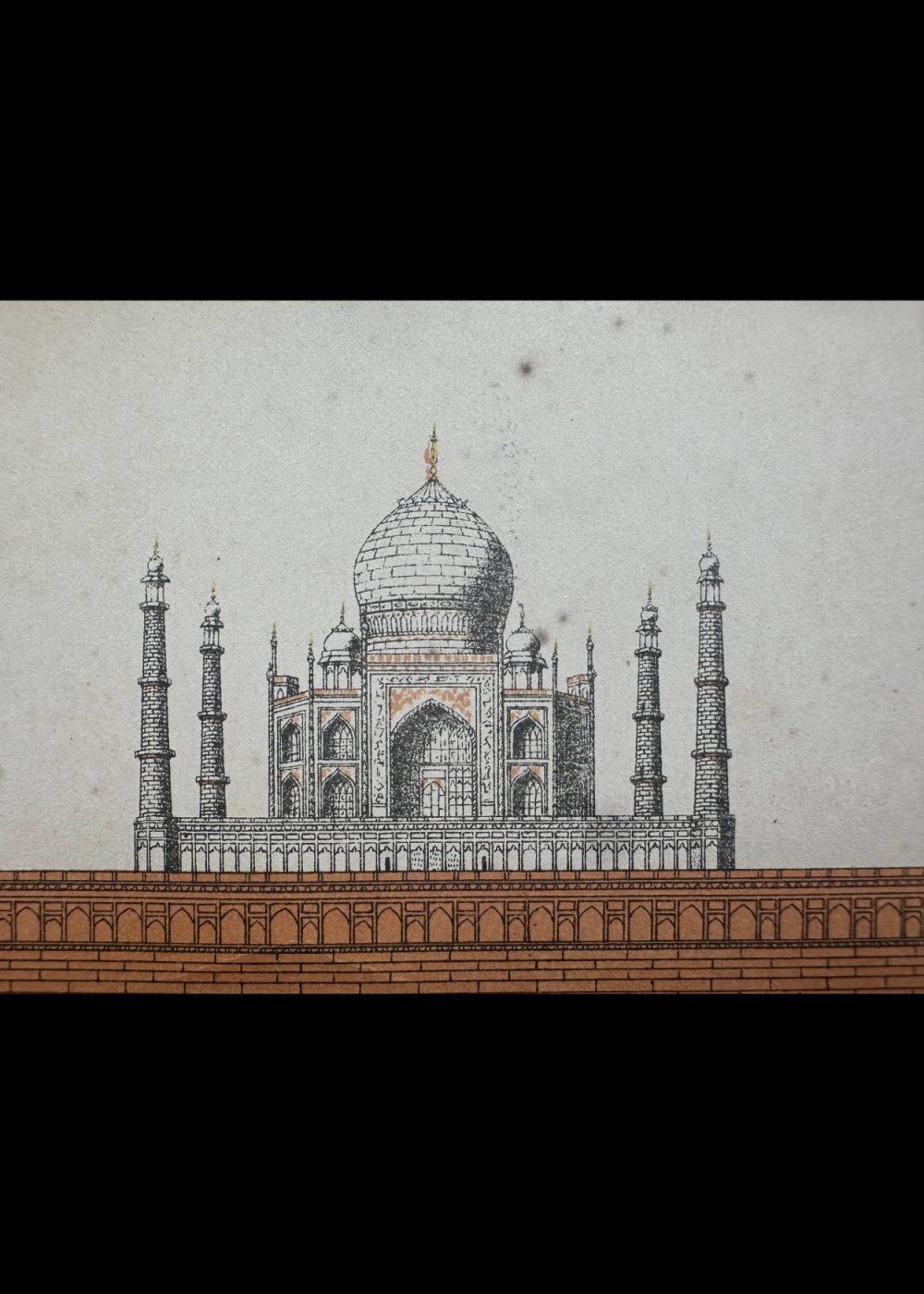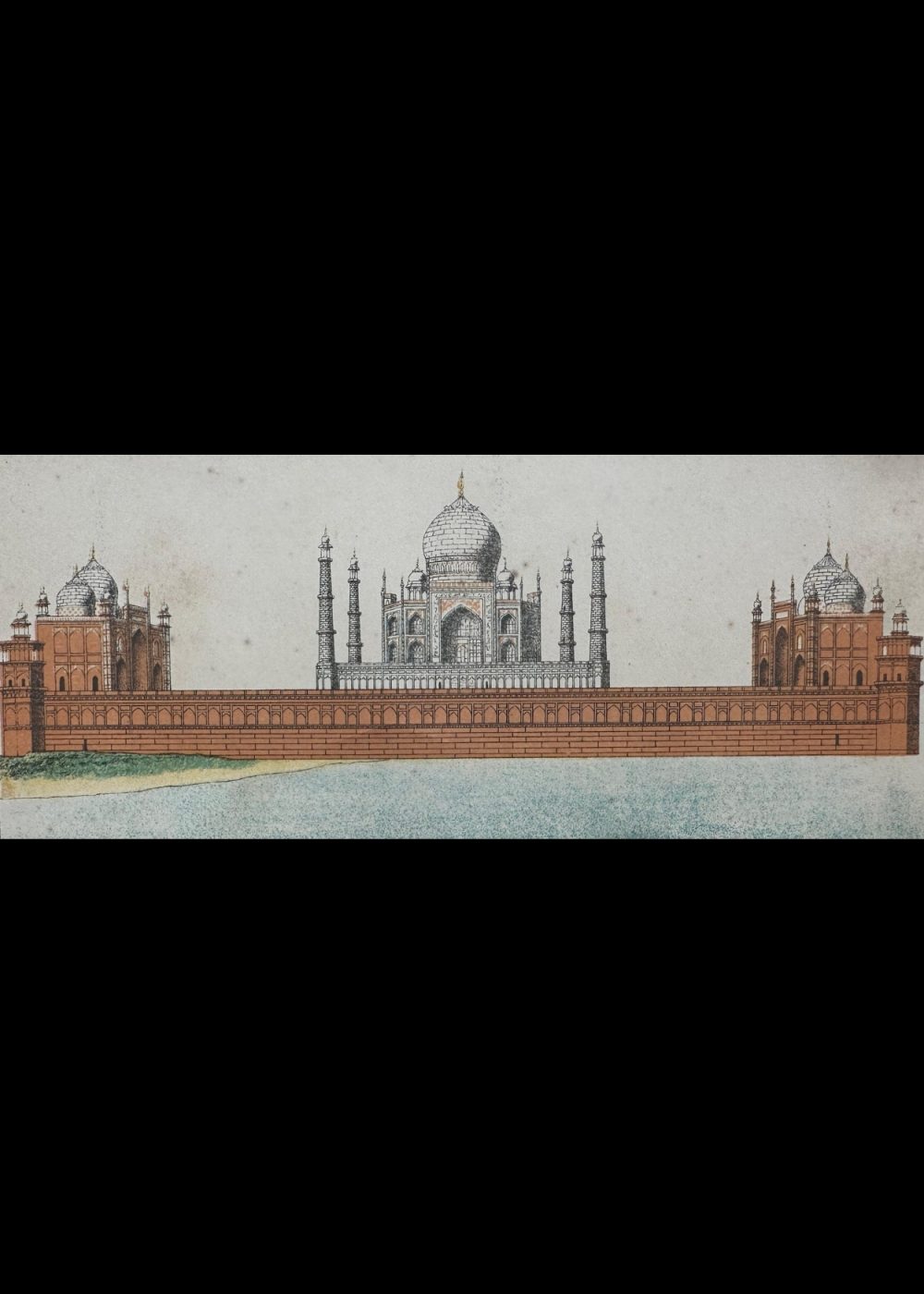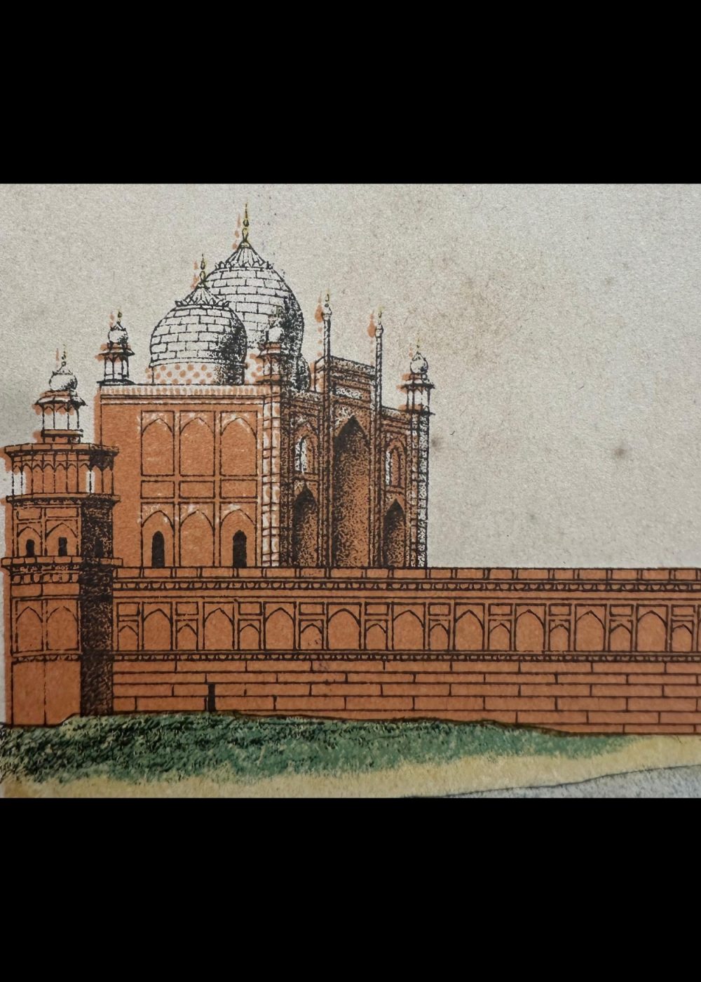 This finely detailed chromolithograph presents a serene view of the Taj Mahal as seen from the Yamuna River. The composition captures the architectural symmetry of the mausoleum, flanked by its red sandstone mosque and guest pavilion. The soft coloration and precise linework evoke the quiet majesty of Shah Jahan’s masterpiece, reflecting the 19th-century fascination with India’s Mughal monuments.