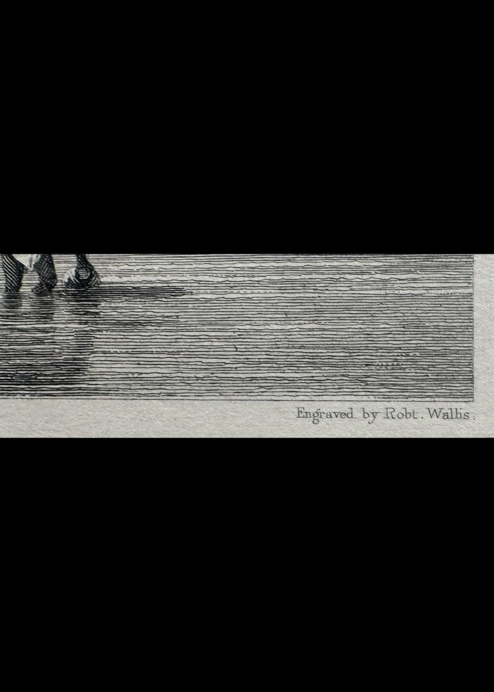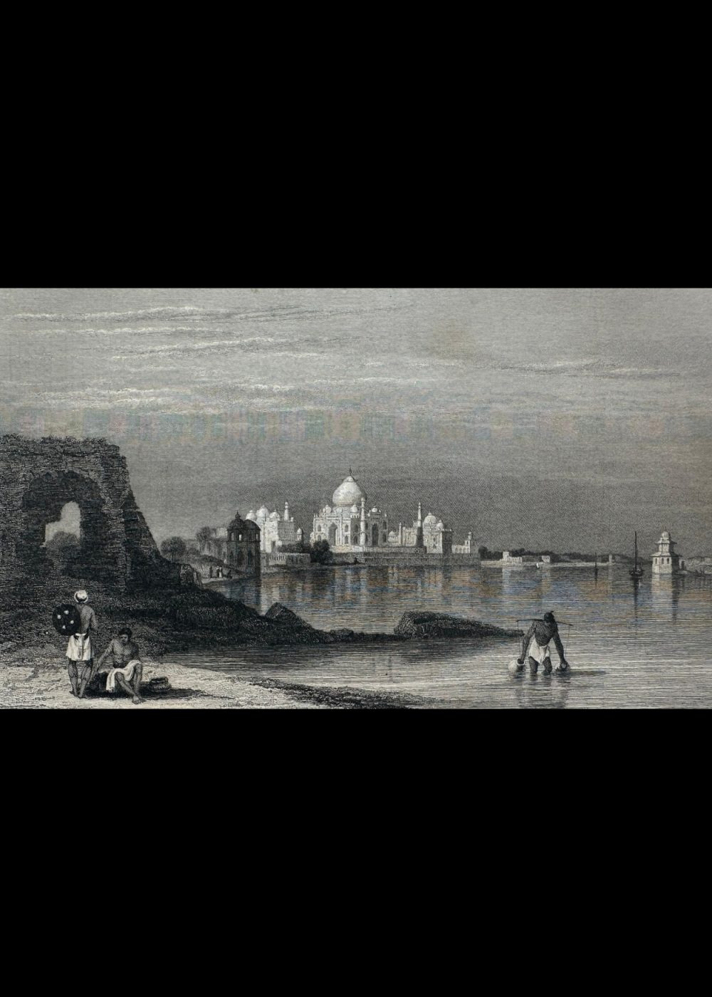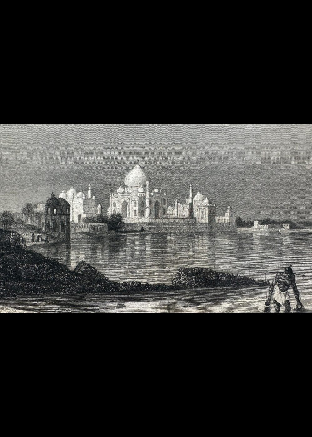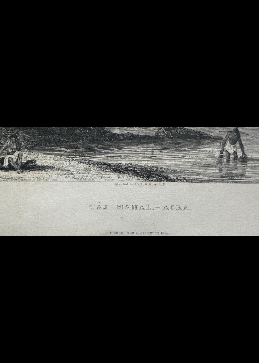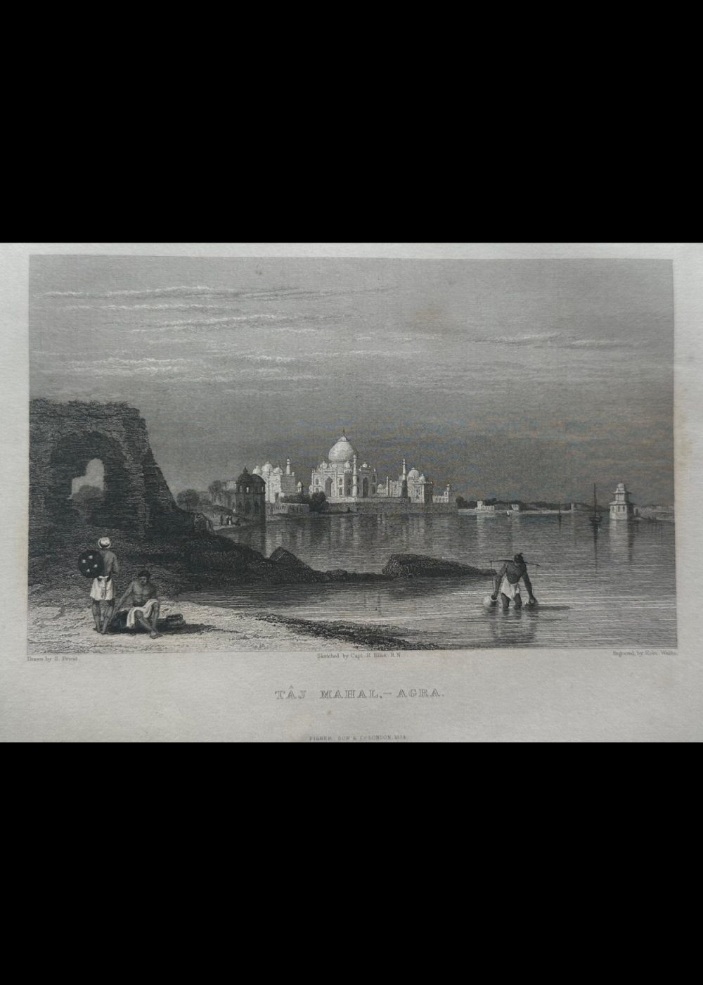 This engraving, titled “Jumma Musjid, Mandoo,” is part of the India China book and showcases a detailed depiction of the Jumma Mosque in Mandu, India. The artwork is sketched by Captain R. Elliot, R.N., with engraving by J. Kernot and drawn by S. Austin. The scene captures the mosque’s ruined, yet grand, architectural beauty amidst lush greenery and expansive grounds. The mosque’s domed structures, arched windows, and crumbled walls are highlighted, evoking a sense of historical grandeur and decay. The illustration dates back to 1844 and reflects the romanticized view of India’s architecture during the colonial period.