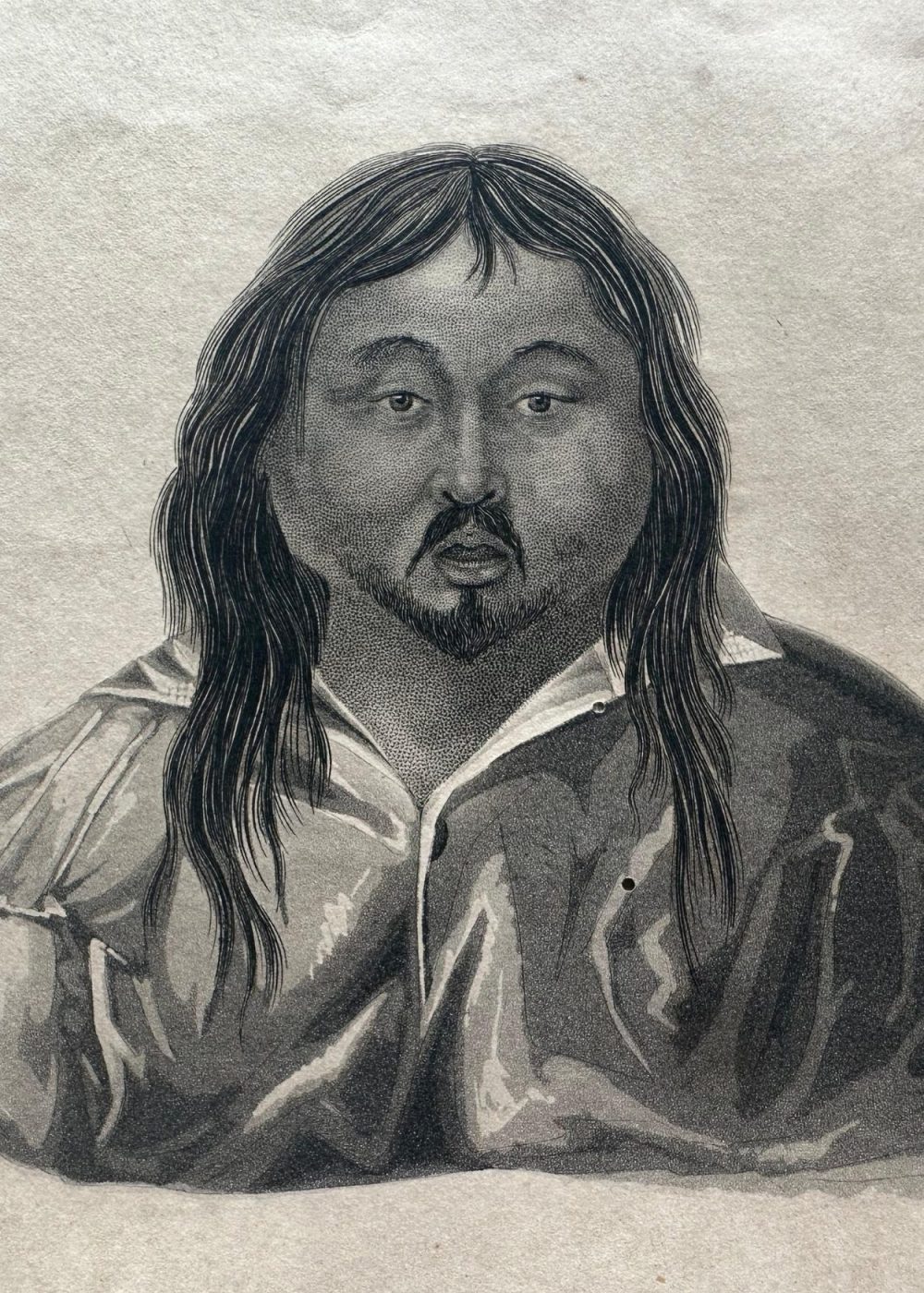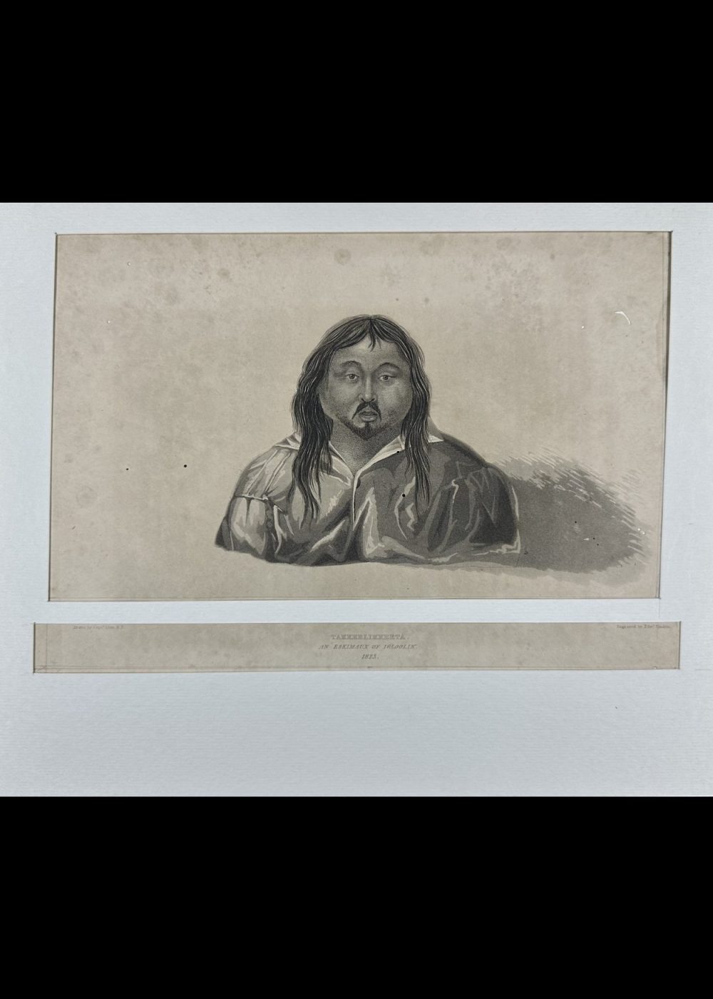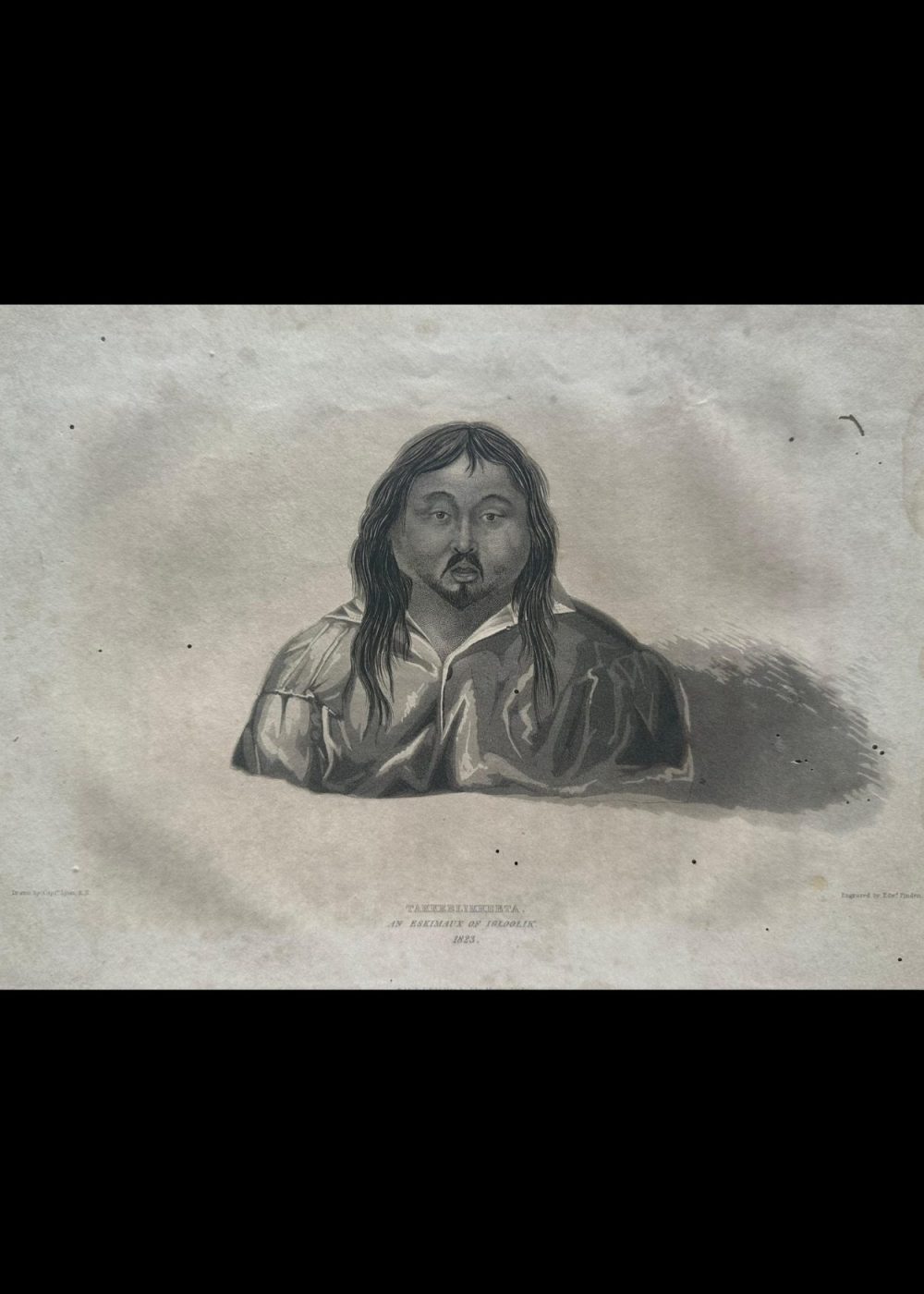 This finely rendered portrait, drawn by Captain Lyon R.N. and engraved by Edward Finden, depicts Tattarellecheta, an Inuit (Esquimaux) man from Igloolik, captured during an Arctic expedition in 1823. The subject is portrayed with expressive detail, wearing traditional clothing and gazing directly at the viewer. The artwork serves as a valuable ethnographic record of early 19th-century Arctic inhabitants, reflecting both the individuality and cultural identity of the Inuit people encountered by British explorers during their voyages of discovery.