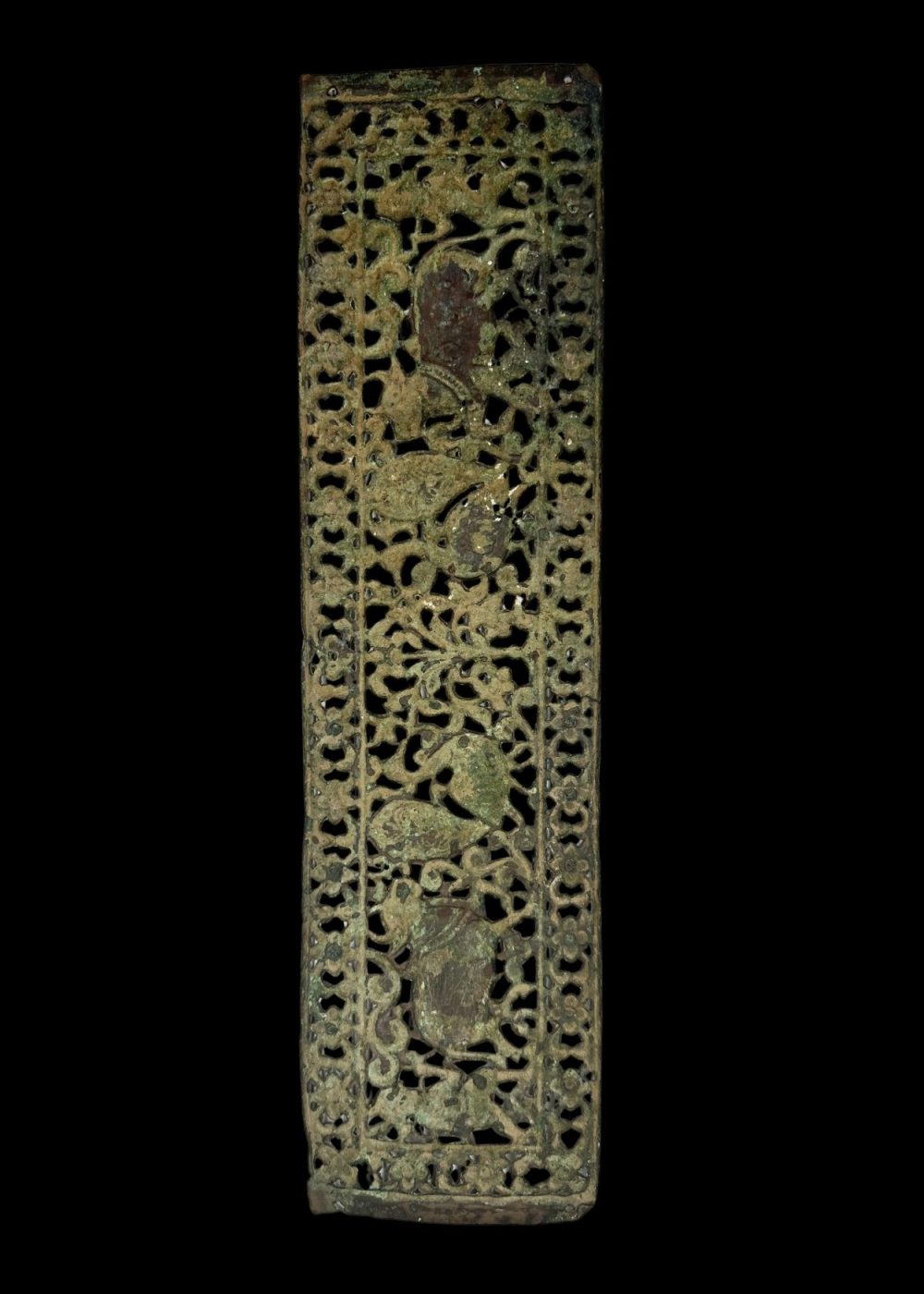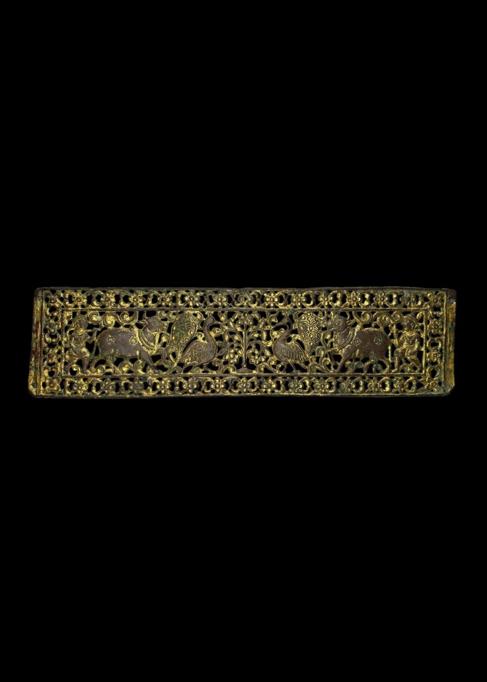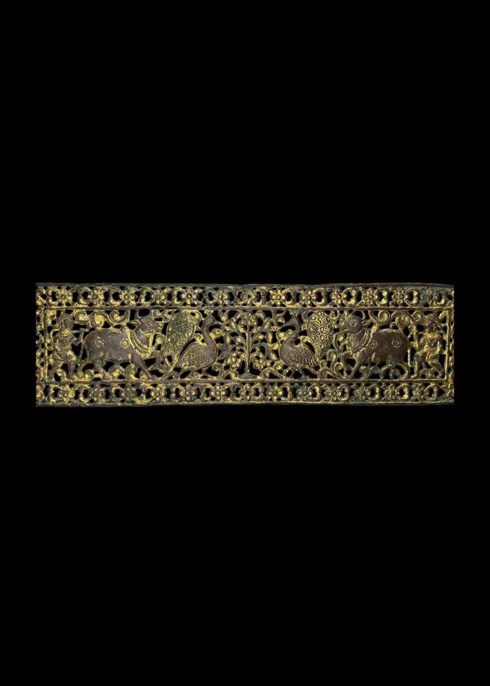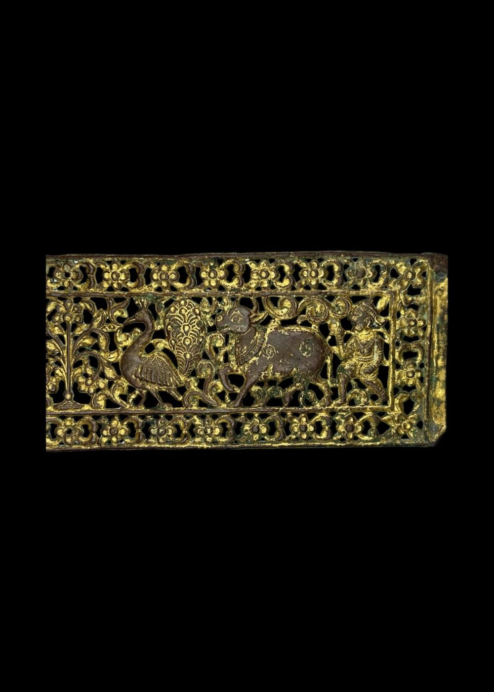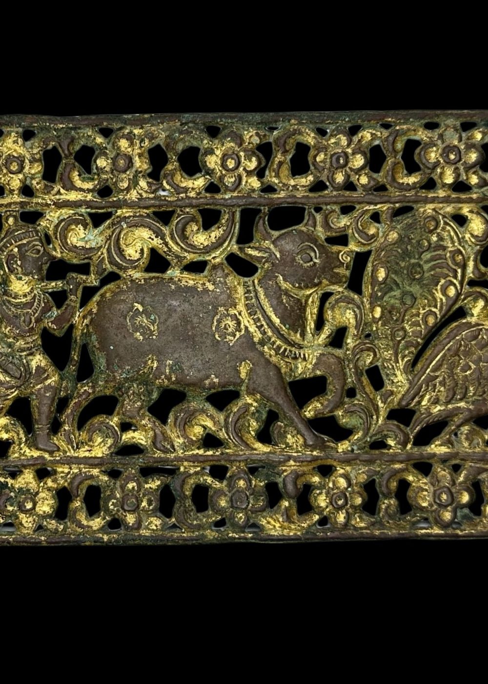 This rectangular bronze temple backdrop, known as a khanpat, exemplifies the ceremonial artistry of Western India. The panel’s raised relief depicts a symmetrical composition: a pair of peacocks flank a central floral emblem, while side registers feature human figures leading humped bulls in procession—possibly representing devotees or pastoral scenes. Ornamental borders of vine tendrils and punched floral motifs frame the design, enhancing its visual rhythm. Crafted with repoussé and chased techniques, the khanpat served as a sanctified enclosure within domestic or temple shrines, blending narrative imagery with devotional intent.