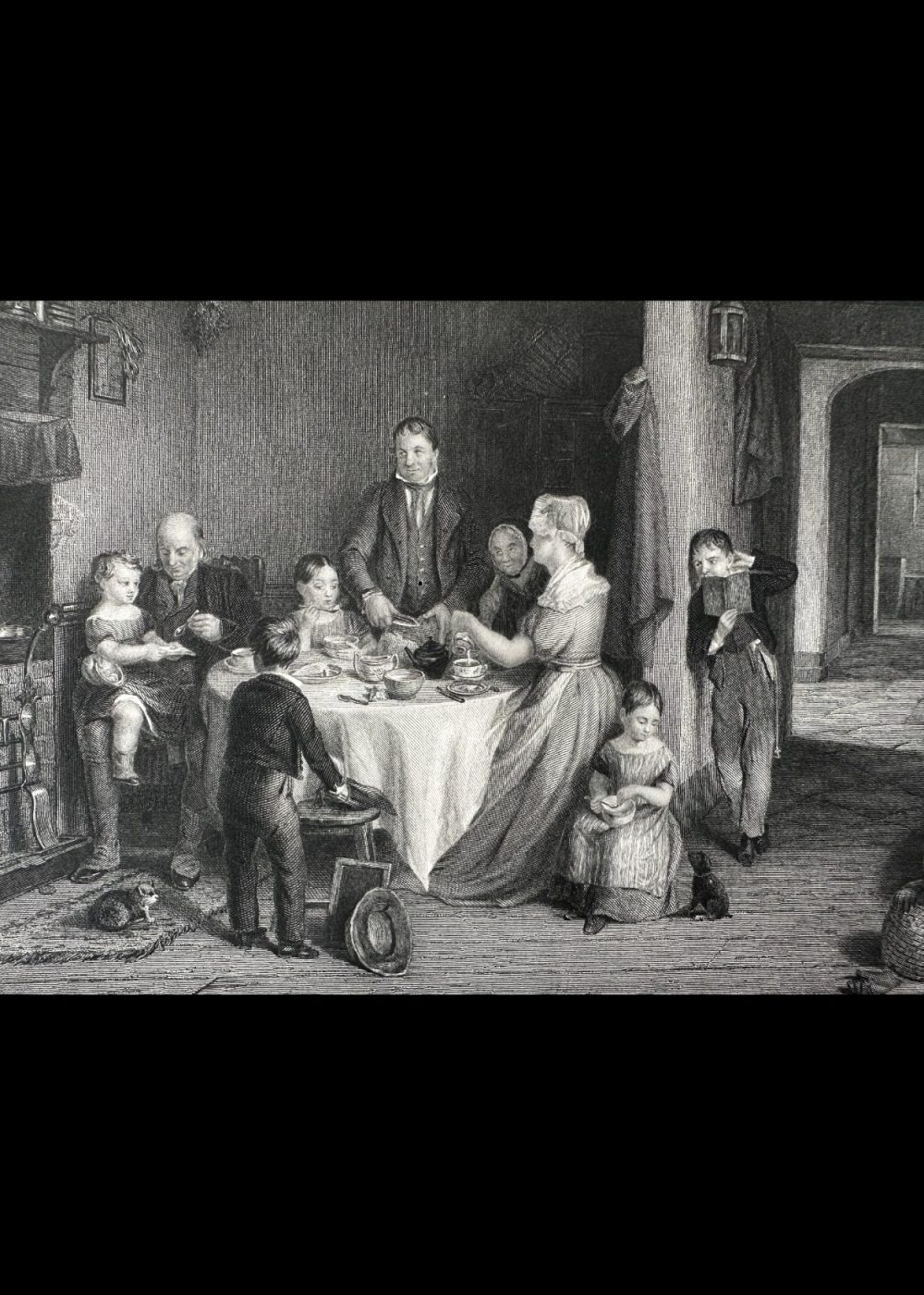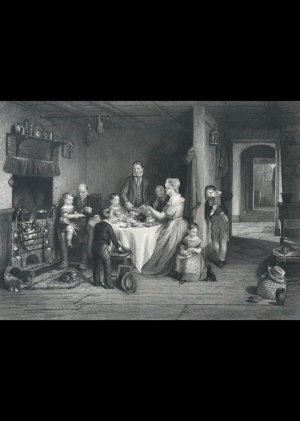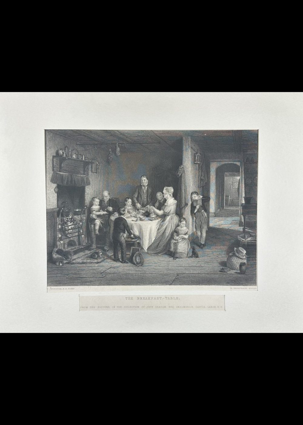 This finely detailed engraving by George Greatbach, based on the work of English genre painter Thomas Webster, beautifully captures a heartwarming domestic scene centered around a humble breakfast table. Set in a rustic interior with wooden beams and modest furnishings, the image illustrates a moment of familial harmony and routine in a rural English household. At the table, a mother serves food while surrounded by children and elders, each figure engaged in subtle, individual actions—eating, conversing, or observing. A man stands at the head, perhaps the patriarch, overseeing the gathering. On the periphery, a young girl warms herself by a stove while a boy pulls off his boots, a gesture that suggests the transition from work or outdoor activity into the familial space. The engraving vividly conveys the warmth of family bonds and the simple comforts of home life. Greatbach’s skillful use of light and shadow, along with Webster’s talent for capturing human expressions and gestures, makes this an evocative tribute to 19th-century English domestic ideals. The Breakfast Table is a touching visual narrative of everyday life, reflecting values of unity, care, and modest prosperity during the Victorian era.