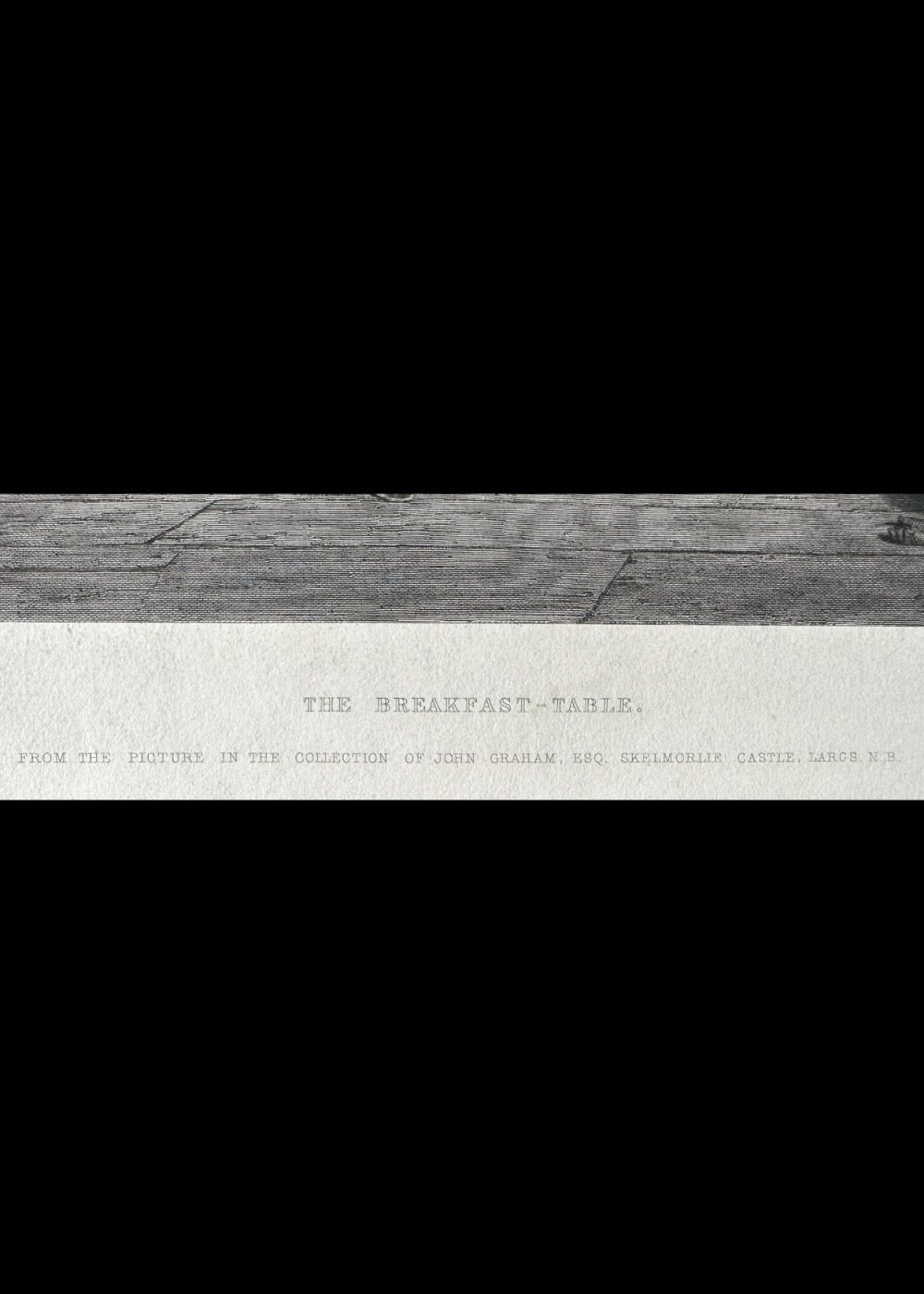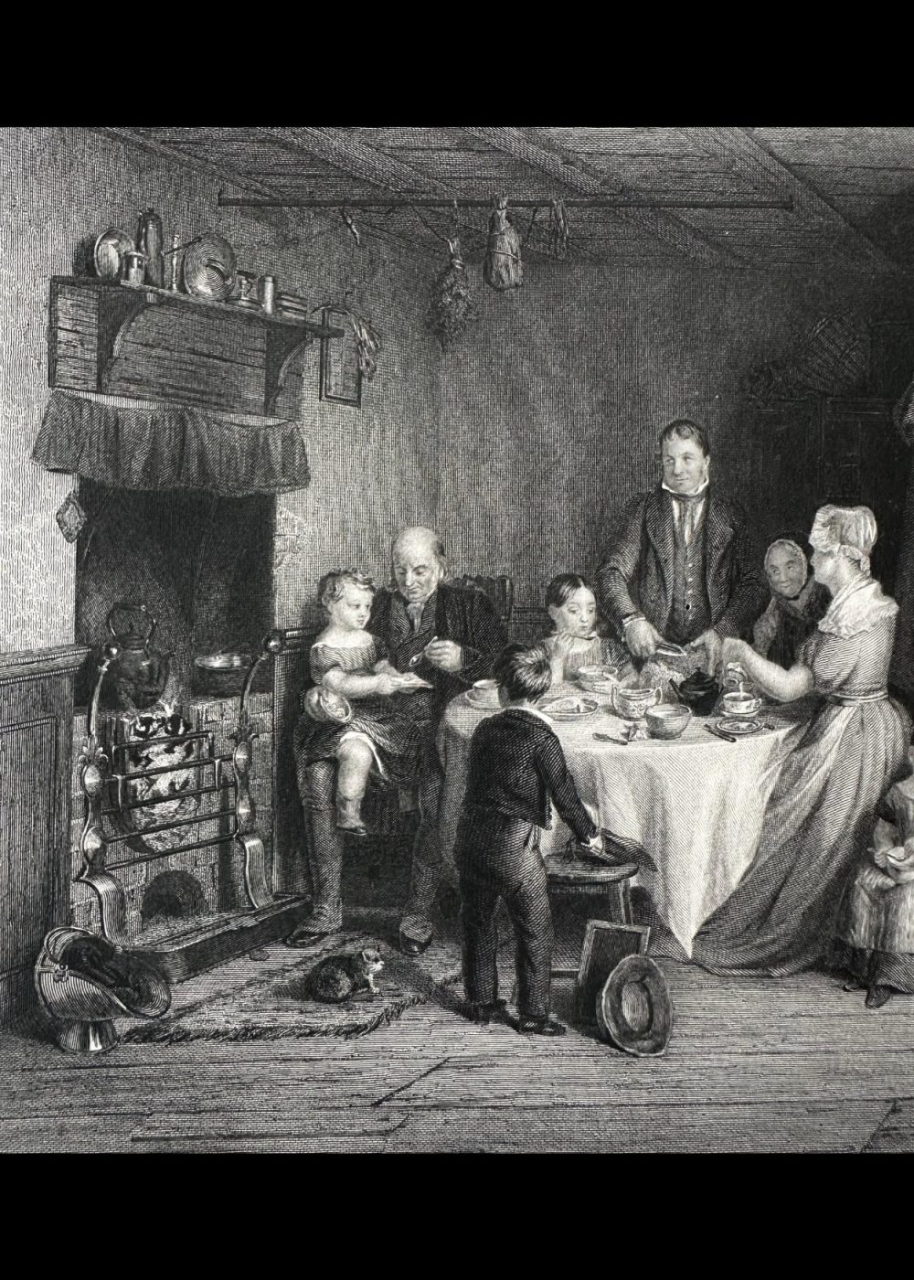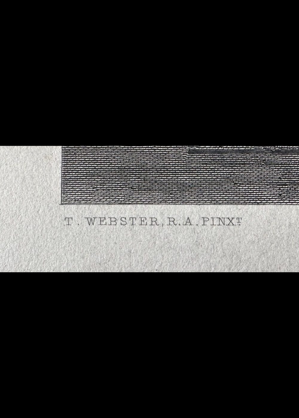 This finely detailed engraving by George Greatbach, based on the work of English genre painter Thomas Webster, beautifully captures a heartwarming domestic scene centered around a humble breakfast table. Set in a rustic interior with wooden beams and modest furnishings, the image illustrates a moment of familial harmony and routine in a rural English household. At the table, a mother serves food while surrounded by children and elders, each figure engaged in subtle, individual actions—eating, conversing, or observing. A man stands at the head, perhaps the patriarch, overseeing the gathering. On the periphery, a young girl warms herself by a stove while a boy pulls off his boots, a gesture that suggests the transition from work or outdoor activity into the familial space. The engraving vividly conveys the warmth of family bonds and the simple comforts of home life. Greatbach’s skillful use of light and shadow, along with Webster’s talent for capturing human expressions and gestures, makes this an evocative tribute to 19th-century English domestic ideals. The Breakfast Table is a touching visual narrative of everyday life, reflecting values of unity, care, and modest prosperity during the Victorian era.