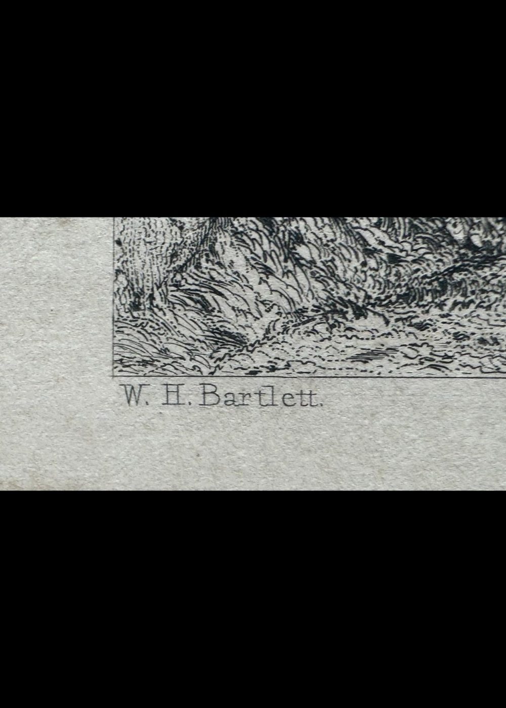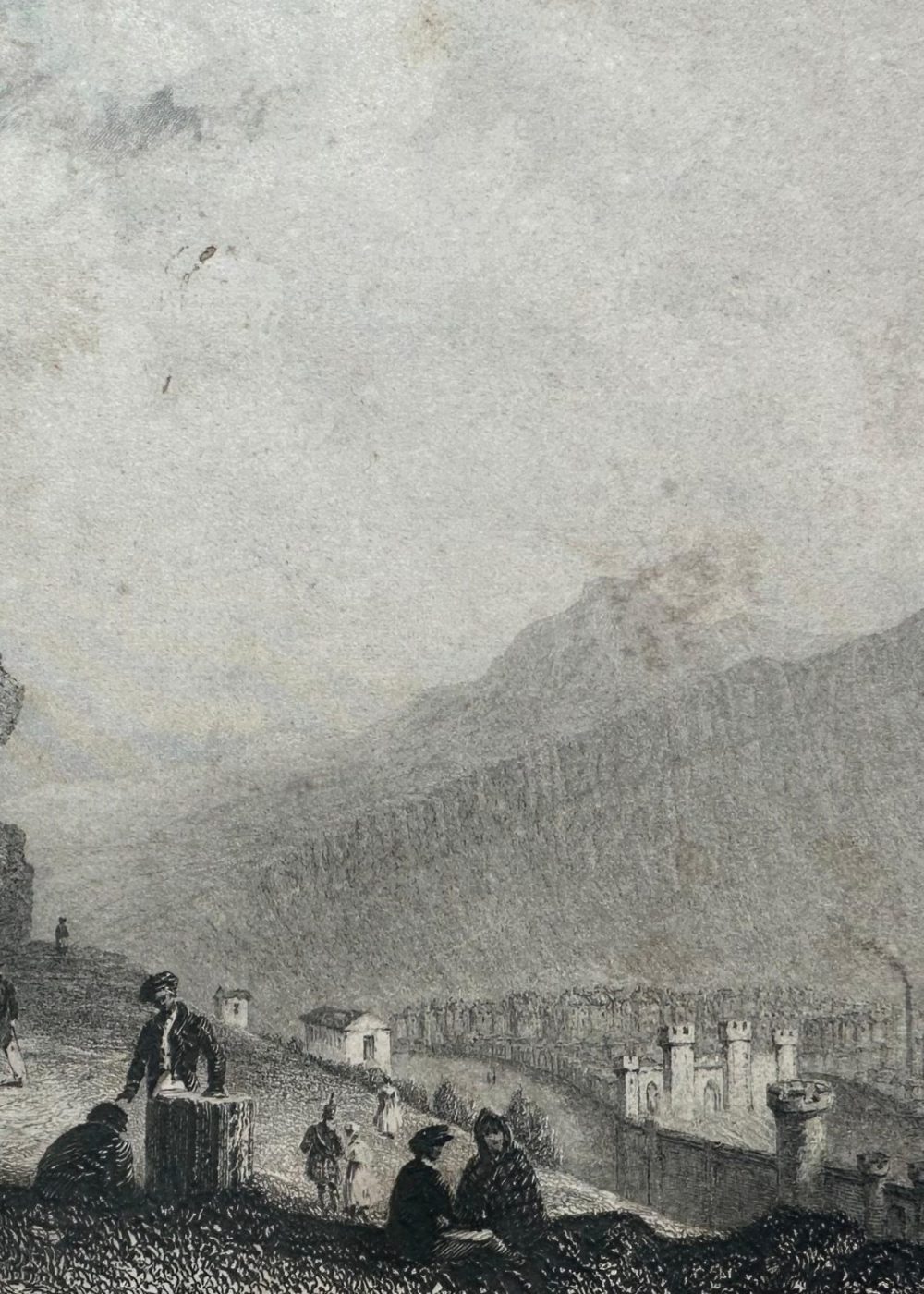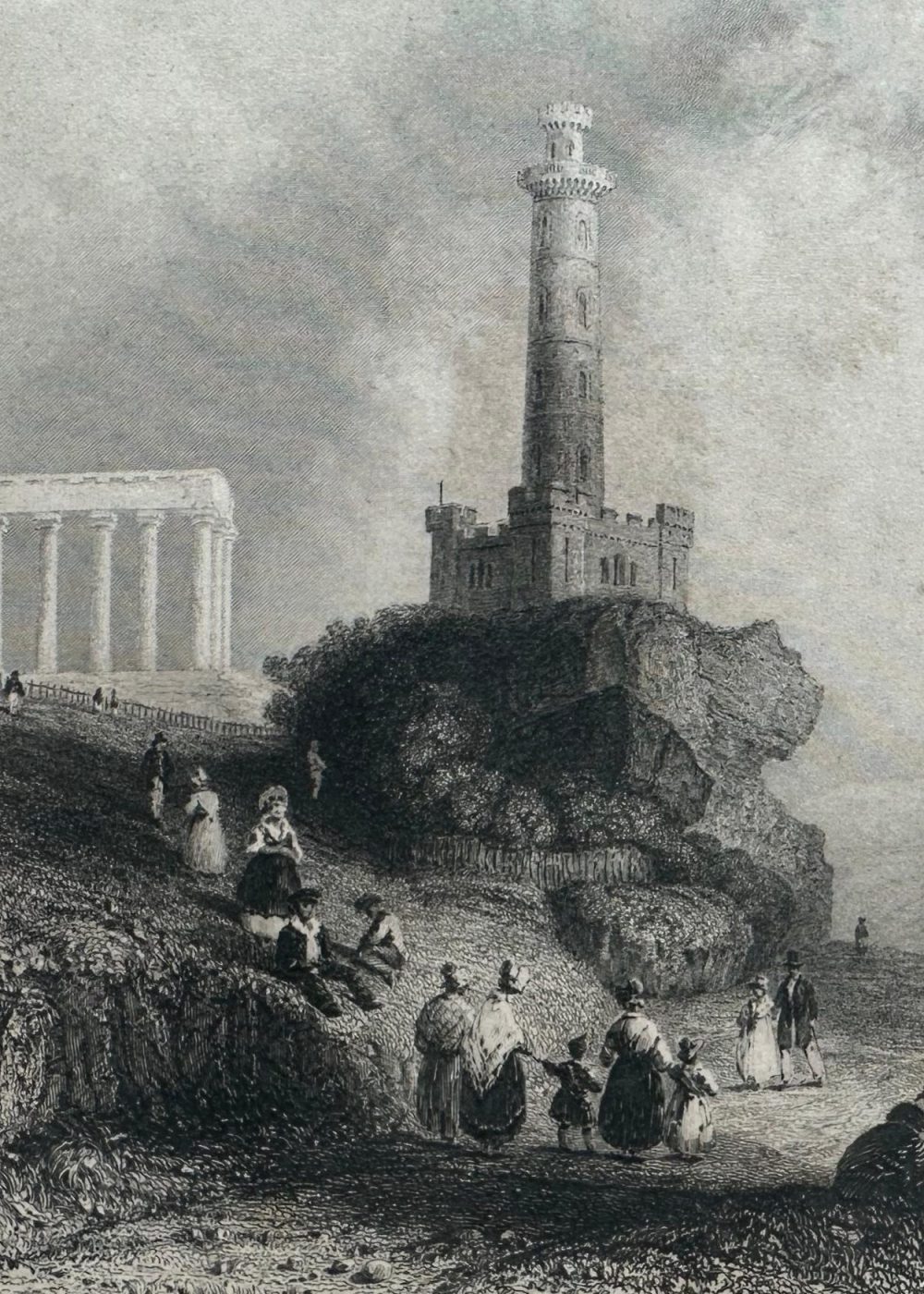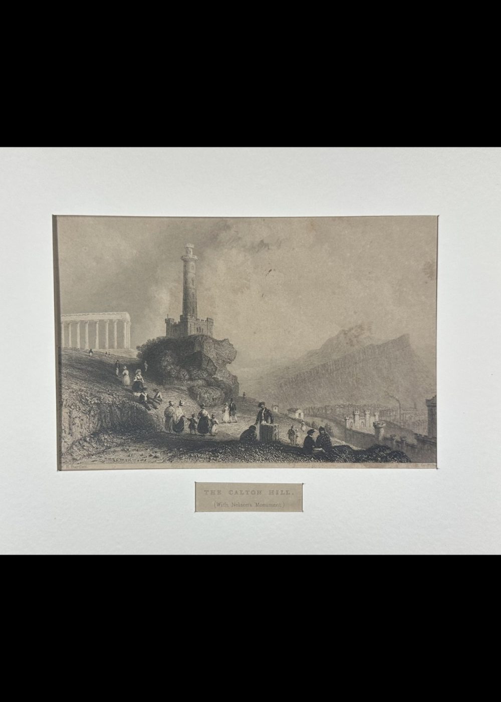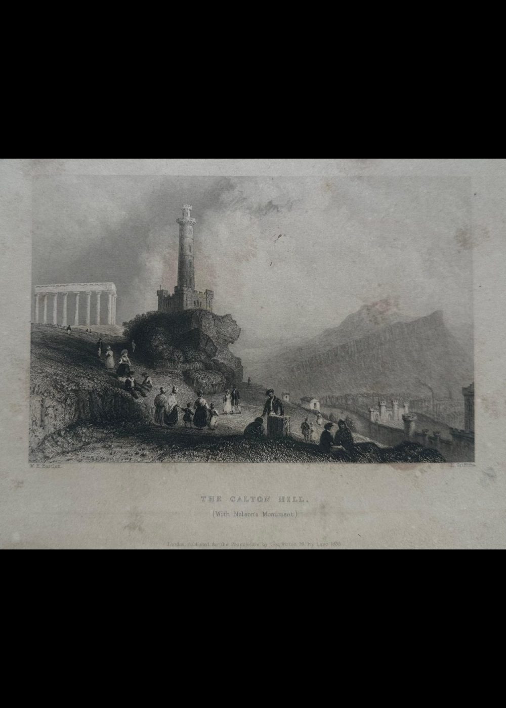 This historic engraving titled “The Calton Hill (With Nelson’s Monument)” was drawn by W. H. Bartlett and engraved by H. Griffiths. It presents a dramatic and elevated view of Calton Hill in Edinburgh, a location known for its striking neoclassical monuments and panoramic vistas of the city. In the center of the scene rises Nelson’s Monument, a tall cylindrical tower built in honor of Admiral Lord Nelson’s victory at Trafalgar. Perched atop a rocky prominence, it commands a dominant position in the composition. To the left, the unfinished National Monument, designed to resemble the Parthenon, stretches across the hill, adding classical grandeur to the landscape. The foreground is alive with people—families, couples, and individuals—some climbing the hill, others resting or enjoying the view. Their 19th-century attire and leisurely presence add life and historical context to the setting. In the background to the right, the craggy profile of Arthur’s Seat looms beneath a misty sky, reinforcing the dramatic topography of Edinburgh. Below the hill, the city’s castle-like structures and rooftops are faintly visible, anchoring the hill in its urban context. The engraving blends architectural majesty with social vibrancy and natural beauty. Published in 1838 by Geo. Virtue, 26 Ivy Lane, London, this artwork captures the iconic stature and cultural significance of Calton Hill, a symbol of Edinburgh’s Enlightenment spirit and romantic landscape