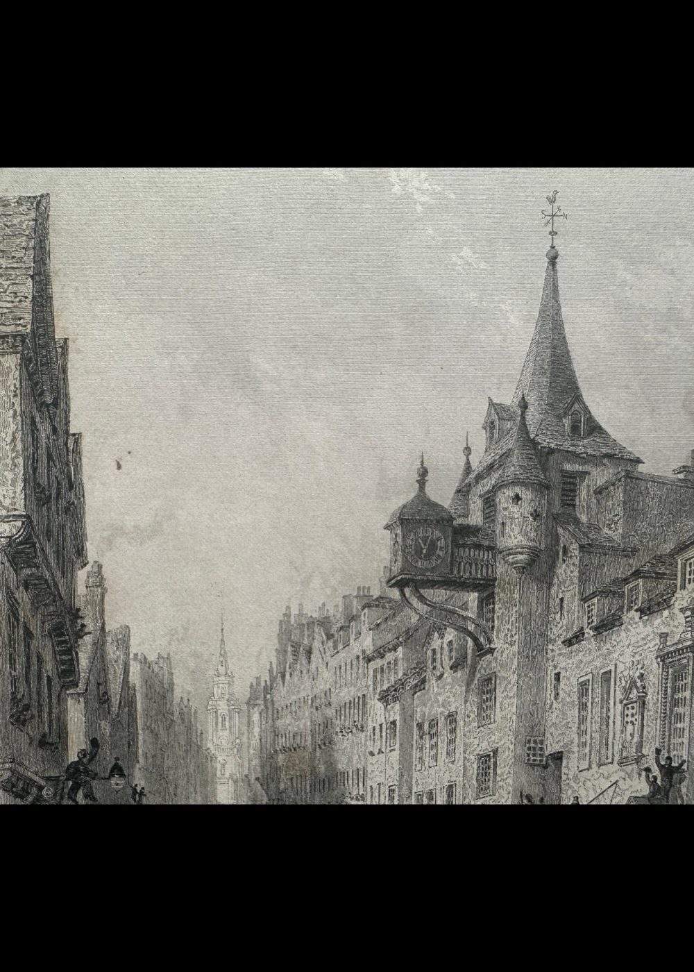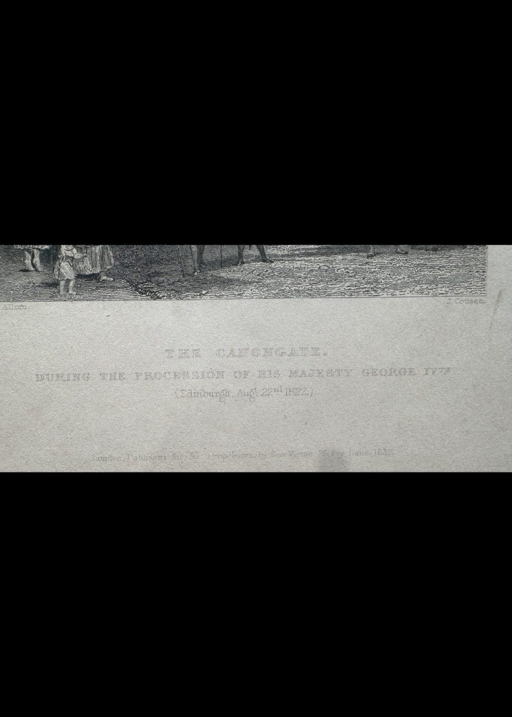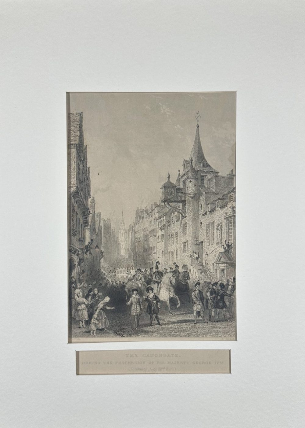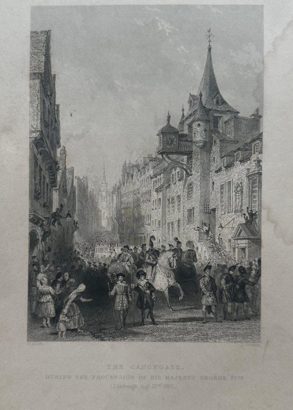 DURING THE PROCESSIONOF HIS MAJESTY GEORGE IVTH EDINBURGH, AUGT. 22ND,1822. The artwork captures a grand royal procession taking place on the Canongate, a historic street in Edinburgh, Scotland. The event marks King George IV’s visit to Scotland — the first by a reigning British monarch in nearly two centuries. In the foreground, crowds of townspeople gather to watch the event. Many wear traditional Scottish dress, including kilts and bonnets. Soldiers and officials in ceremonial uniform lead and follow behind a mounted guard, with horses and richly dressed figures filling the street. The king’s carriage is visible further down the road, surrounded by spectators. The street is lined with historic stone buildings, some with turrets, balconies, and ornate clocks, adding depth and texture to the cityscape. In the far distance, the spire of St. Giles’ Cathedral rises into the cloudy sky, symbolizing Edinburgh’s architectural and historical grandeur.The engraving was created by J. Cousen, drawn from nature by T. Allom, and published in 1845, capturing a historic moment of royal pageantry and public celebration in 19th-century Edinburgh.