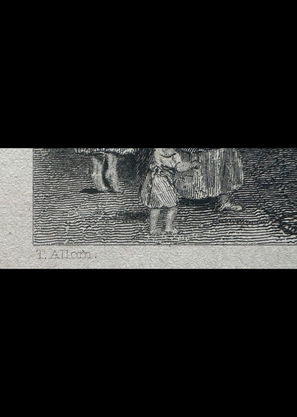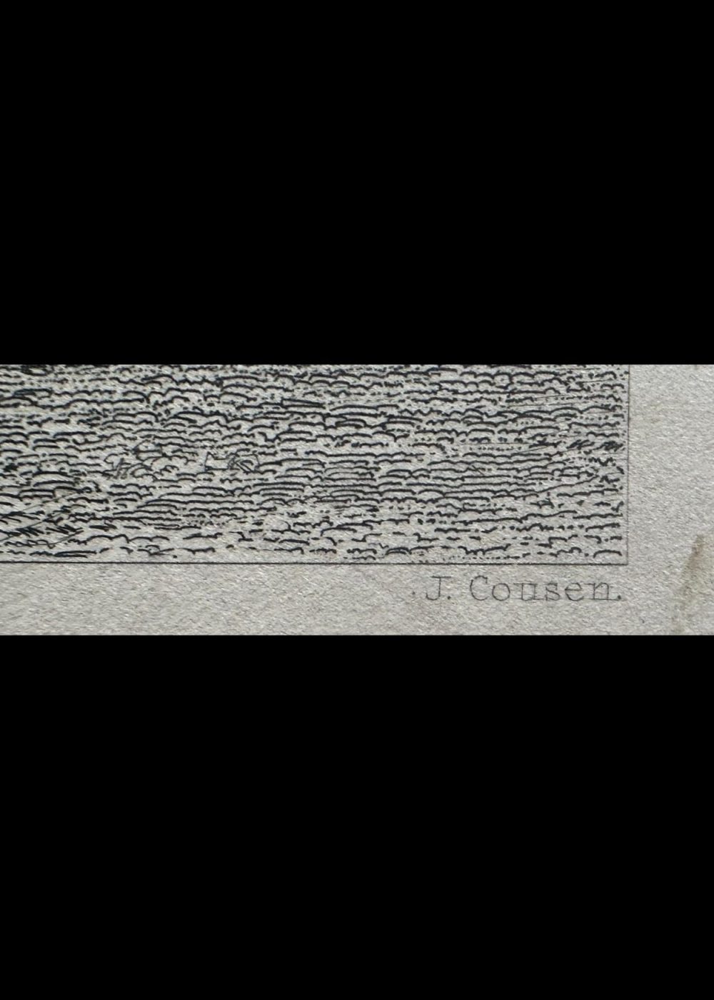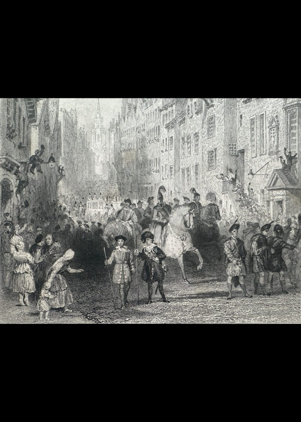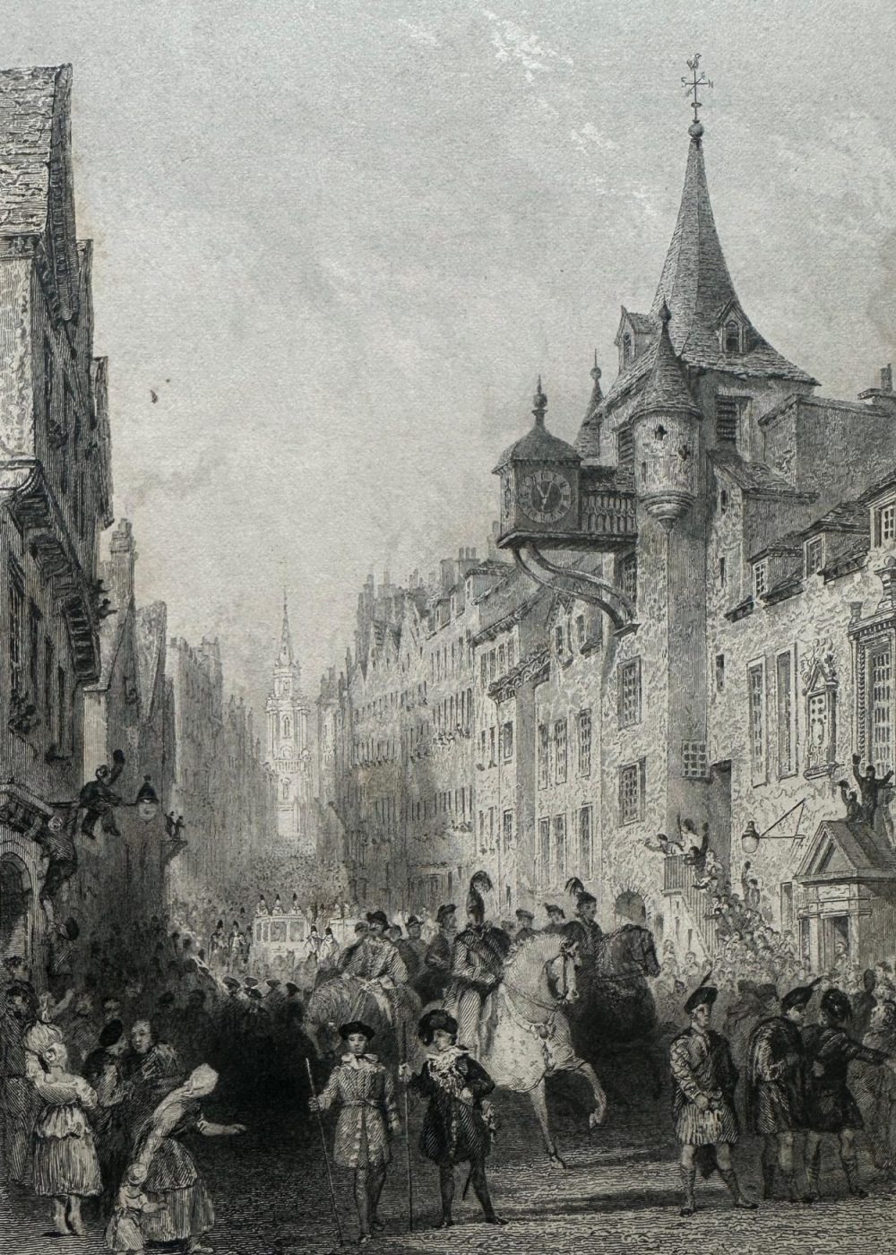 DURING THE PROCESSIONOF HIS MAJESTY GEORGE IVTH EDINBURGH, AUGT. 22ND,1822. The artwork captures a grand royal procession taking place on the Canongate, a historic street in Edinburgh, Scotland. The event marks King George IV’s visit to Scotland — the first by a reigning British monarch in nearly two centuries. In the foreground, crowds of townspeople gather to watch the event. Many wear traditional Scottish dress, including kilts and bonnets. Soldiers and officials in ceremonial uniform lead and follow behind a mounted guard, with horses and richly dressed figures filling the street. The king’s carriage is visible further down the road, surrounded by spectators. The street is lined with historic stone buildings, some with turrets, balconies, and ornate clocks, adding depth and texture to the cityscape. In the far distance, the spire of St. Giles’ Cathedral rises into the cloudy sky, symbolizing Edinburgh’s architectural and historical grandeur.The engraving was created by J. Cousen, drawn from nature by T. Allom, and published in 1845, capturing a historic moment of royal pageantry and public celebration in 19th-century Edinburgh.