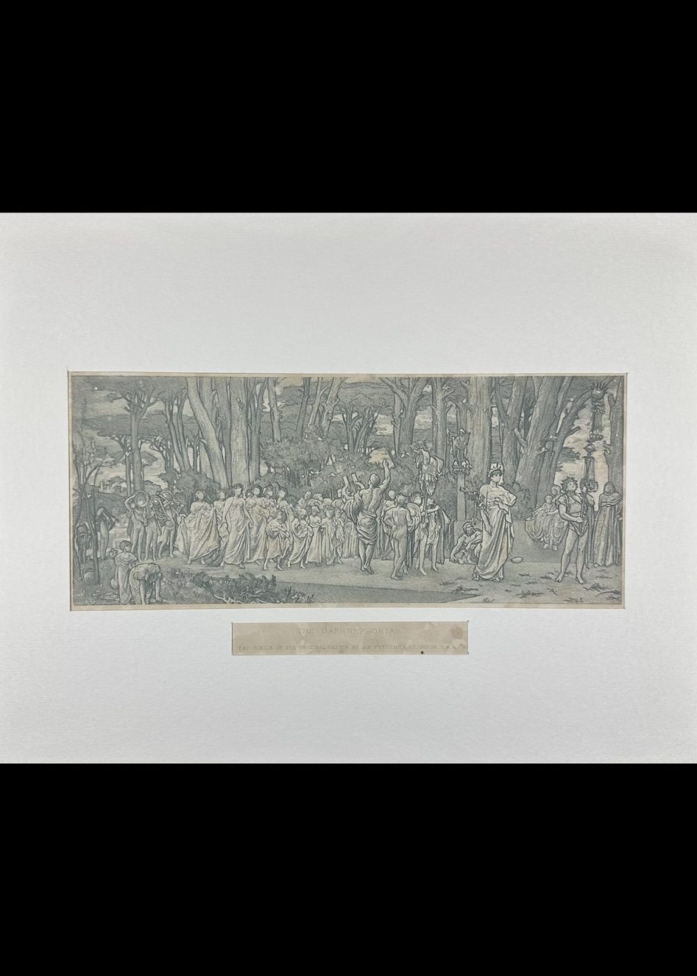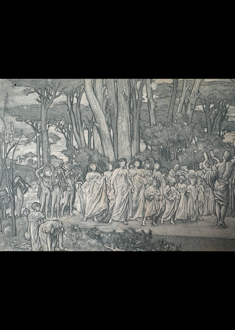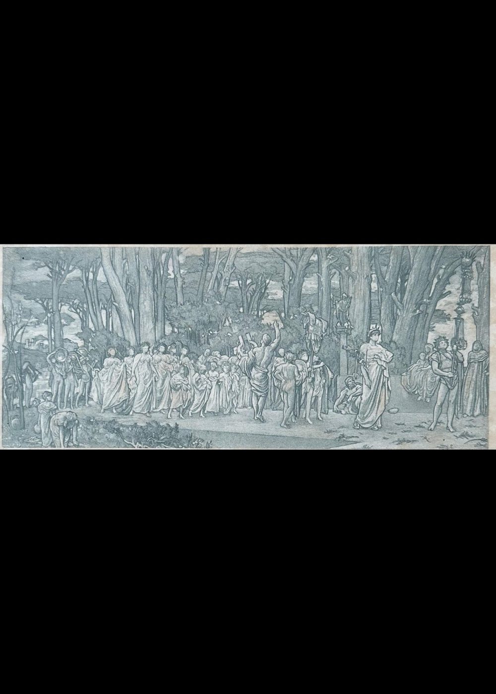 The image depicts a procession or gathering of classical figures in a forested landscape. Central to the composition is a nude male figure raising his arms in a gesture of exultation or proclamation, surrounded by gracefully robed women and children in flowing classical garments. The scene is set among tall, stylized trees, giving the image a dreamlike quality. Figures play instruments, walk in harmony, or observe quietly, creating a serene, ritualistic atmosphere. The engraving celebrates beauty, harmony, and classical ideals, all central to Leighton’s work. The overall composition is both balanced and rhythmic, with carefully arranged figures that guide the viewer’s eye across the scene. The fine detailing and linear emphasis suggest that this is likely based on a preparatory drawing or mural design rather than a finished oil painting.