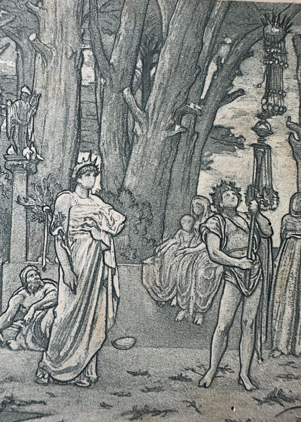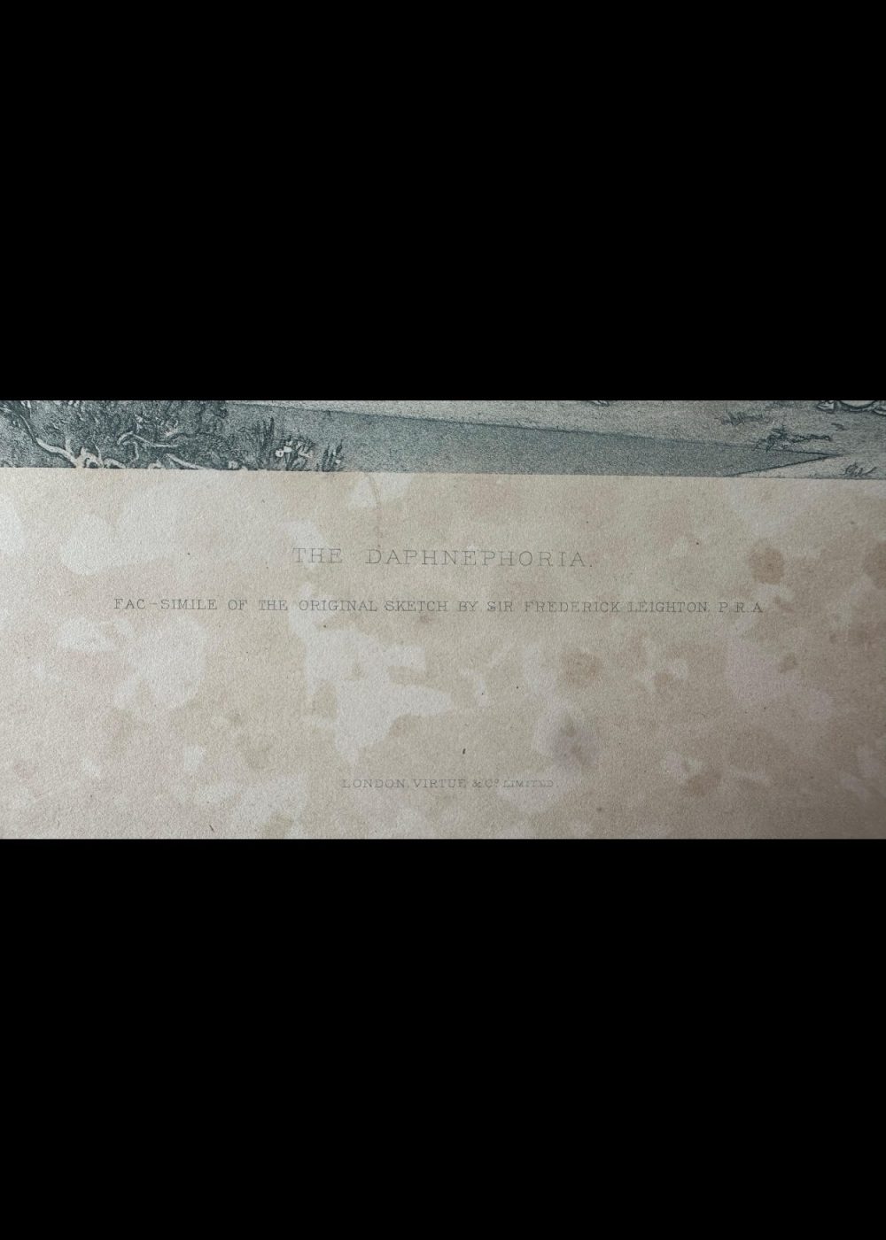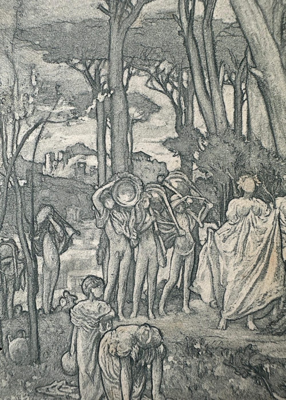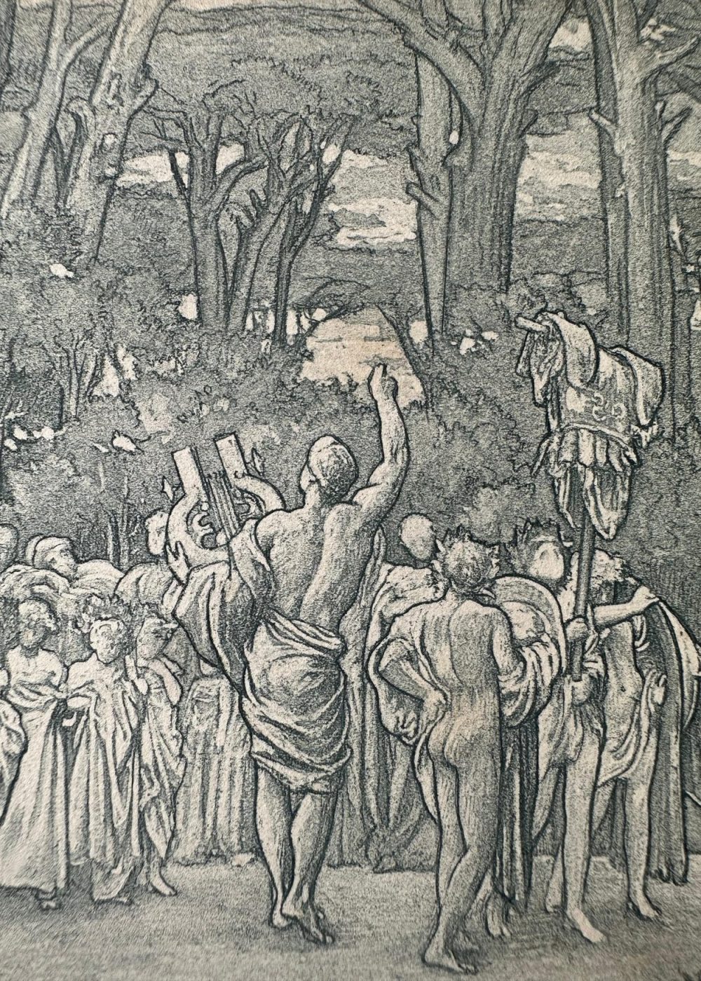 The image depicts a procession or gathering of classical figures in a forested landscape. Central to the composition is a nude male figure raising his arms in a gesture of exultation or proclamation, surrounded by gracefully robed women and children in flowing classical garments. The scene is set among tall, stylized trees, giving the image a dreamlike quality. Figures play instruments, walk in harmony, or observe quietly, creating a serene, ritualistic atmosphere. The engraving celebrates beauty, harmony, and classical ideals, all central to Leighton’s work. The overall composition is both balanced and rhythmic, with carefully arranged figures that guide the viewer’s eye across the scene. The fine detailing and linear emphasis suggest that this is likely based on a preparatory drawing or mural design rather than a finished oil painting.