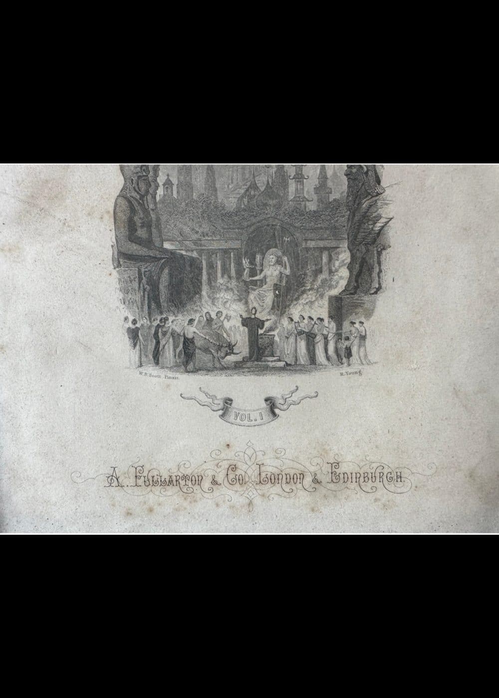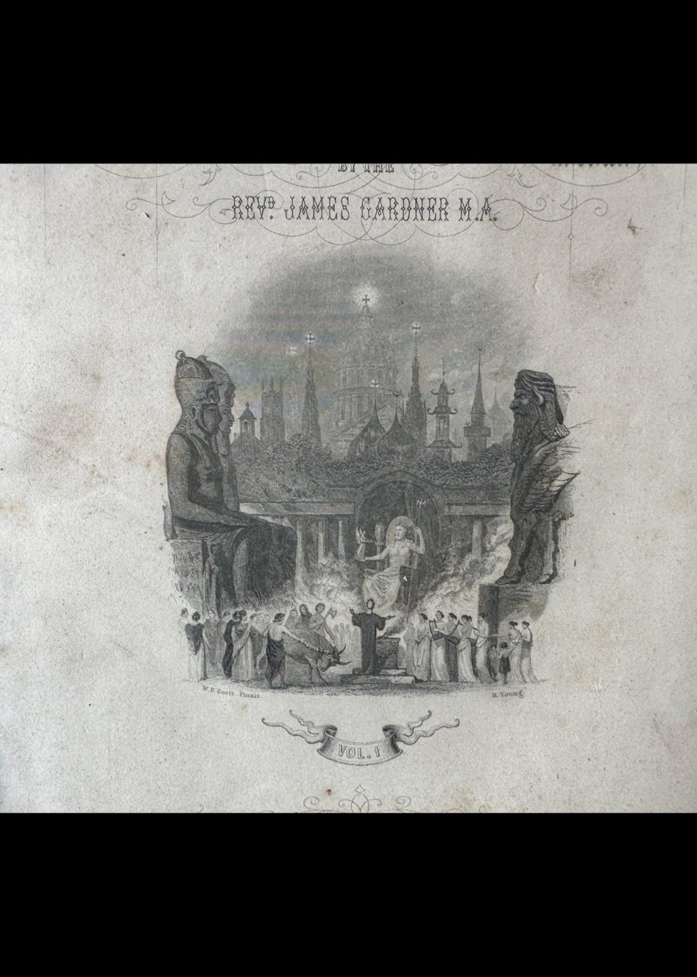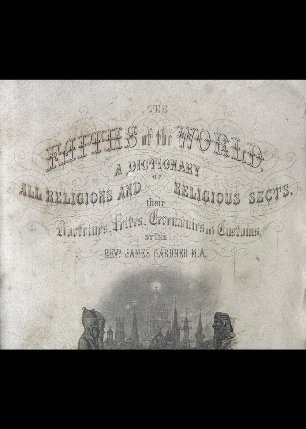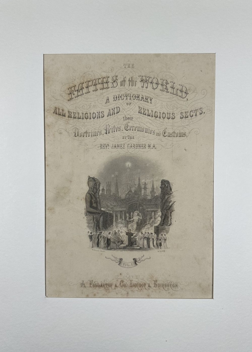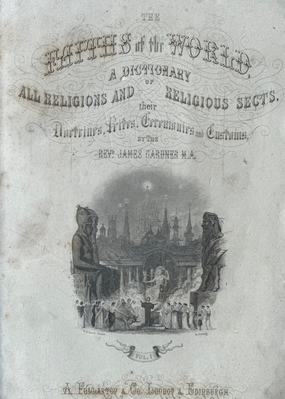 “THE FAITHS IN THE WORLD”. A dictionary of all religions and their religious sects. by The Rev. James Gardner. This is the illustrated title page of The Faiths of the World: A Dictionary of All Religions and Religious Sects, their Doctrines, Rites, Ceremonies, and Customs by Rev. James Gardner, M.A. The artwork features elaborate calligraphy framed by intricate scrollwork, with a central engraving depicting religious figures, statues, and worshippers against a backdrop of temples and domes. Published by A. Fullarton & Co., London and Edinburgh, this is Volume I of the work.