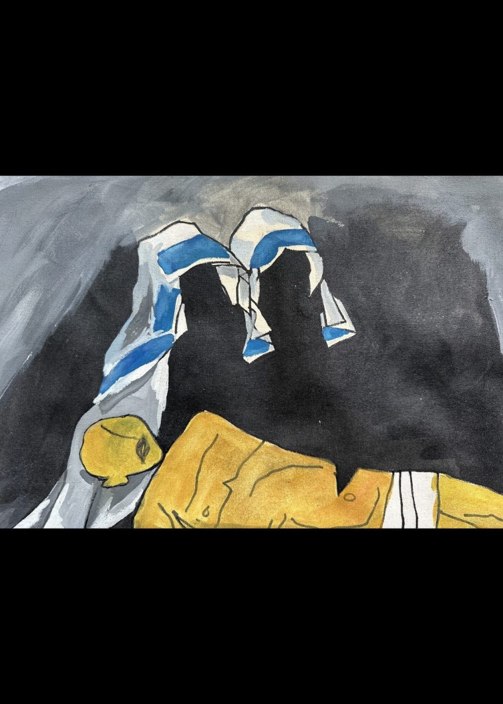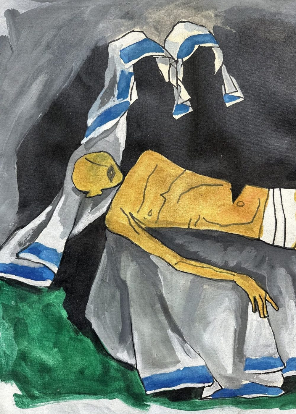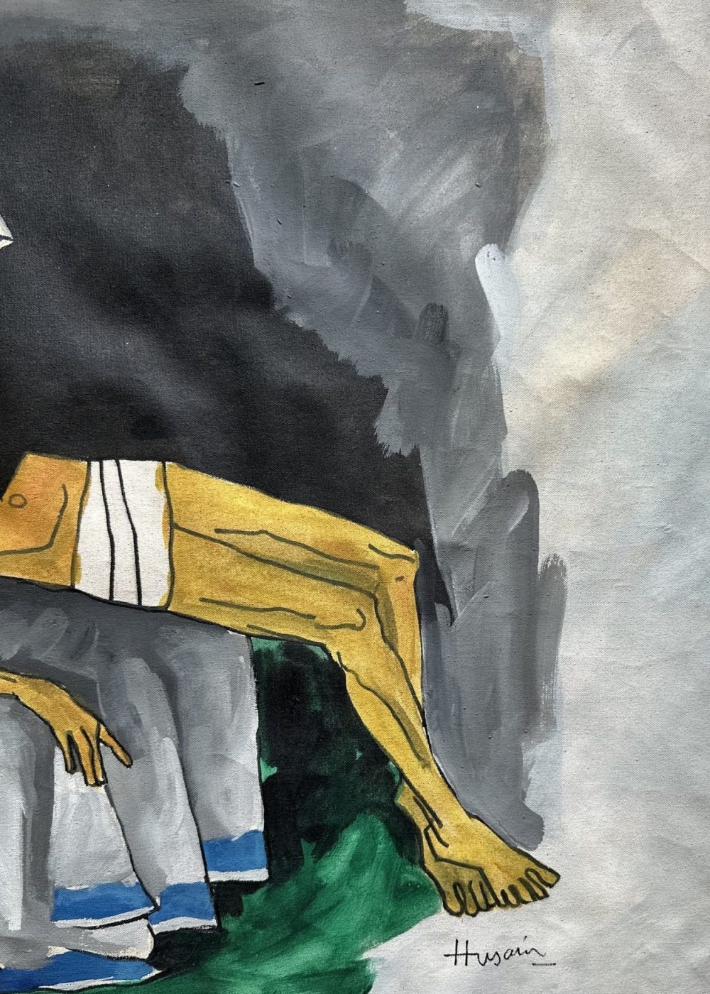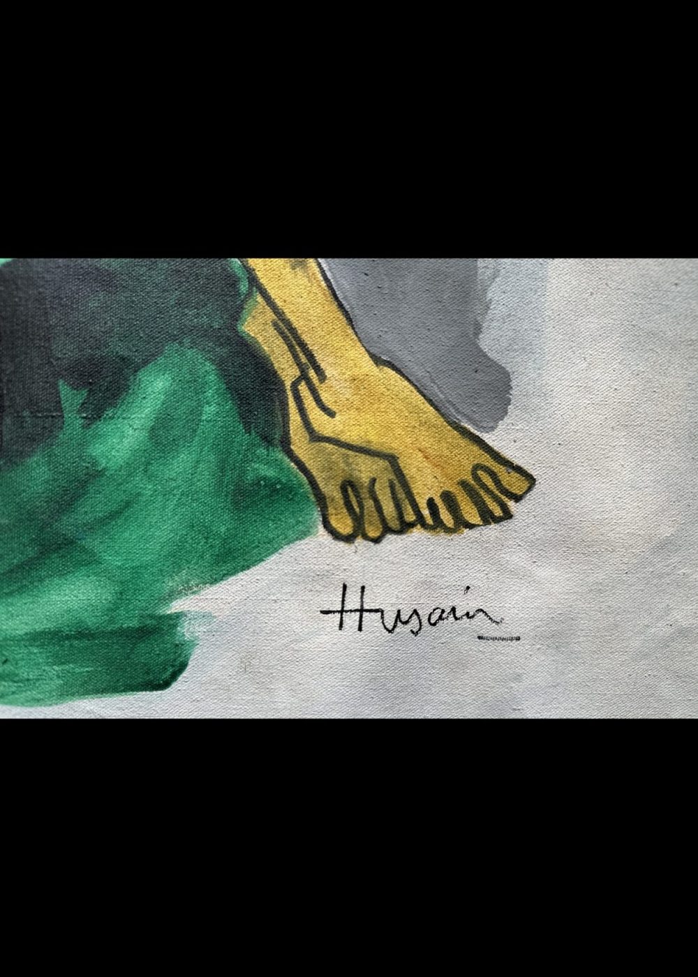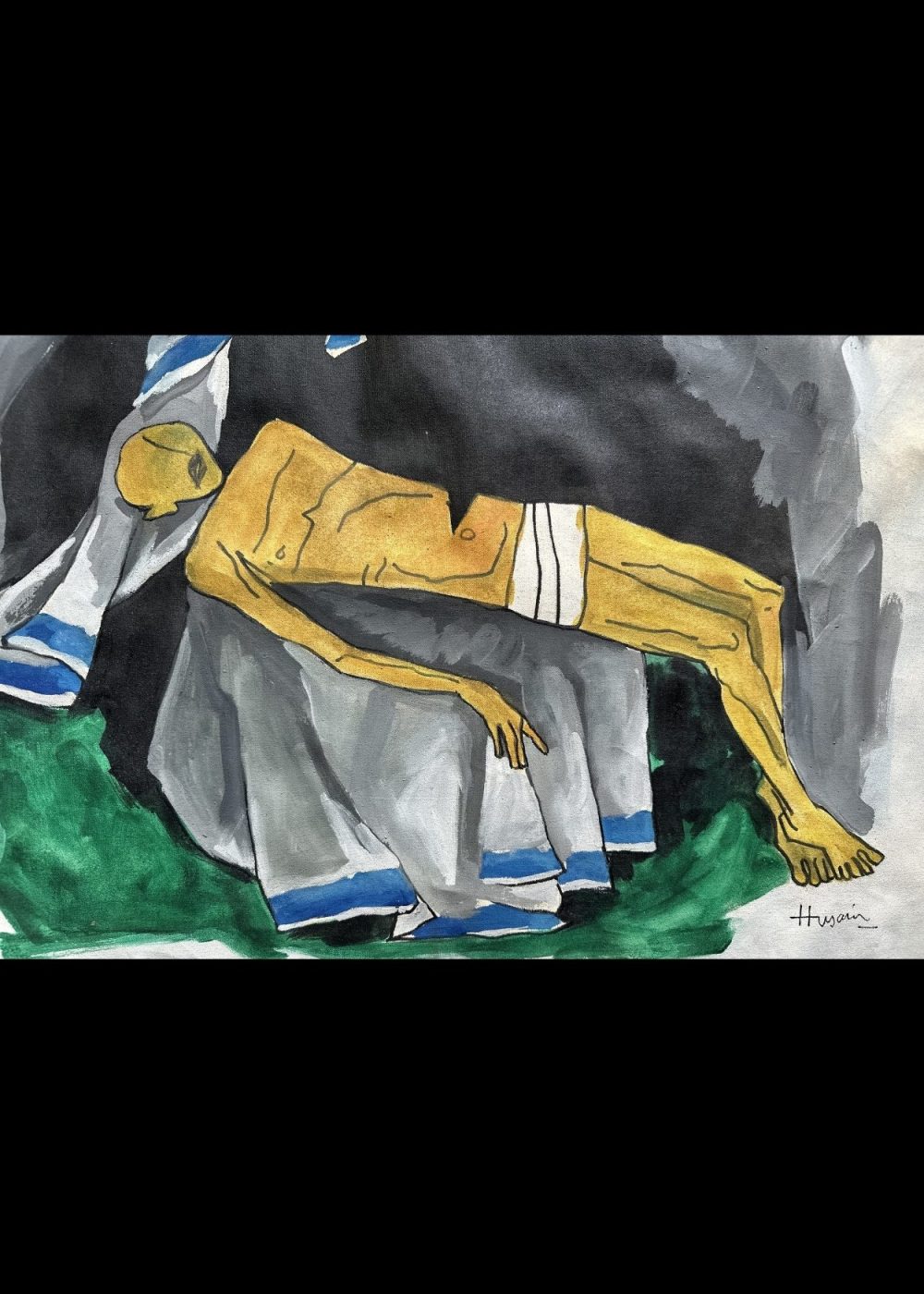 This powerful modernist painting presents a stark and emotional portrayal of a lifeless male figure draped in a white cloth with blue borders, a traditional Indian shroud. Set against a dark, brooding backdrop with dramatic gray and black brushstrokes, the yellow-hued body lies limp over a surface, evoking themes of mortality, loss, and stillness. The abstracted human form and simplified color palette heighten the emotional intensity, allowing viewers to reflect on the fragility of life. Signed by the artist “Husain,” the work reflects the expressionist depth and social consciousness typical of M.F. Hussain’s iconic style.