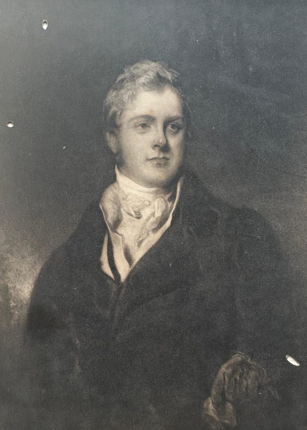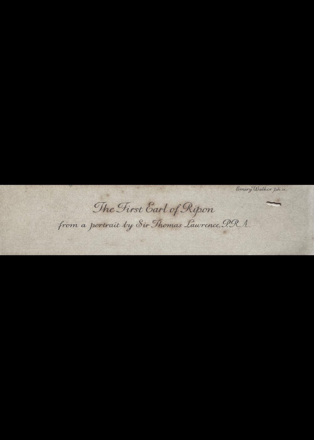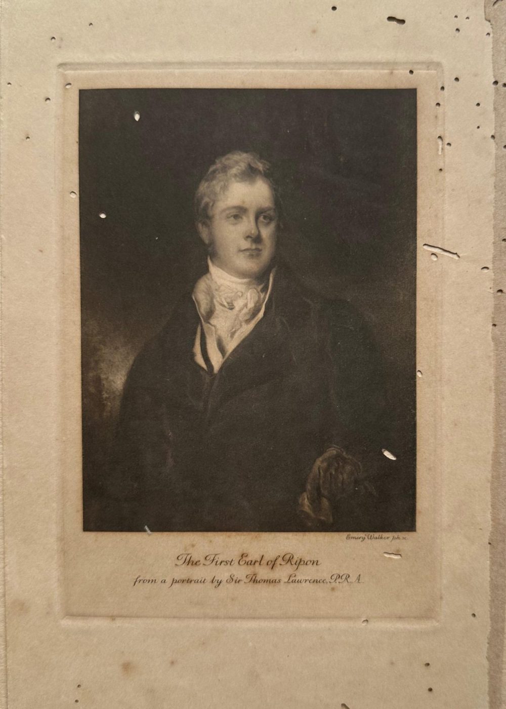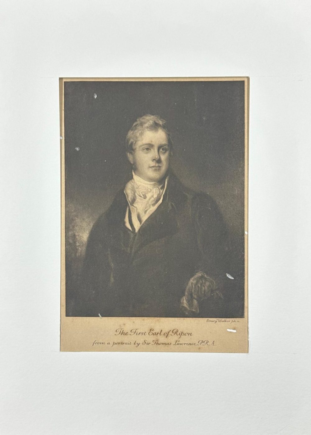 This stately portrait depicts Frederick John Robinson, the First Earl of Ripon, a 19th-century British statesman who briefly served as Prime Minister. Rendered with refined shading and elegance, the image captures his composed demeanor and dignified presence. The engraving, executed by Emery Walker, is based on a painting by the celebrated portrait artist Sir Thomas Lawrence, President of the Royal Academy. The sitter’s refined dress and serene expression reflect his high status and role in British politics during the Regency and early Victorian period.