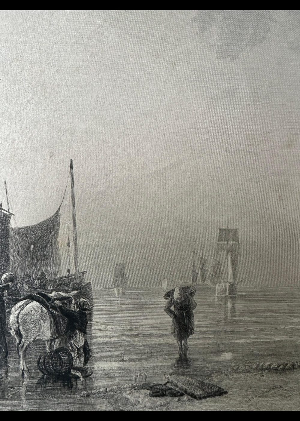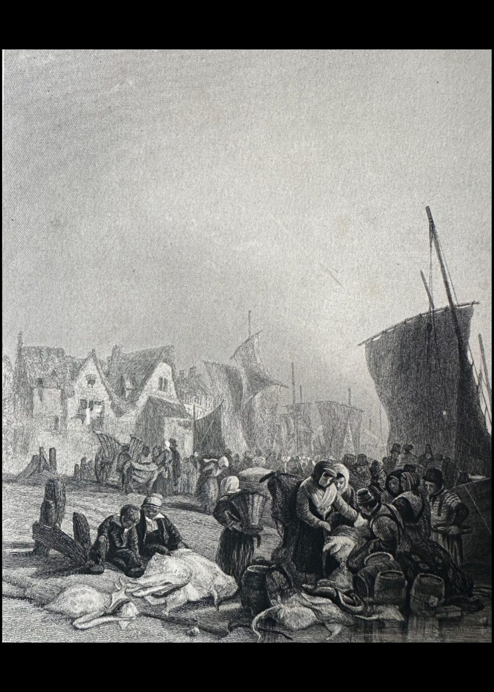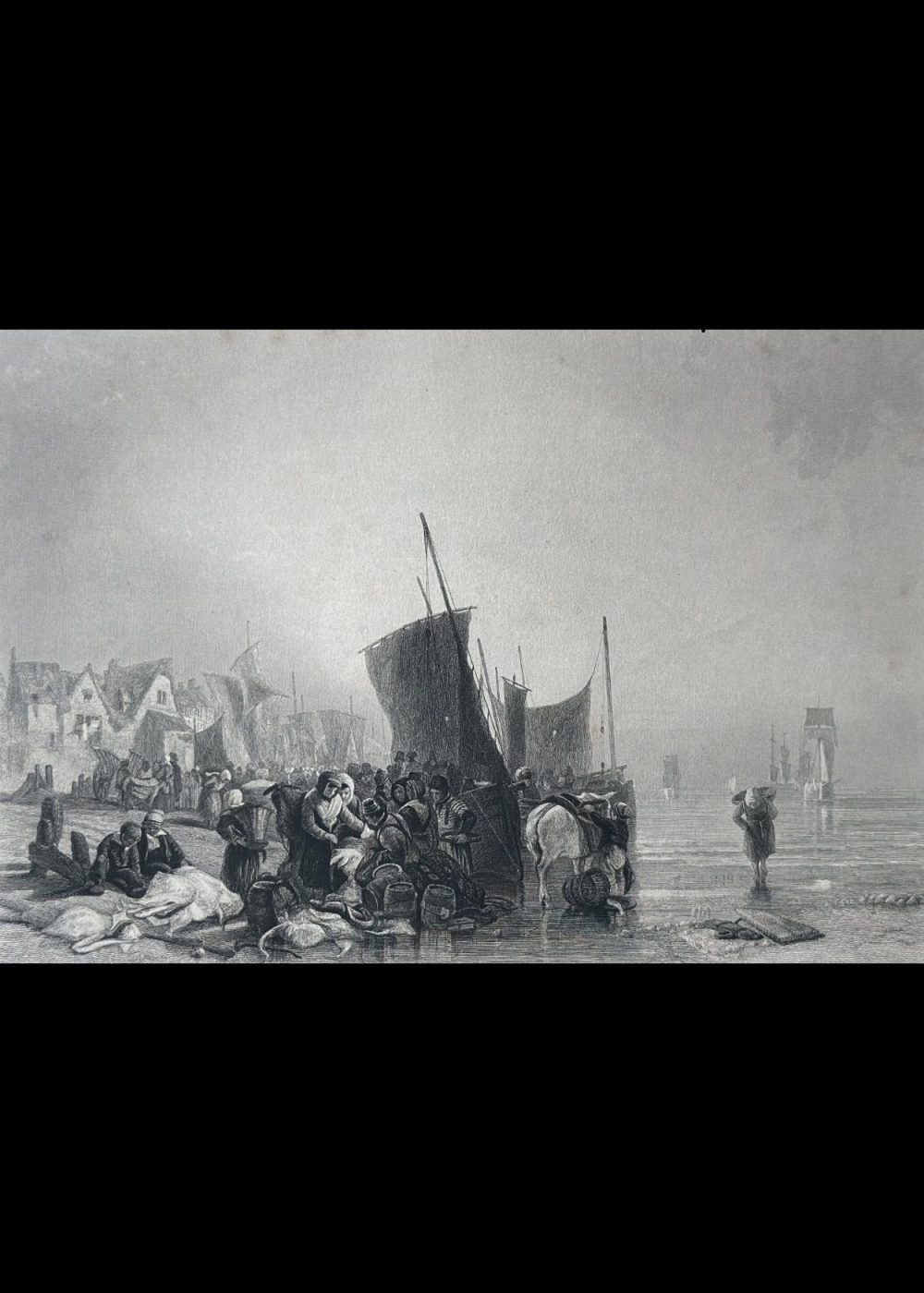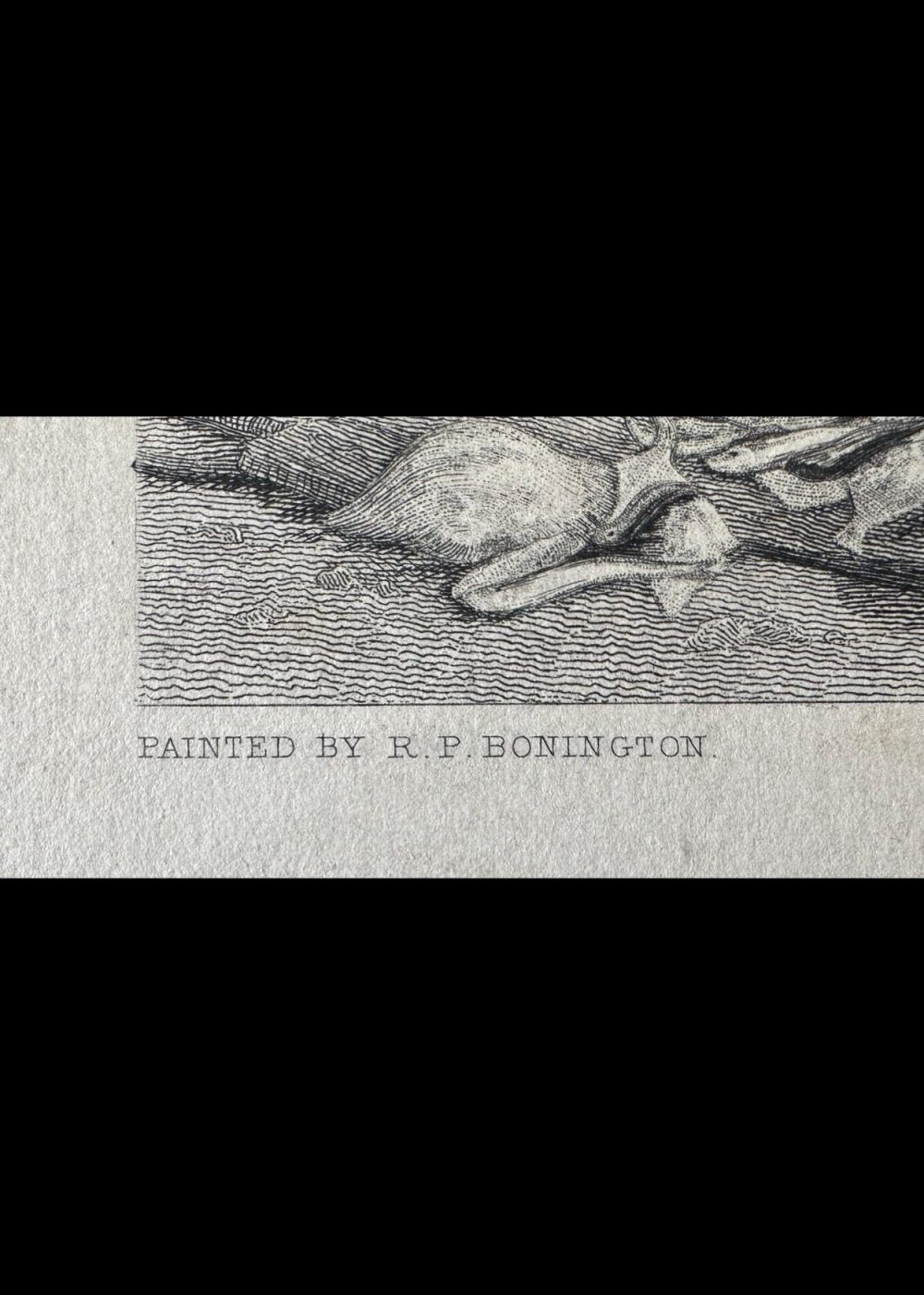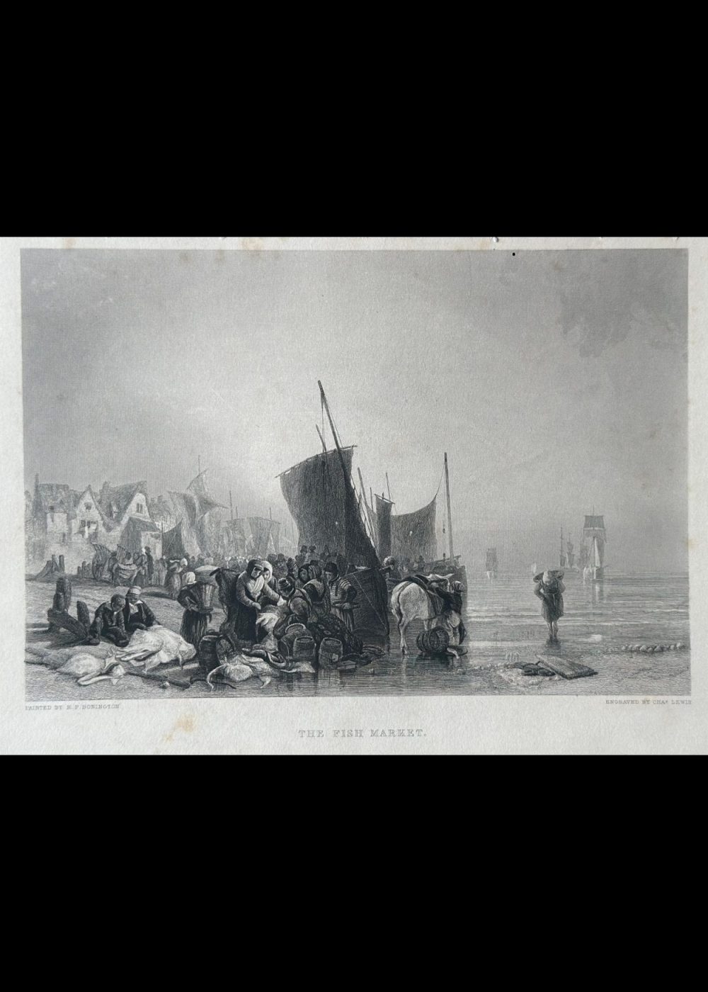 The Fish Market is a vivid coastal scene rendered in intricate detail, capturing the bustling activity of a seaside fish market. Fishermen, traders, and townspeople gather along the shore as boats are docked nearby, their sails towering against the hazy backdrop. The engraving brings to life the energy and commerce of maritime life, highlighting Bonington’s talent for atmospheric coastal scenes. Charles Lewis’s engraving faithfully translates the texture and liveliness of the original, showcasing both the labor and livelihood of a fishing community. The misty ambiance and lively crowd evoke a strong sense of place and daily routine in a historic seaside town.