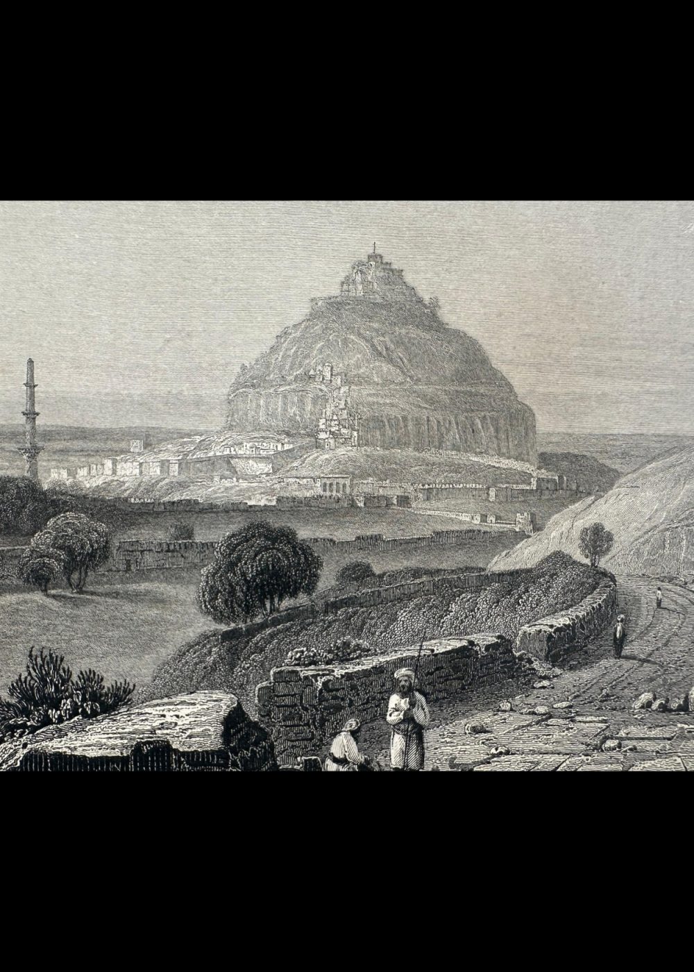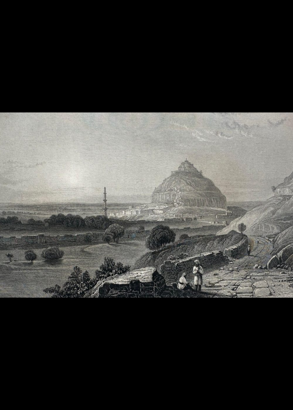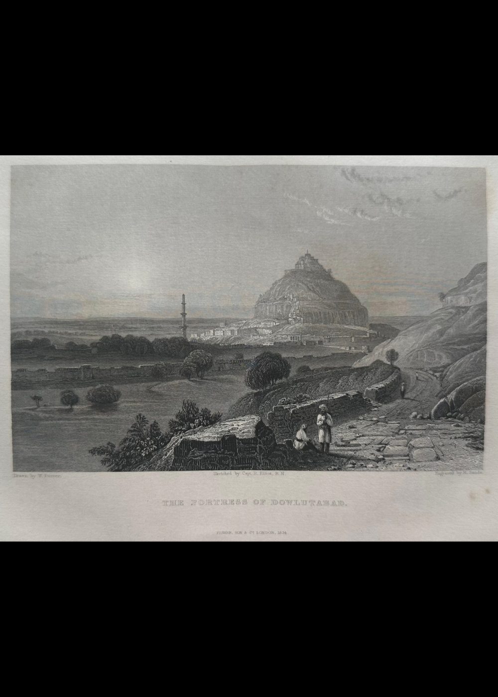 This engraving, titled The Fortress of Dowlutabad, is an artistic representation from the book India China. It depicts a sweeping view of the imposing Dowlutabad Fortress, situated atop a rocky hill, with surrounding landscapes and a few figures walking along the path below. The fortress itself, perched at the summit, commands a strategic position. The sketch was made by Captain R. Elliot, R.N., with the engraving executed by R. Sands and the drawing by W. Purser. This image offers a glimpse into the historical and architectural grandeur of Dowlutabad, capturing its formidable setting and surrounding terrain.