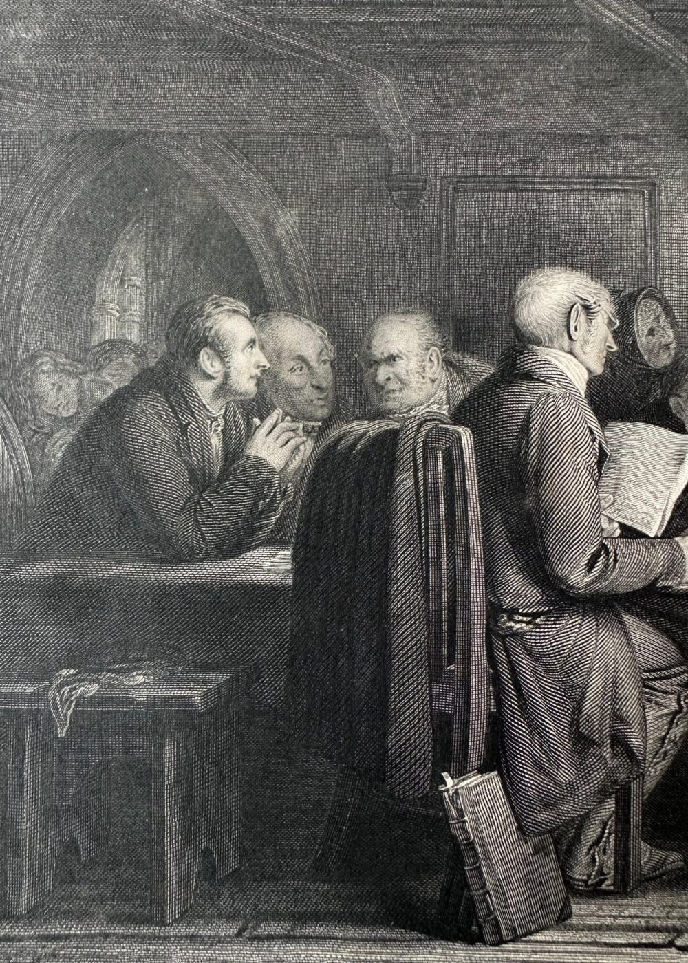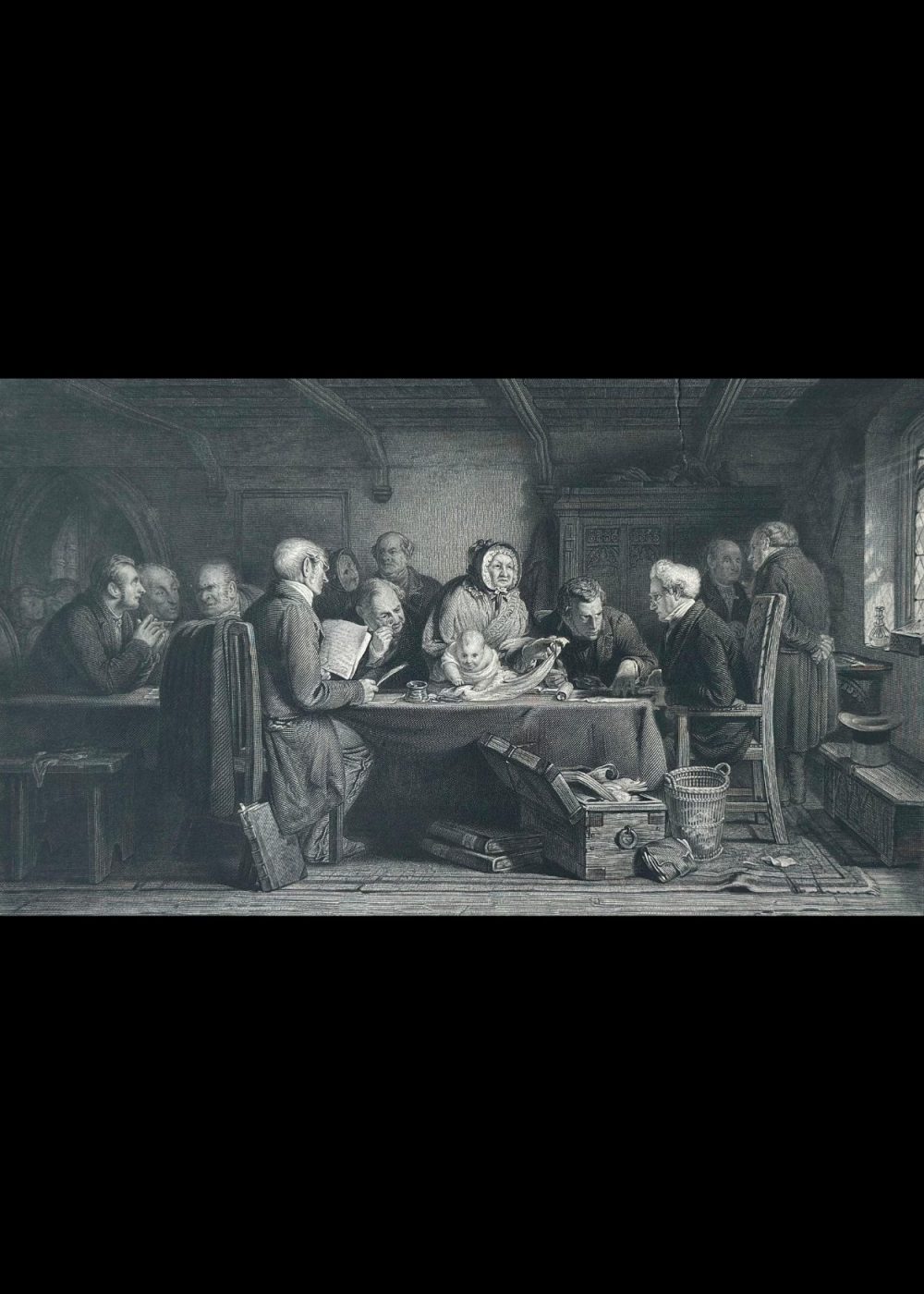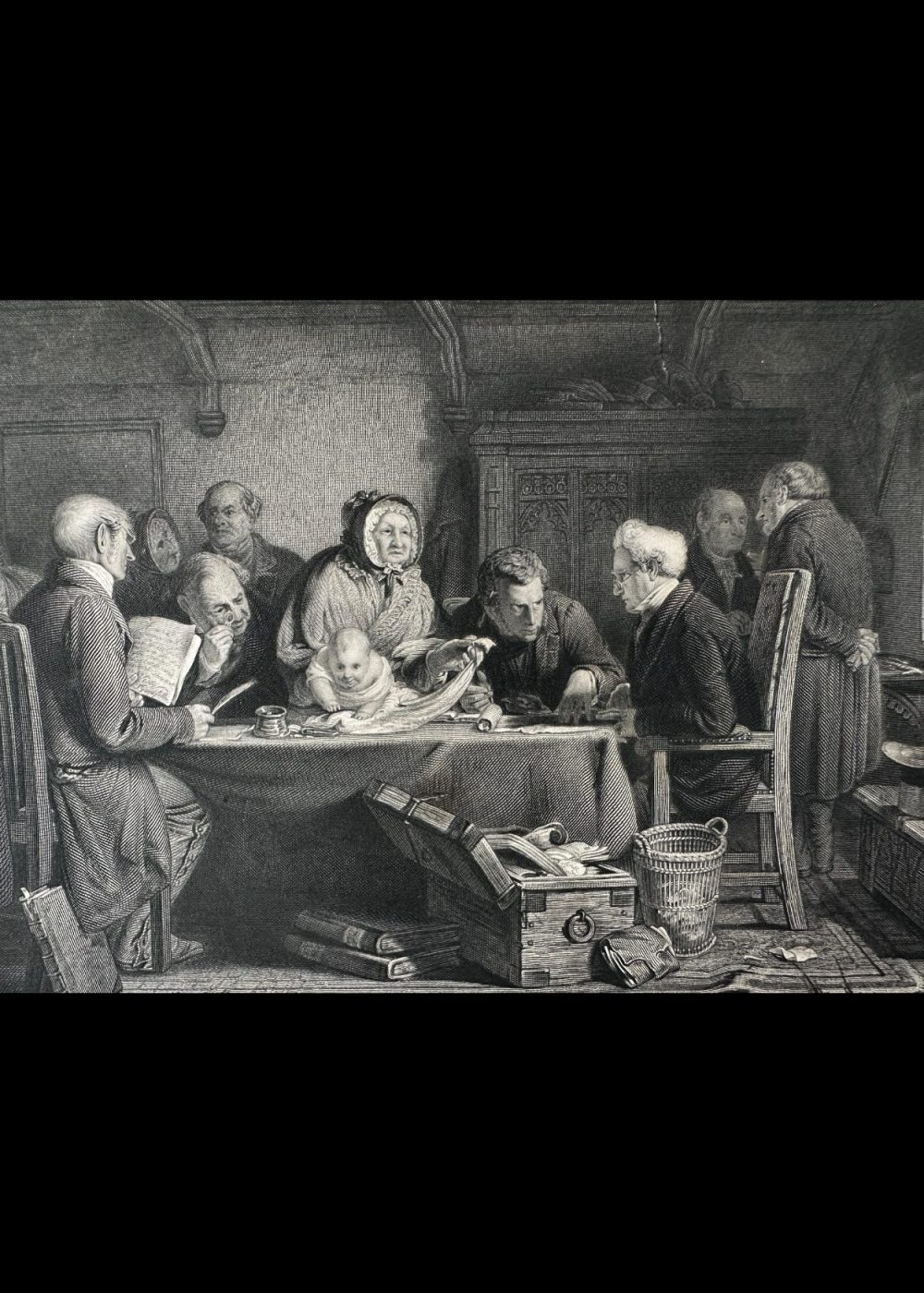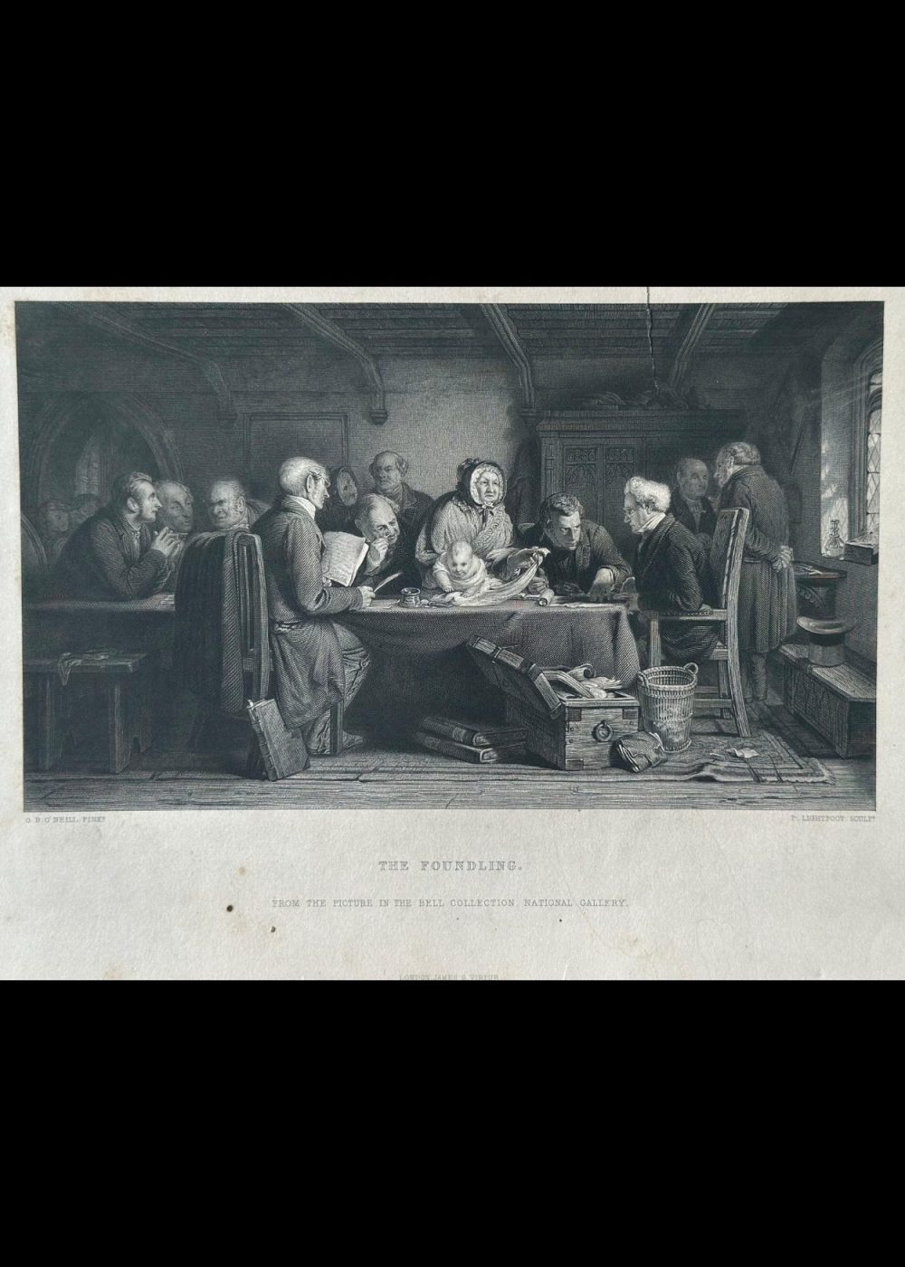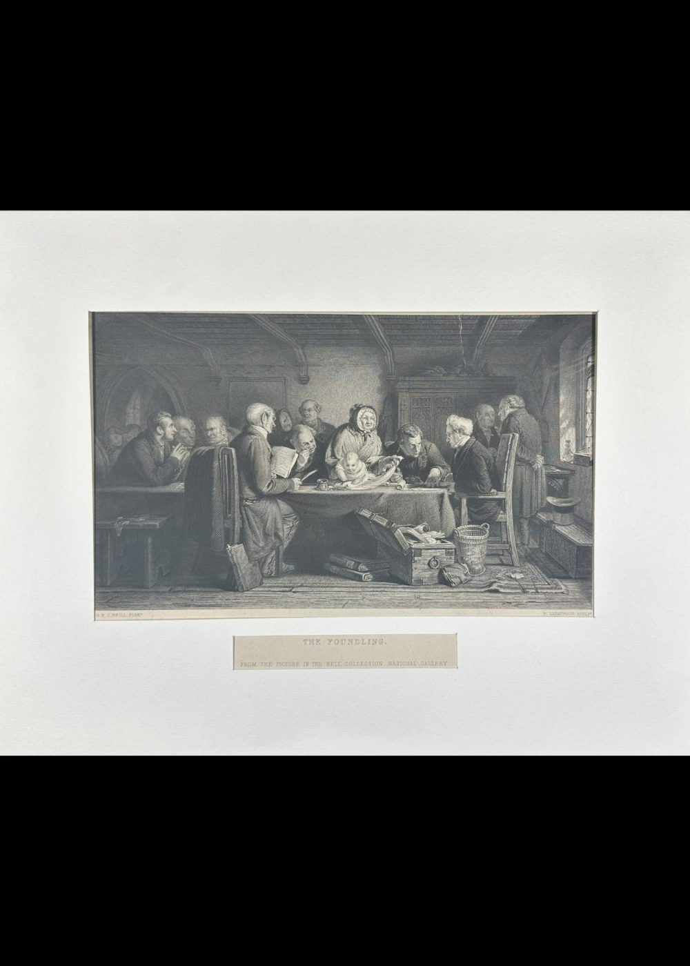 This finely detailed engraving, The Foundling, portrays a touching domestic scene centered around the discovery or introduction of an abandoned child. Set in a warmly lit interior, a group of concerned adults gathers around a table, intently focused on a young child seated at the center. The expressions range from curiosity to compassion, emphasizing the emotional weight of the moment. The interior is richly rendered with period furnishings and thoughtful composition, characteristic of George Bernard O’Neill’s narrative style. The work reflects Victorian values of charity, morality, and communal responsibility, and is reproduced here with care and precision by engraver P. Lightfoot.