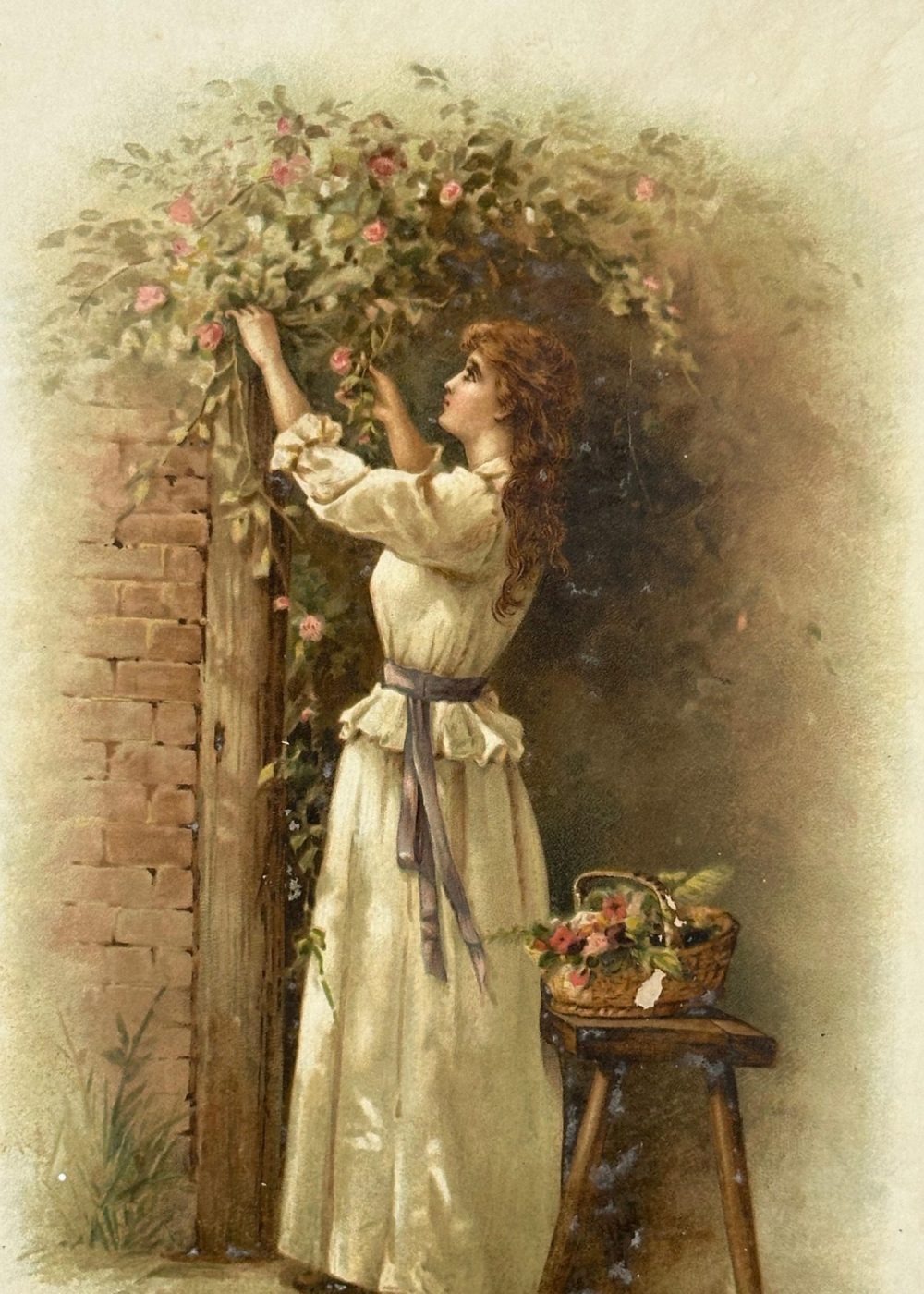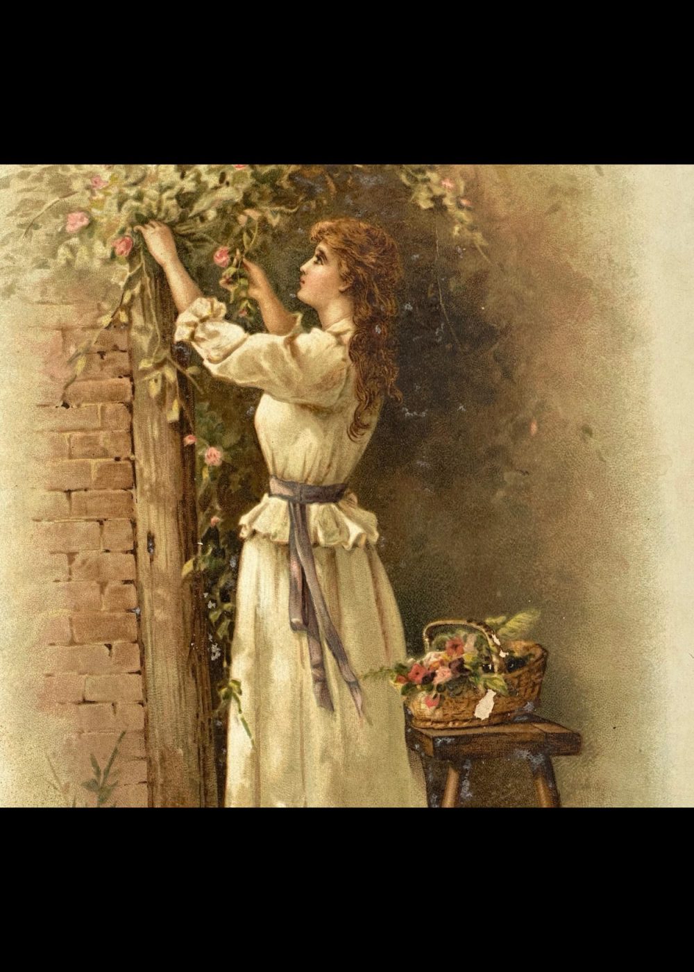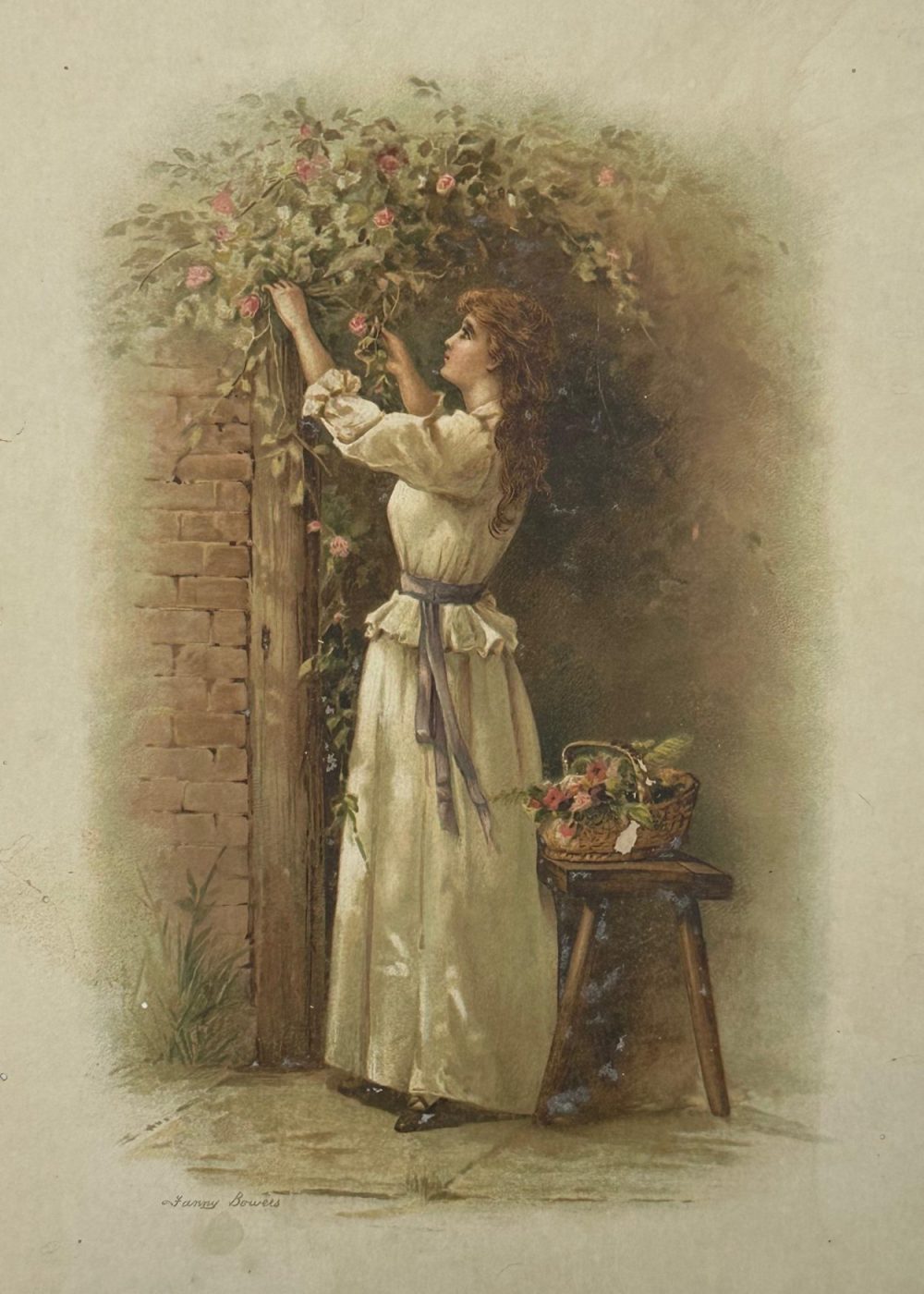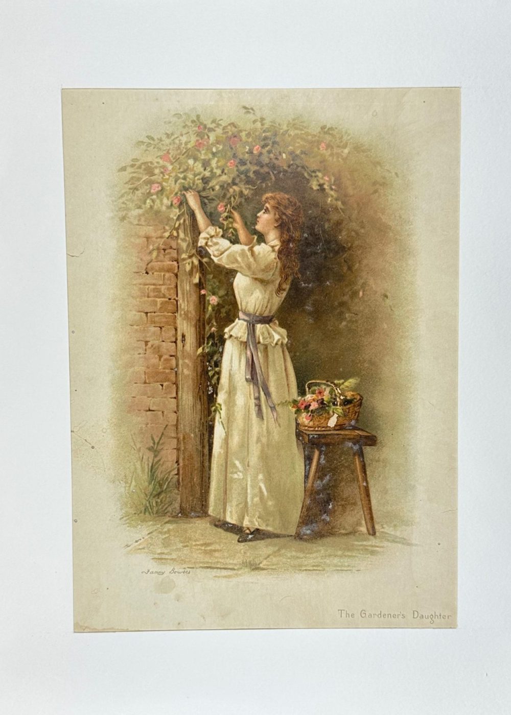 This charming oleograph titled The Gardener’s Daughter by Fanny Bowers captures a tender, pastoral moment of Victorian life. A young woman dressed in a flowing ivory gown with a lavender sash is depicted reaching up to gather blooming roses from a garden arch. Her graceful posture and soft features evoke a sense of innocence and quiet joy. A rustic wooden stool beside her holds a woven basket filled with freshly picked flowers, reinforcing the idyllic, countryside setting. The soft brushwork and warm, earthy tones typical of the oleograph technique give this print a rich, textured appearance, making it a timeless piece that celebrates beauty, nature, and simplicity.