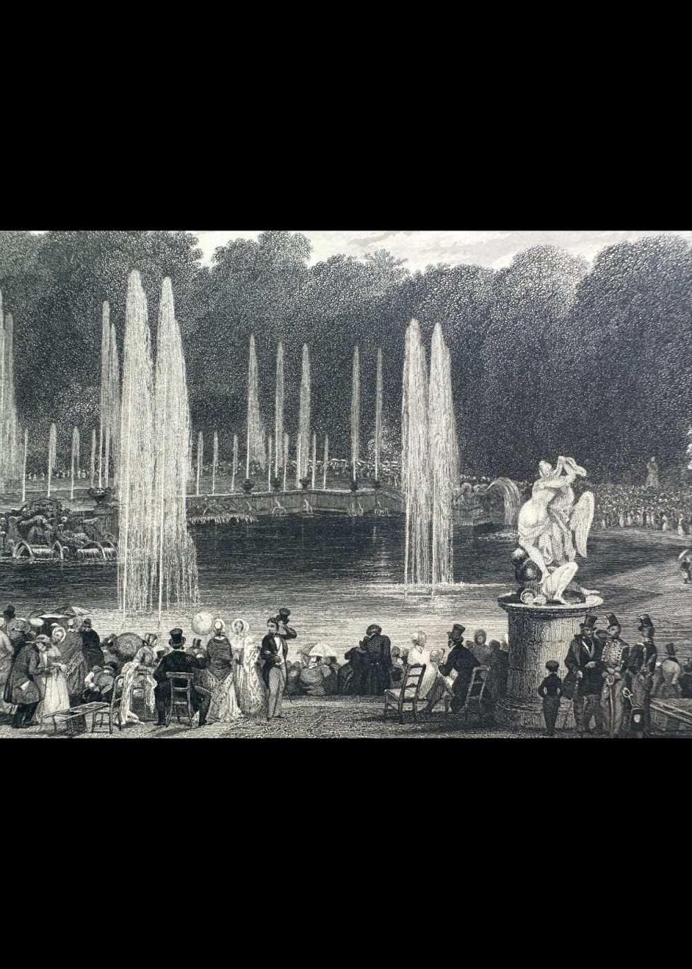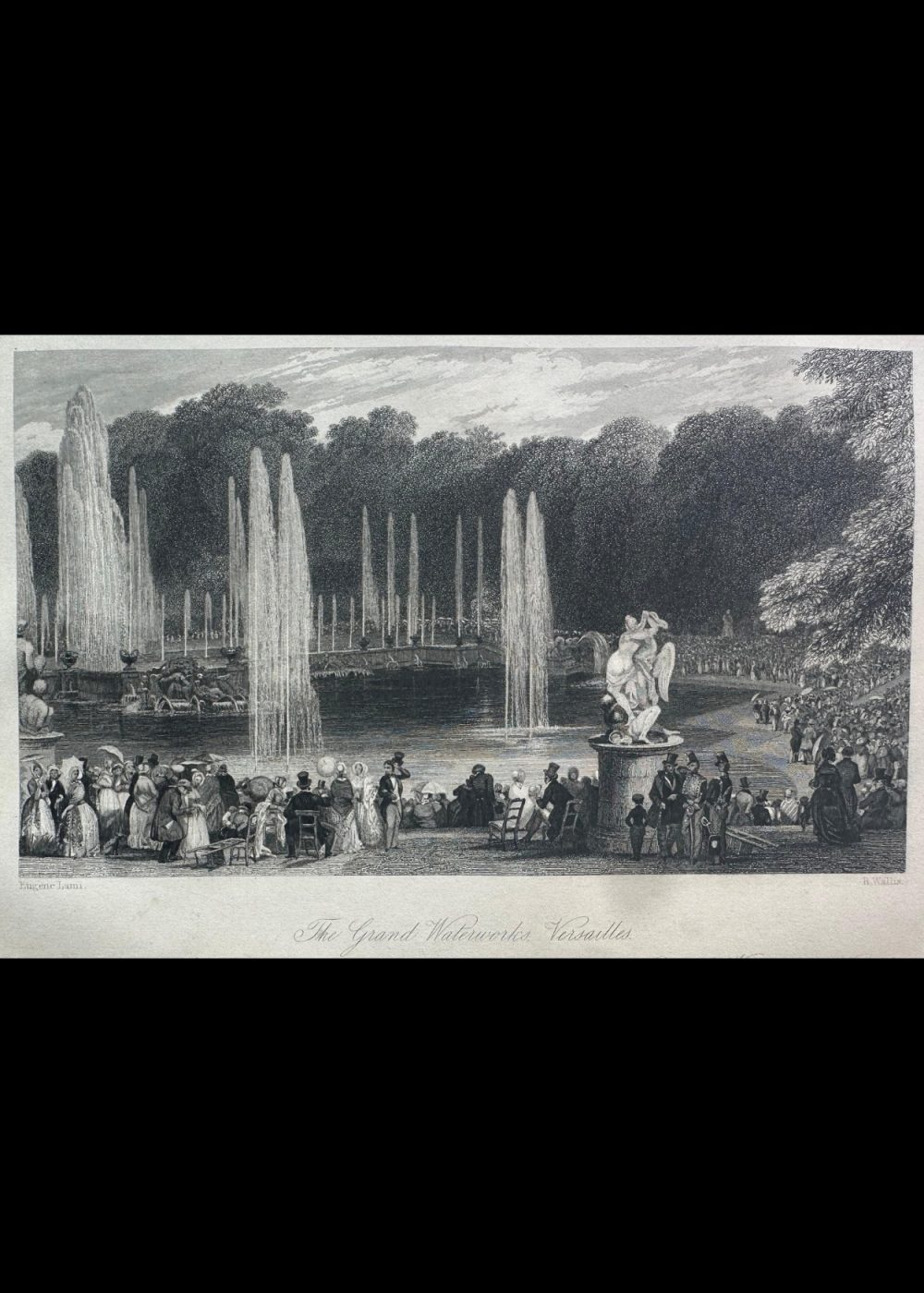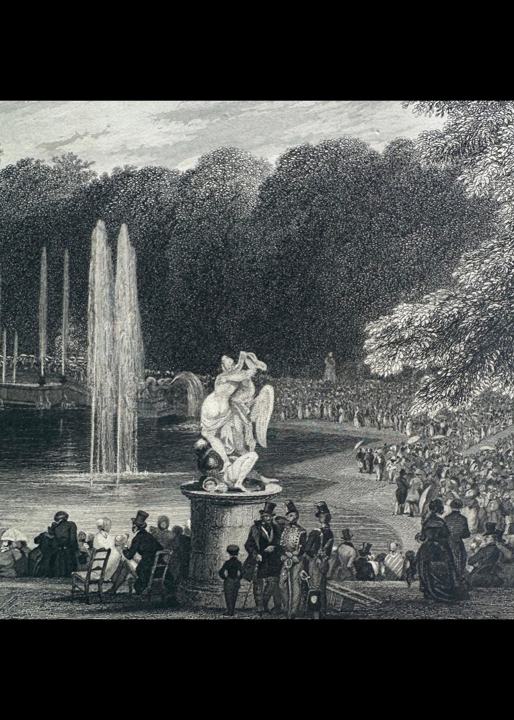This engraving vividly captures the magnificent fountains and grand spectacle of the Waterworks at the Palace of Versailles. The artist skillfully depicts the dynamic play of water jets rising amidst classical sculptures and lush greenery, surrounded by elegantly dressed visitors enjoying the royal display. The composition reflects the opulence and grandeur of 17th- and 18th-century French court life, where art, architecture, and landscape design merged in perfect harmony. The scene embodies the enduring legacy of Versailles as a symbol of royal magnificence and European artistic achievement.