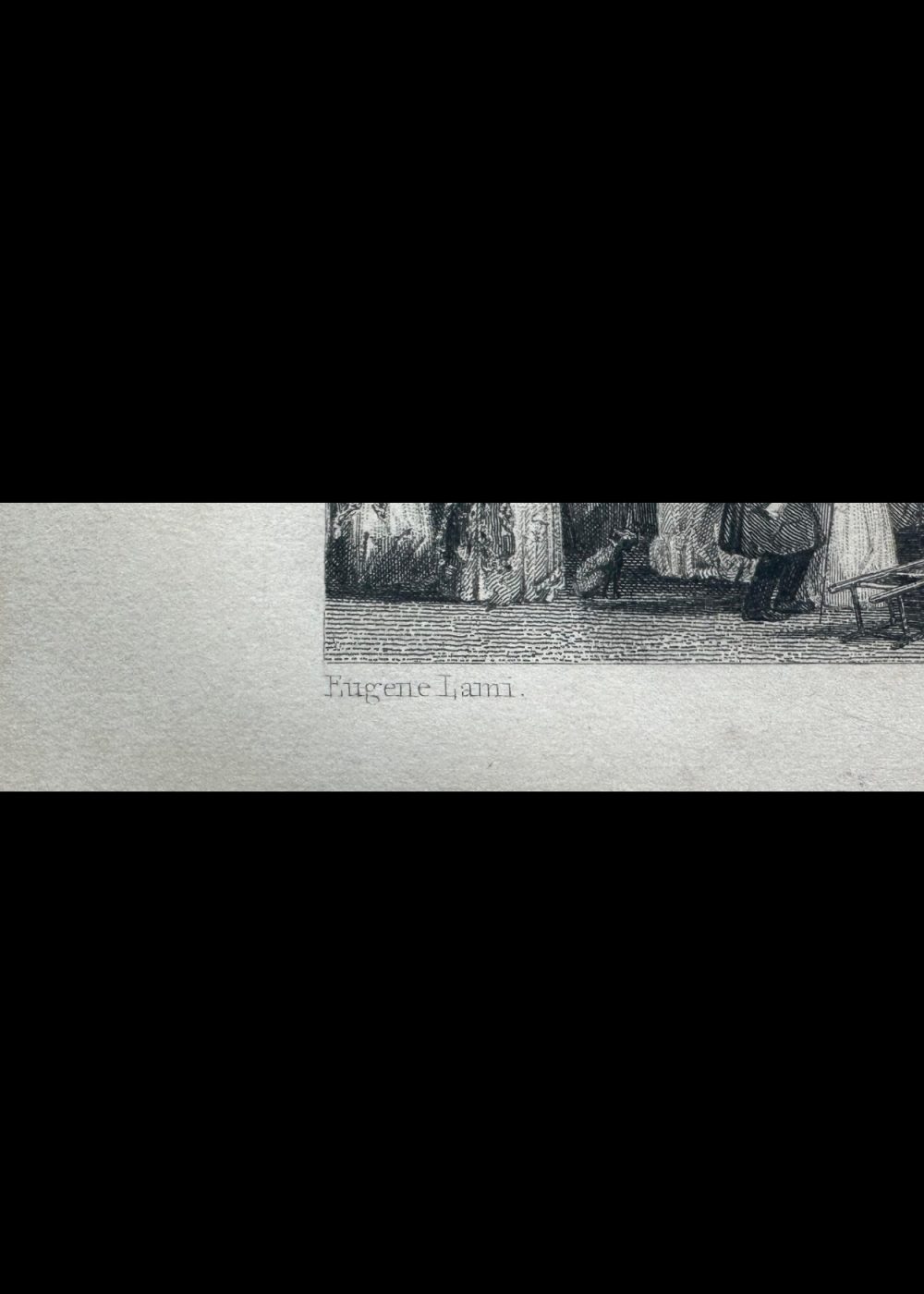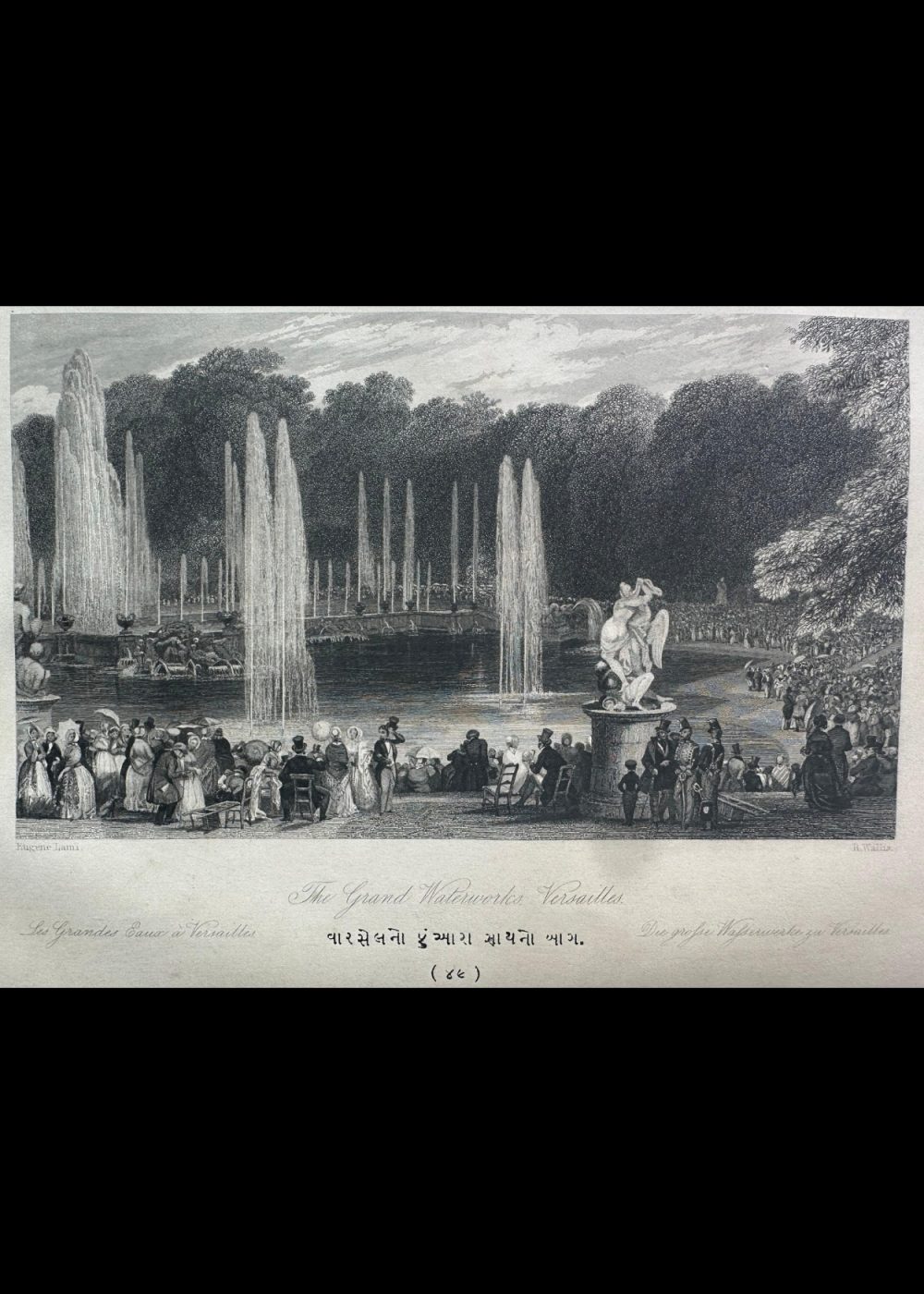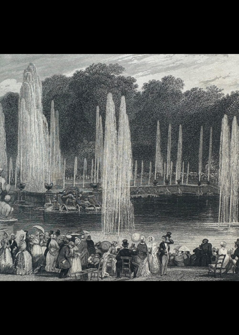 This engraving vividly captures the magnificent fountains and grand spectacle of the Waterworks at the Palace of Versailles. The artist skillfully depicts the dynamic play of water jets rising amidst classical sculptures and lush greenery, surrounded by elegantly dressed visitors enjoying the royal display. The composition reflects the opulence and grandeur of 17th- and 18th-century French court life, where art, architecture, and landscape design merged in perfect harmony. The scene embodies the enduring legacy of Versailles as a symbol of royal magnificence and European artistic achievement.