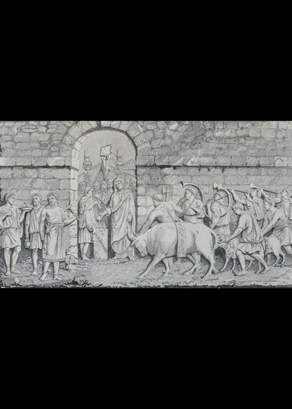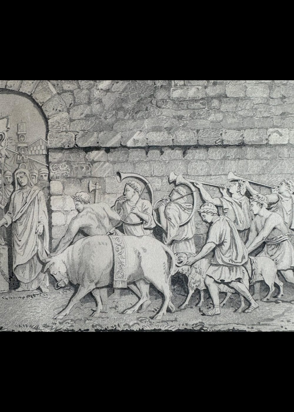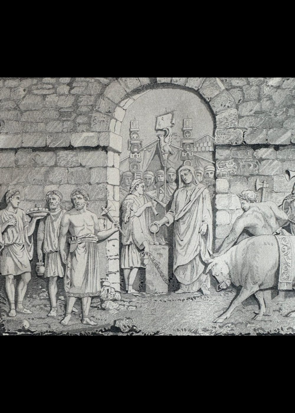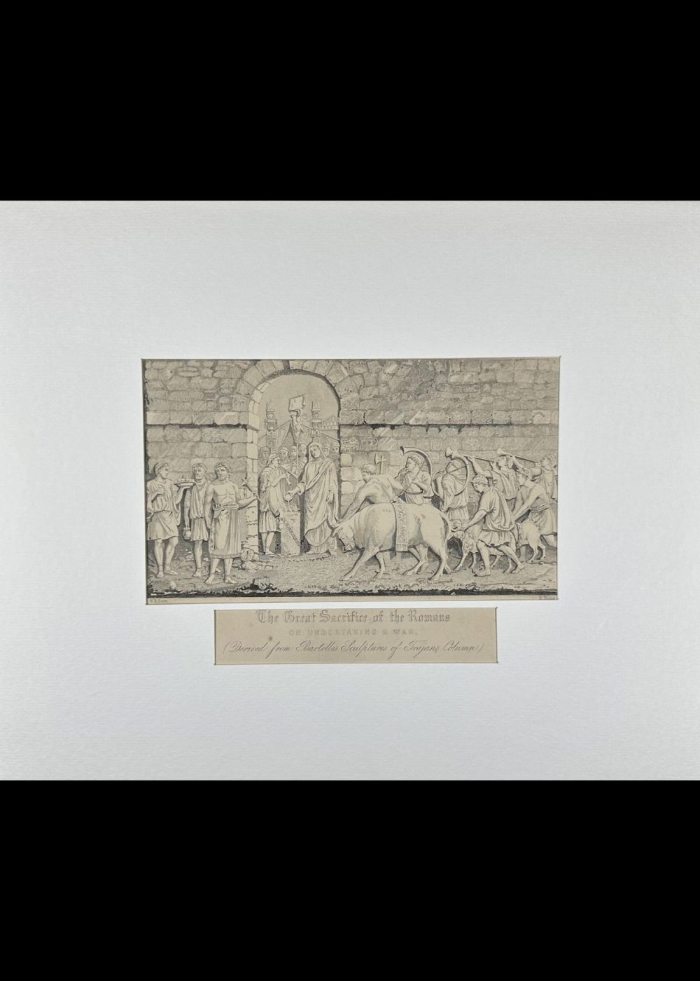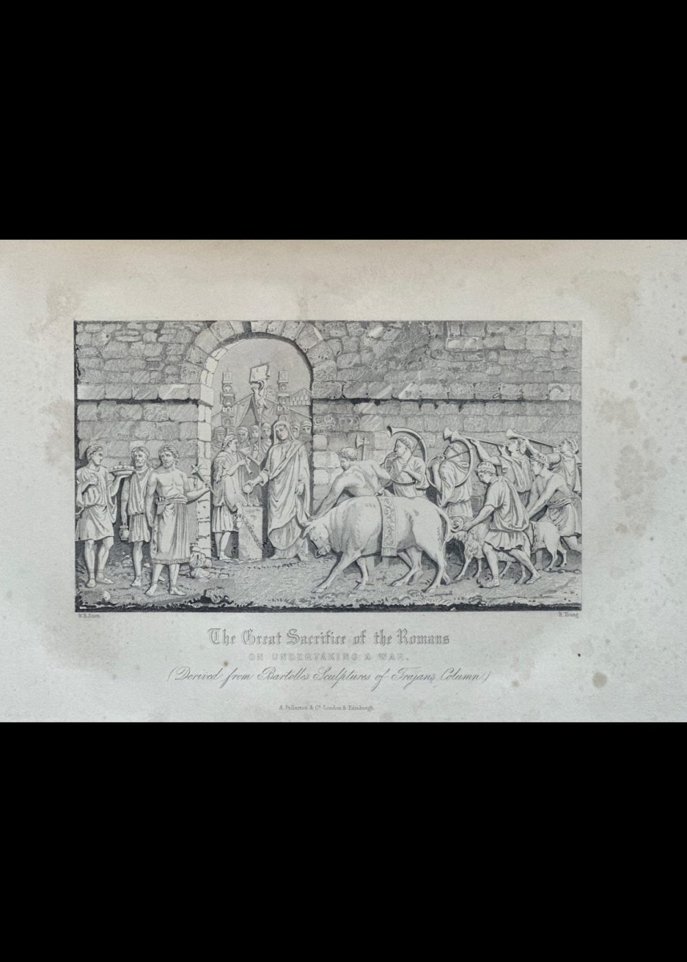 “THE FAITHS IN THE WORLD”. A dictionary of all religions and their religious sects. by The Rev. James Gardner. This engraving depicts a solemn Roman ritual performed before the commencement of war, as derived from Bartoli’s illustrations of Trajan’s Column. Central to the scene is a Roman priest pouring a libation, accompanied by attendants, soldiers, and sacrificial animals—symbolizing the empire’s appeal to the gods for victory. The figures are framed by a stone archway, with military standards visible behind, reinforcing the martial context. The composition powerfully reflects the Roman emphasis on divine favor and ritualistic duty in warfare.
