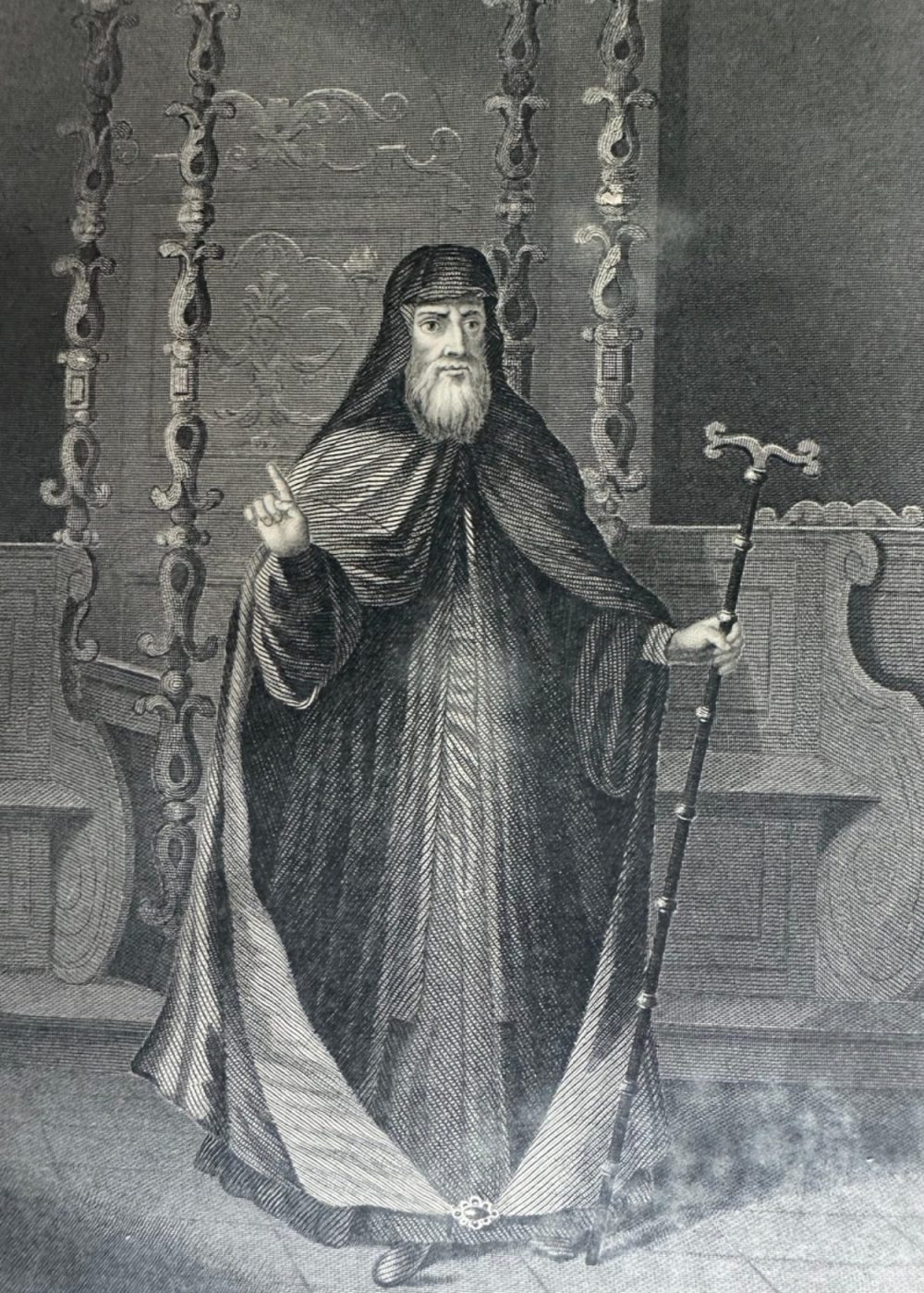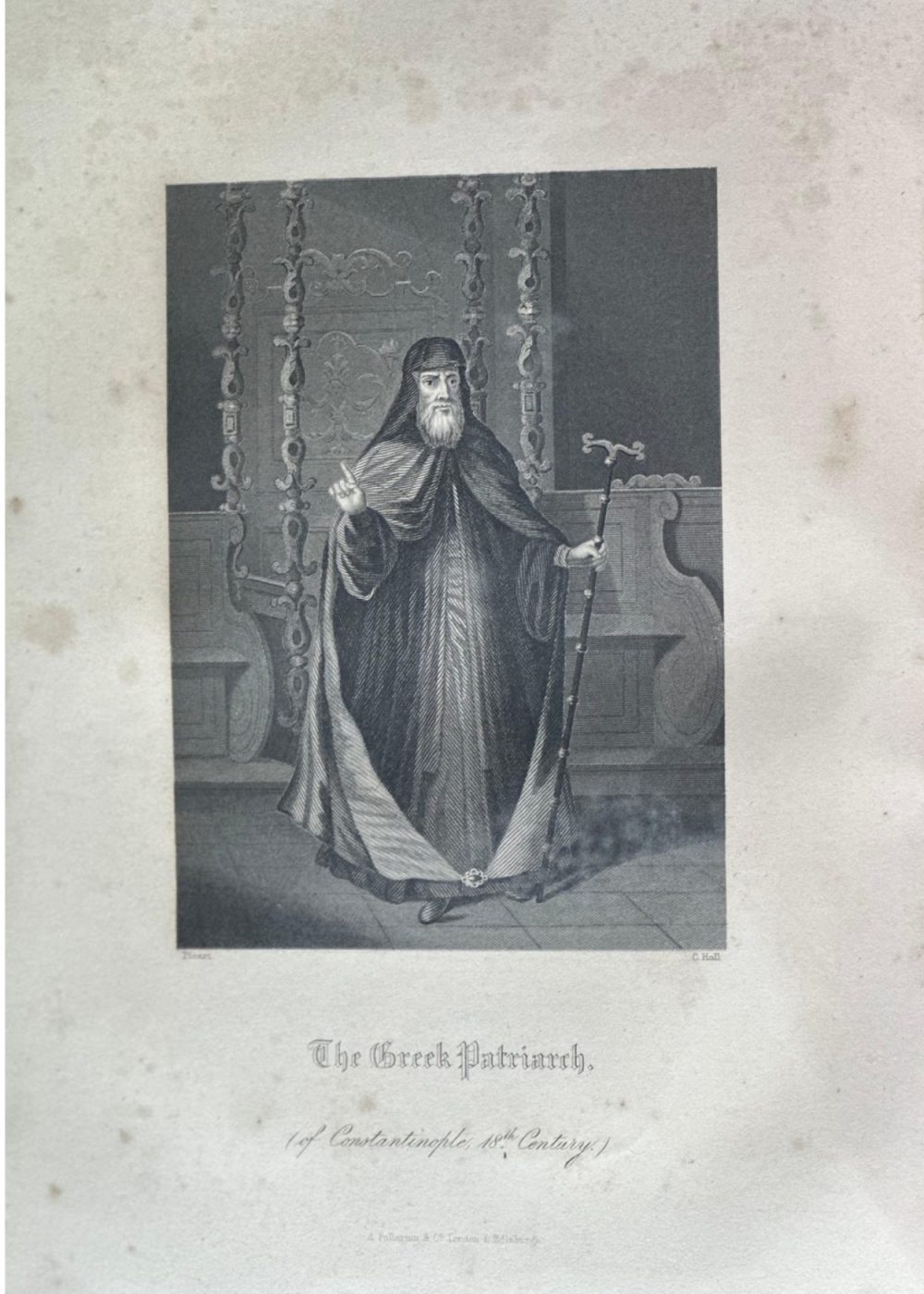 “THE FAITHS IN THE WORLD”. A dictionary of all religions and their religious sects. by The Rev. James Gardner. This engraving presents the Greek Orthodox Patriarch of Constantinople in full ecclesiastical attire, as seen in the 18th century. Clad in flowing robes and a traditional headdress, he holds a pastoral staff and raises his hand in a gesture of blessing or teaching. The ornate throne and detailed backdrop emphasize the Patriarch’s high religious standing and the ceremonial richness of the Eastern Orthodox Church. This portrait reflects both spiritual authority and the enduring legacy of the Byzantine ecclesiastical tradition in Constantinople.