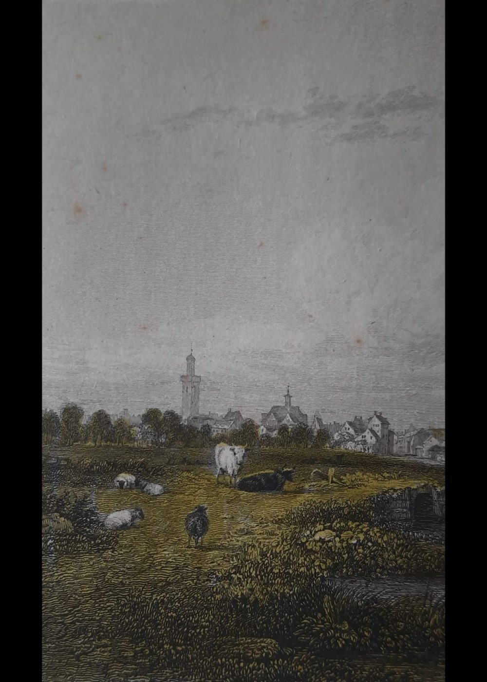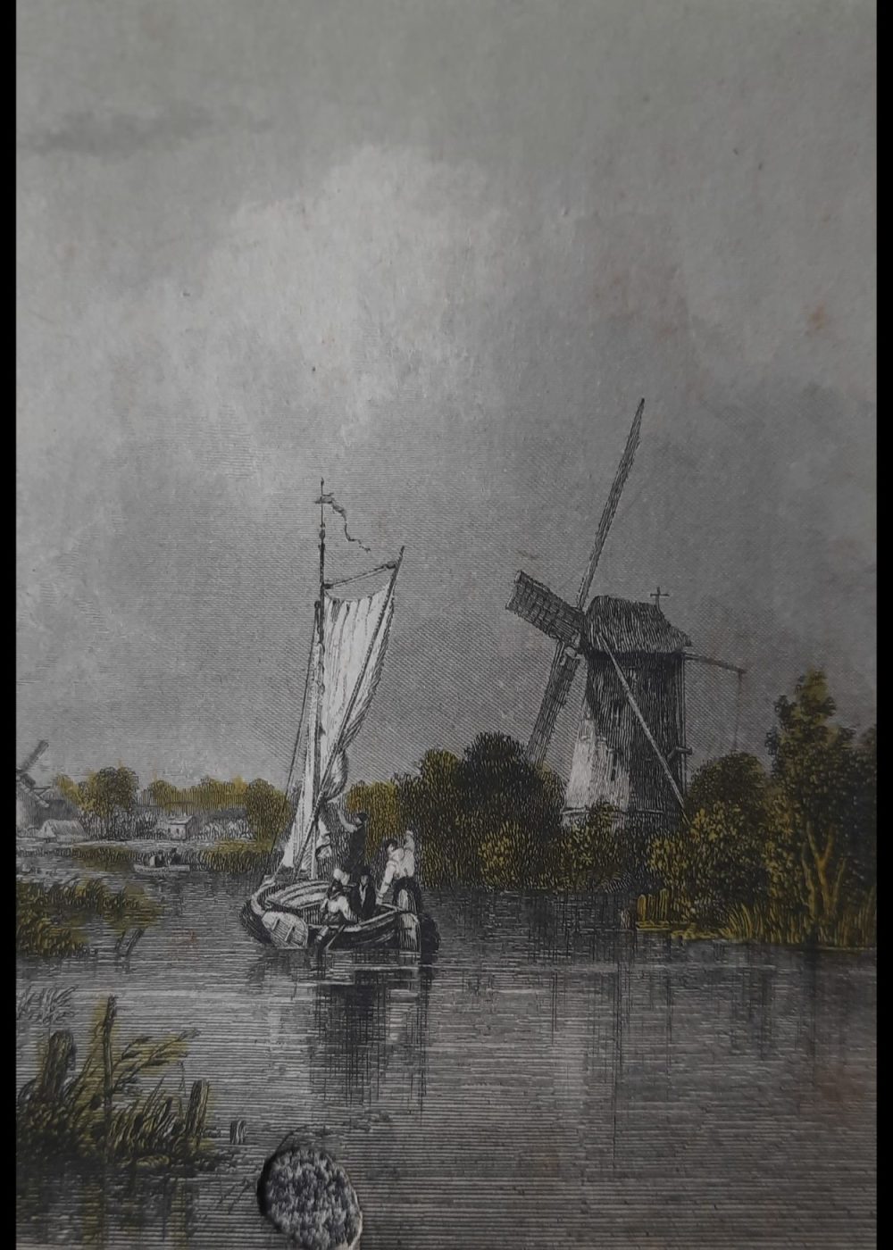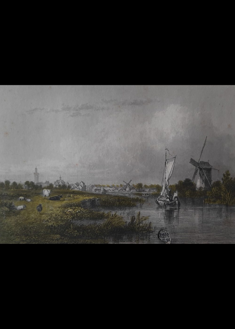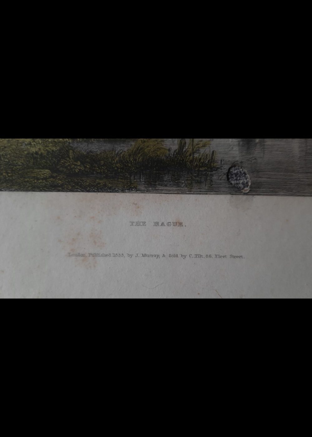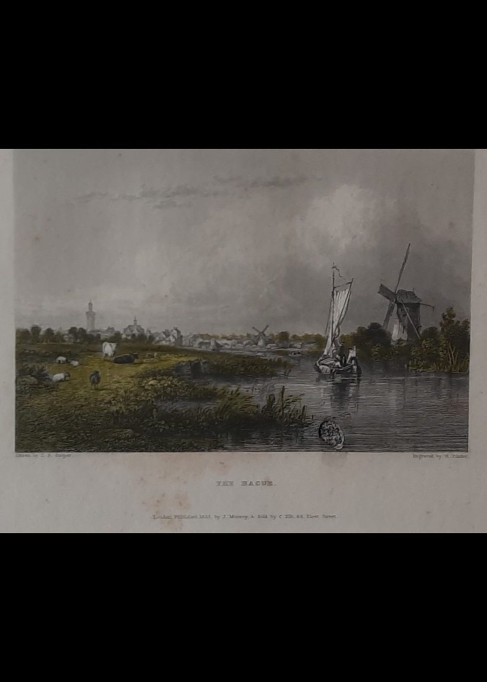 This is a 19th-century hand-colored engraving titled “The Hague”, drawn by J.B. Burger and engraved by T. Fisher. The scene captures a pastoral landscape near The Hague, Netherlands, with grazing cattle in the foreground, a sailboat on a calm river, and windmills nestled among trees on the right. In the background, the town’s spires and rooftops rise gently against a cloudy sky, conveying a serene and picturesque Dutch countryside. The print was published in 1843 by J. Murray & Son in London.