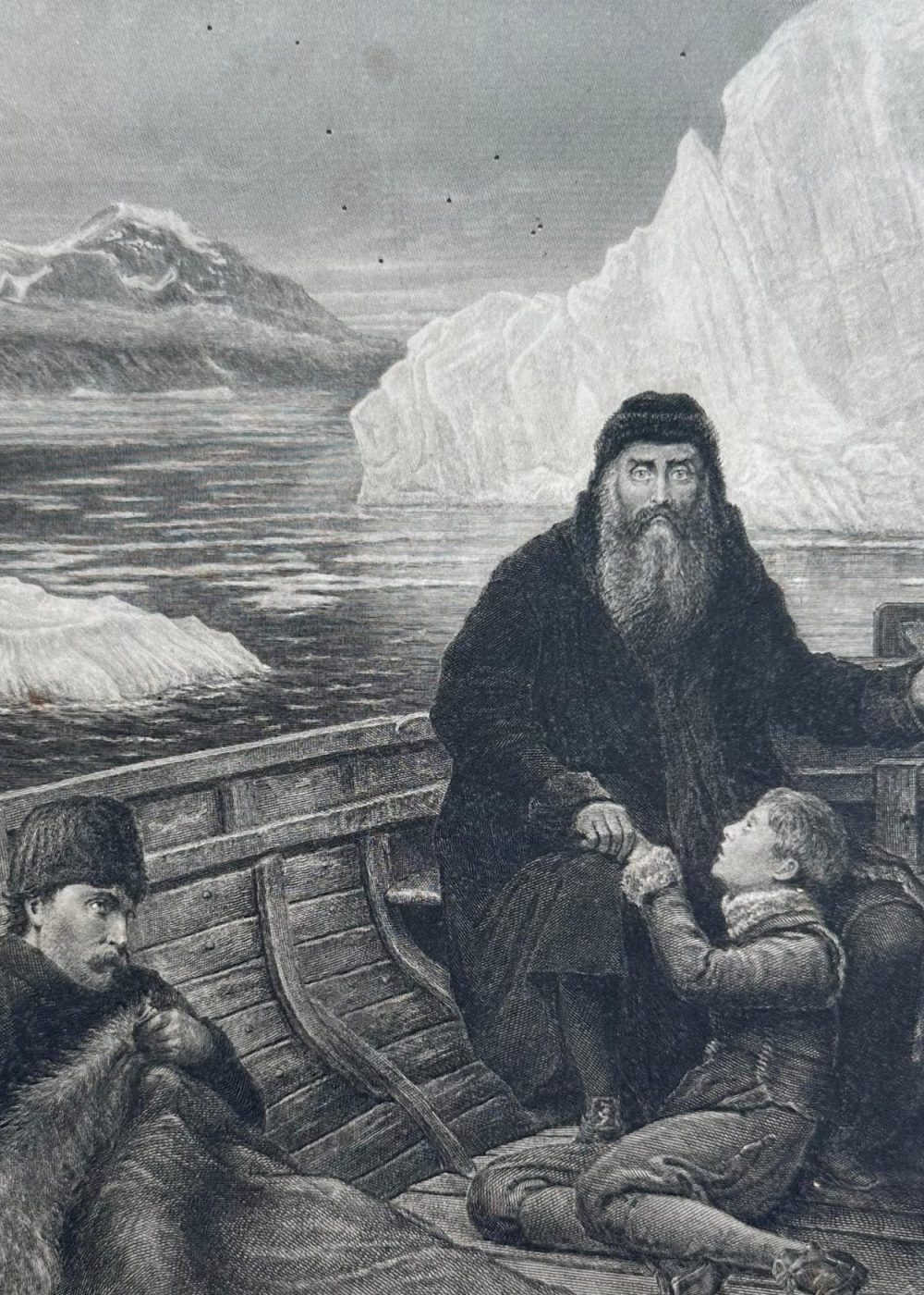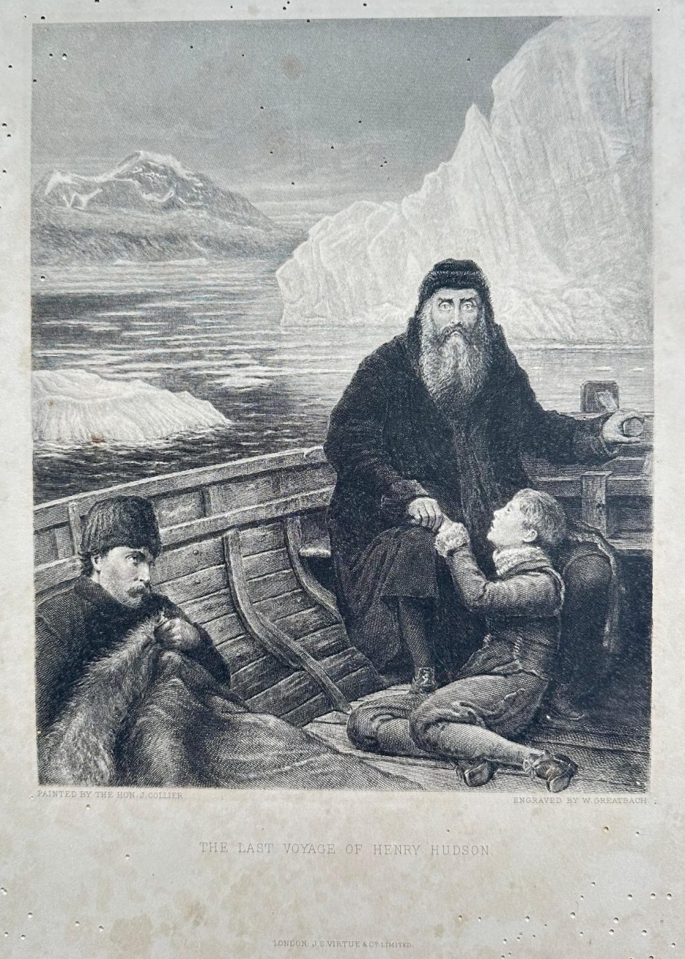 This evocative engraving titled “The Last Voyage of Henry Hudson” depicts the legendary English explorer abandoned during his final Arctic expedition. Set amidst icy waters and towering glaciers, the scene shows Hudson seated in a small open boat, draped in furs, with a solemn, steadfast gaze. A young boy, often interpreted as his son, clutches his hand while another crewman sits pensively, clutching a fur wrap for warmth. The stark isolation conveys the dramatic moment of mutiny and abandonment in Hudson Bay (1611). The painting was created by The Hon. J. Collier and engraved by W. Greatbach, published by J. S. Virtue & Co. Limited, London.